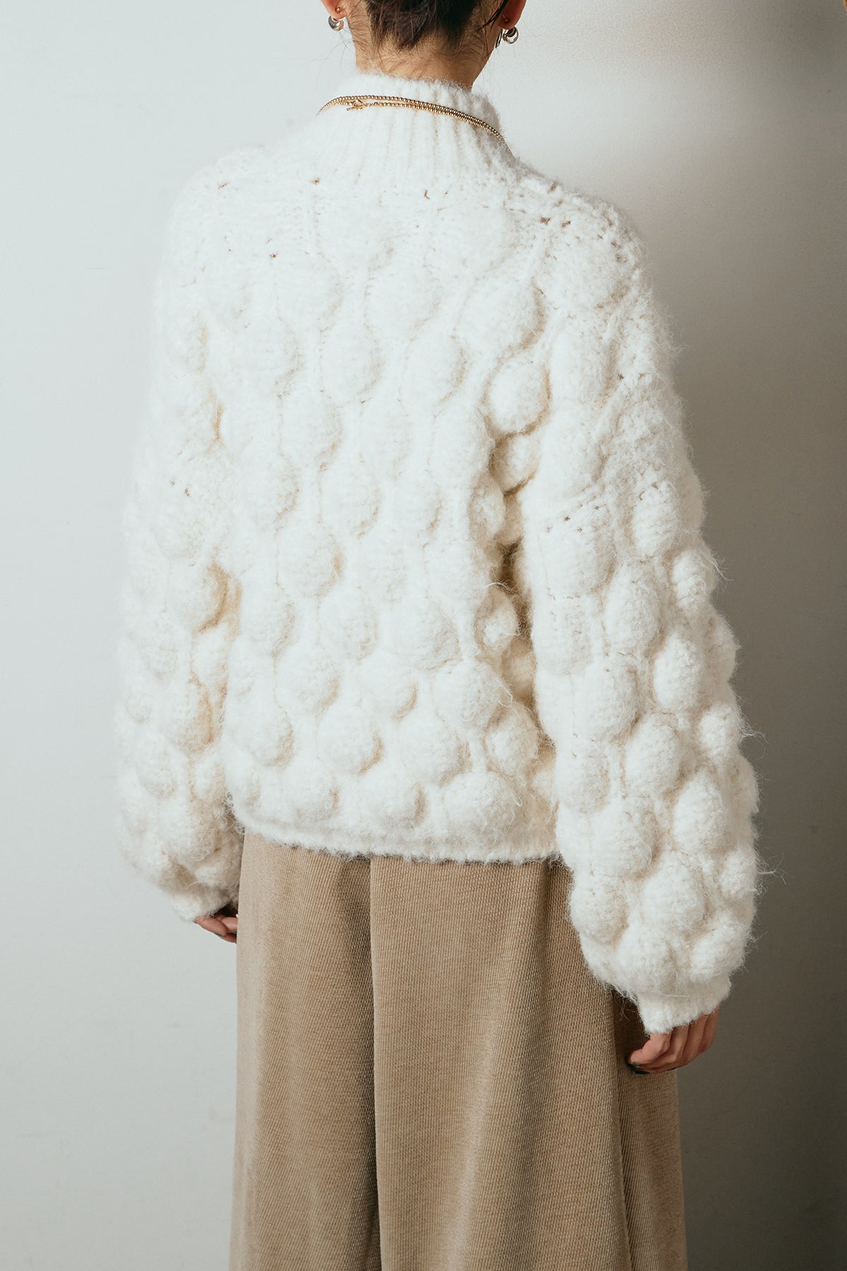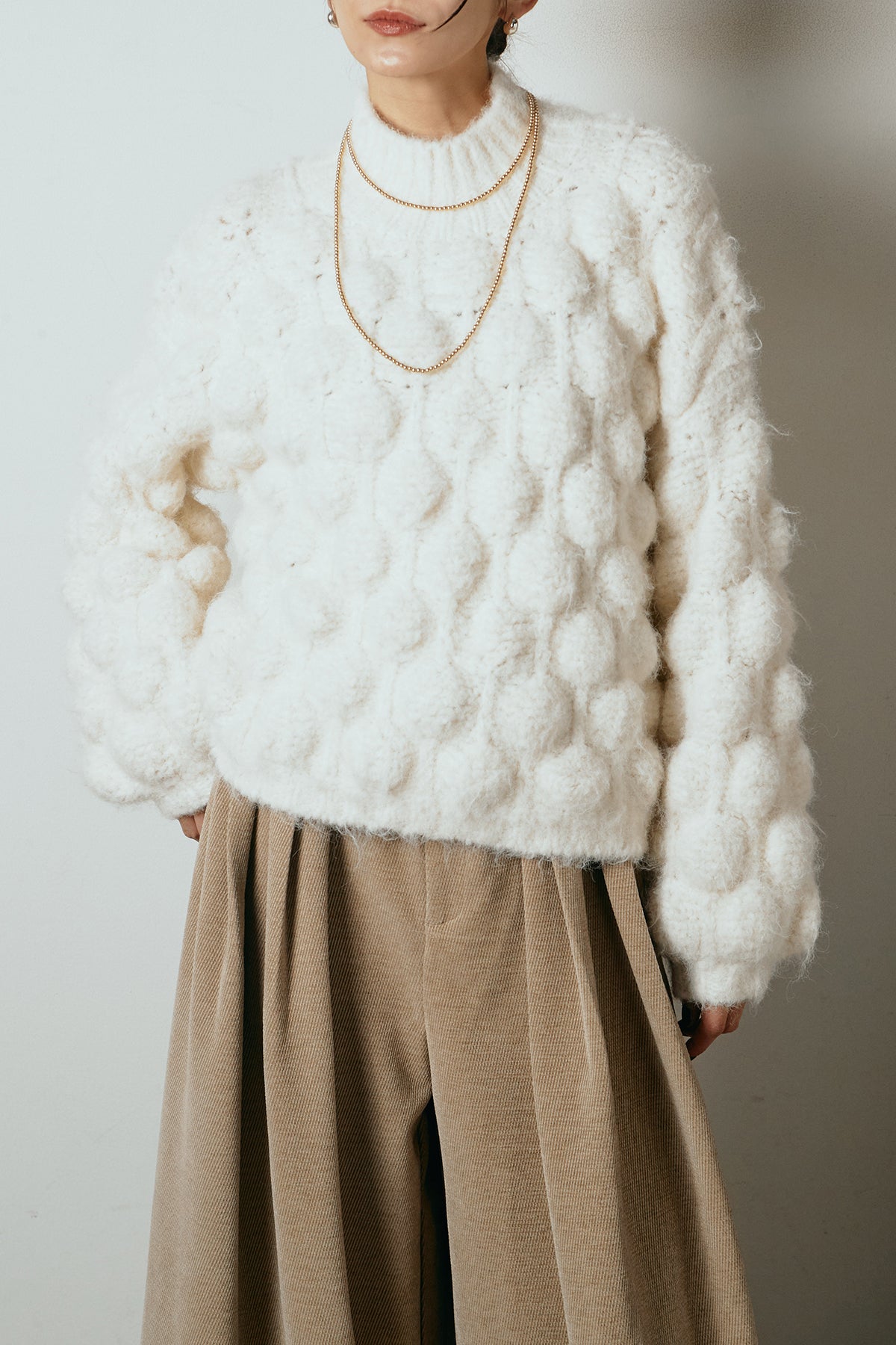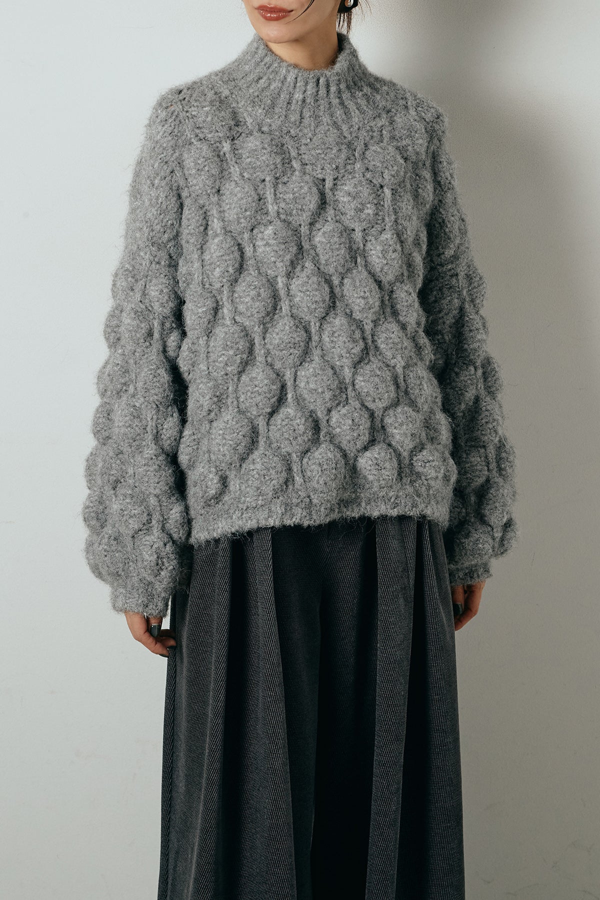 立体感のあるポップコーン編みが目を引く、存在感たっぷりのニットトップス。ふんわりとしたボリューム感がスタイリングに奥行きを与え、シンプルなボトムを合わせるだけで印象的な着こなしに仕上がります。程よく詰まったネックラインとゆとりのあるシルエットで、リラックス感がありながらも大人らしいバランスに。秋冬のコーディネートの主役として活躍する一枚です。