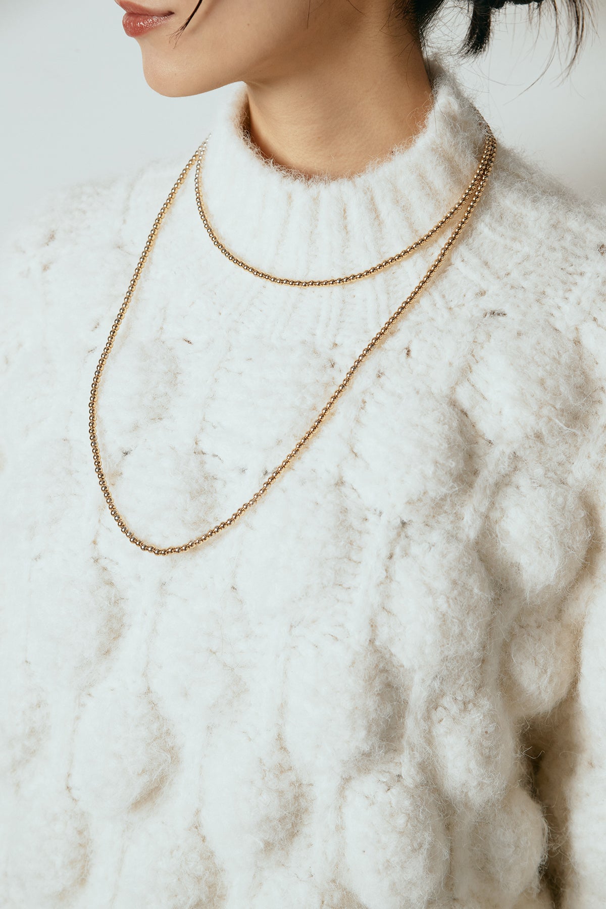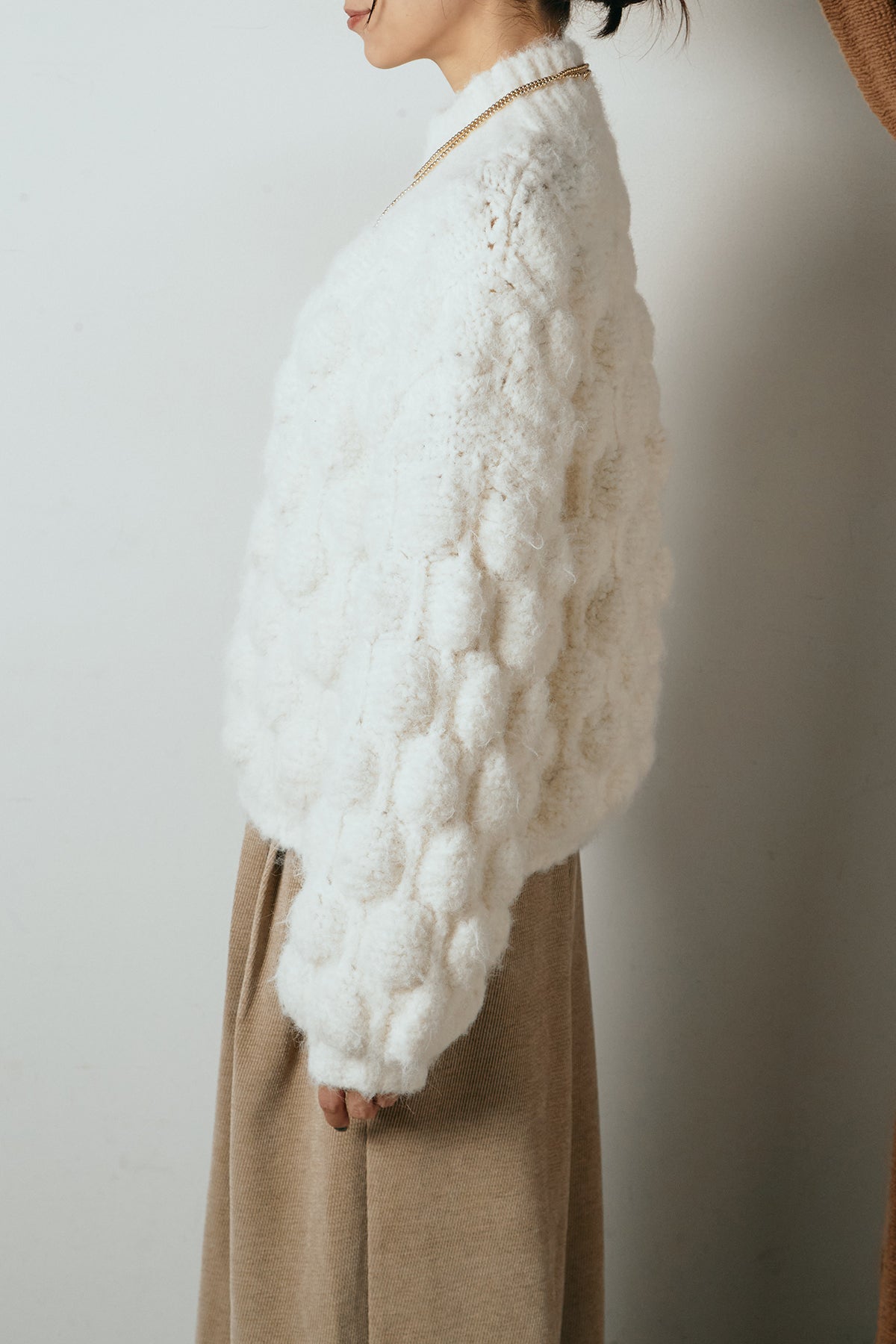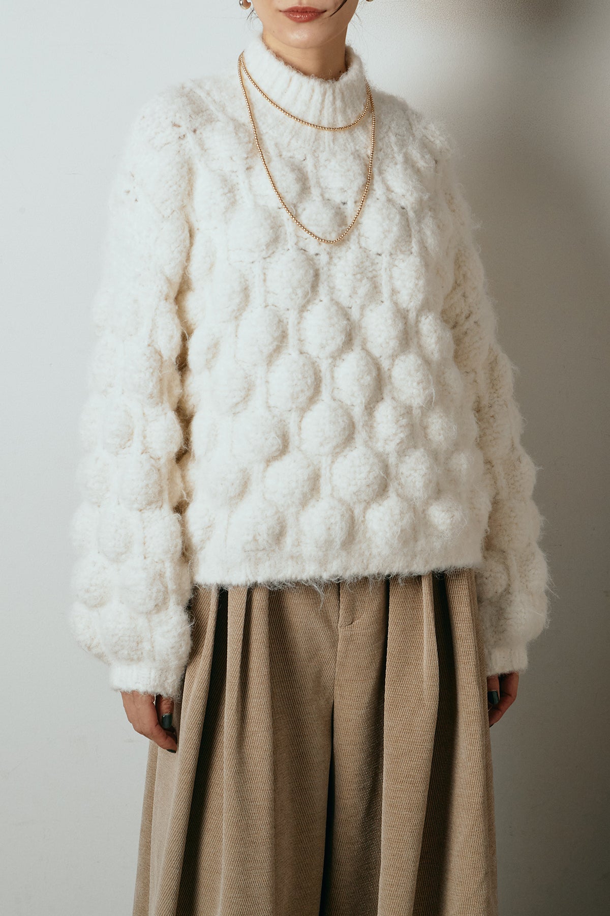 立体感のあるポップコーン編みが目を引く、存在感たっぷりのニットトップス。ふんわりとしたボリューム感がスタイリングに奥行きを与え、シンプルなボトムを合わせるだけで印象的な着こなしに仕上がります。程よく詰まったネックラインとゆとりのあるシルエットで、リラックス感がありながらも大人らしいバランスに。秋冬のコーディネートの主役として活躍する一枚です。