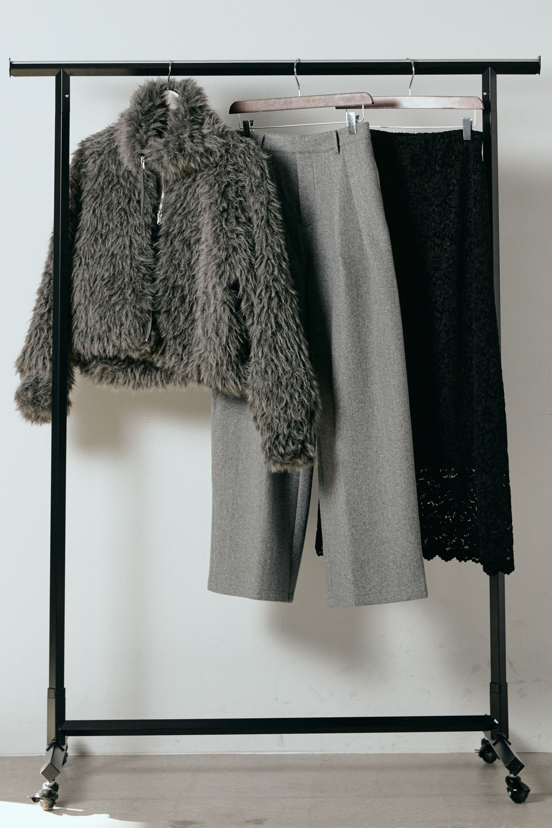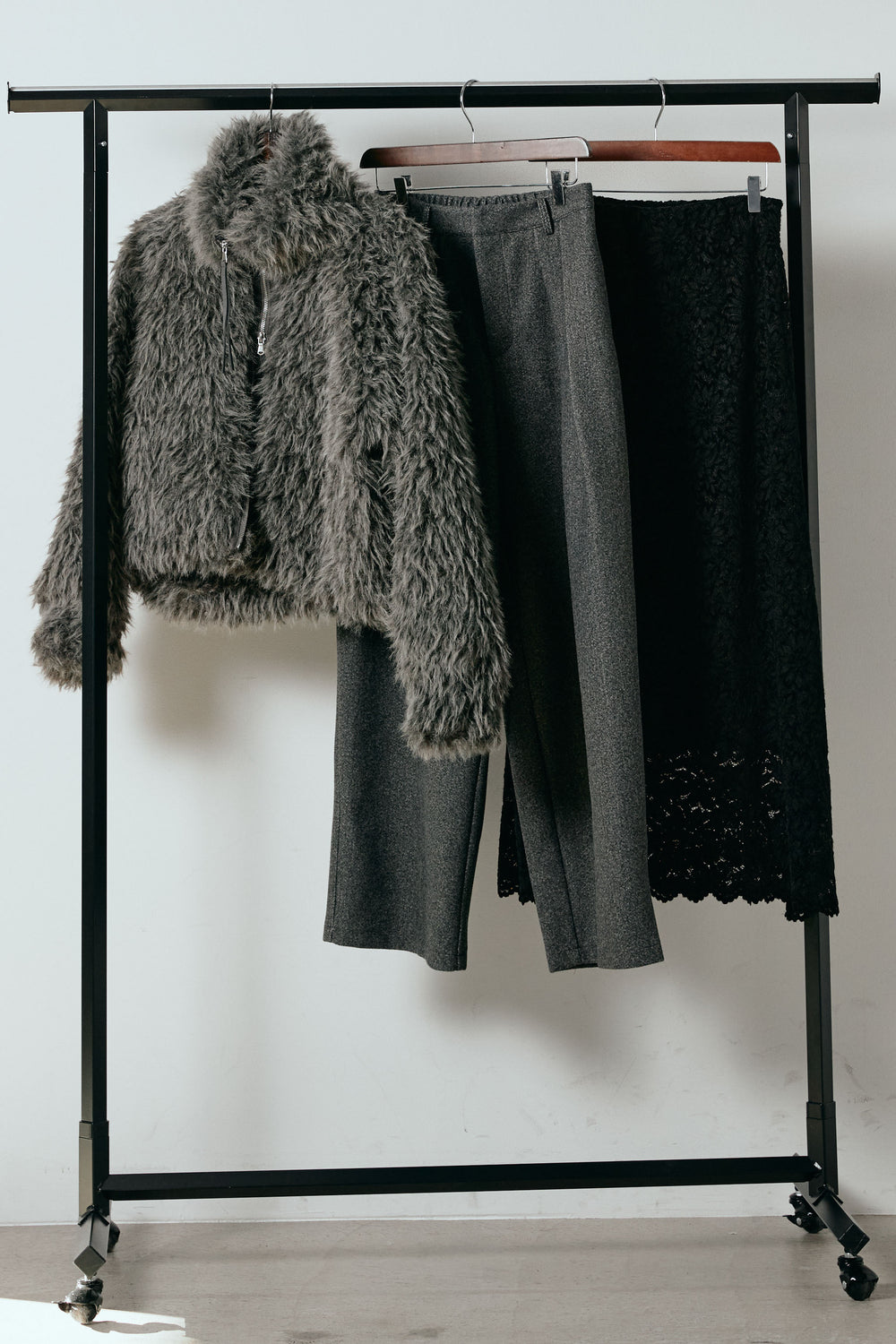 【着回しセット】[SET]ミックスシープファースタンドブルゾン+花柄刺繍ベロアフレアスカート+フェイクウールタックトラウザーズパンツ(3set)