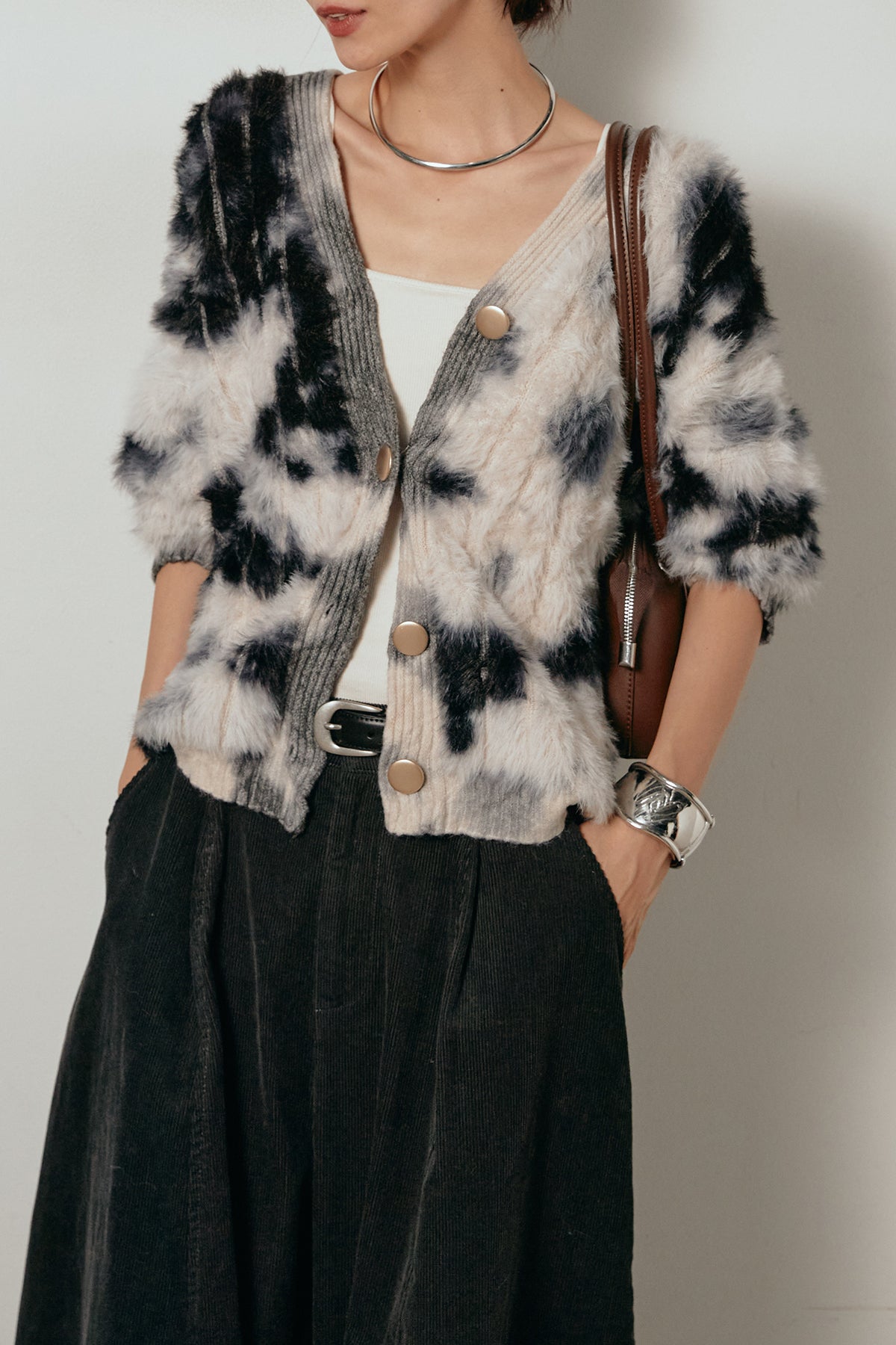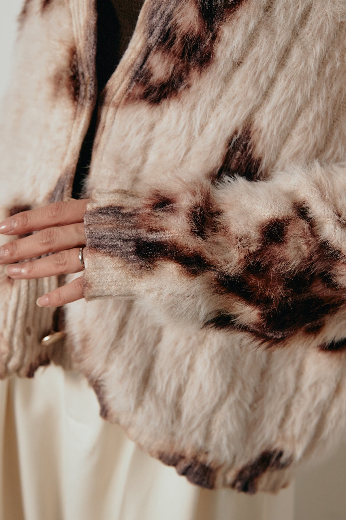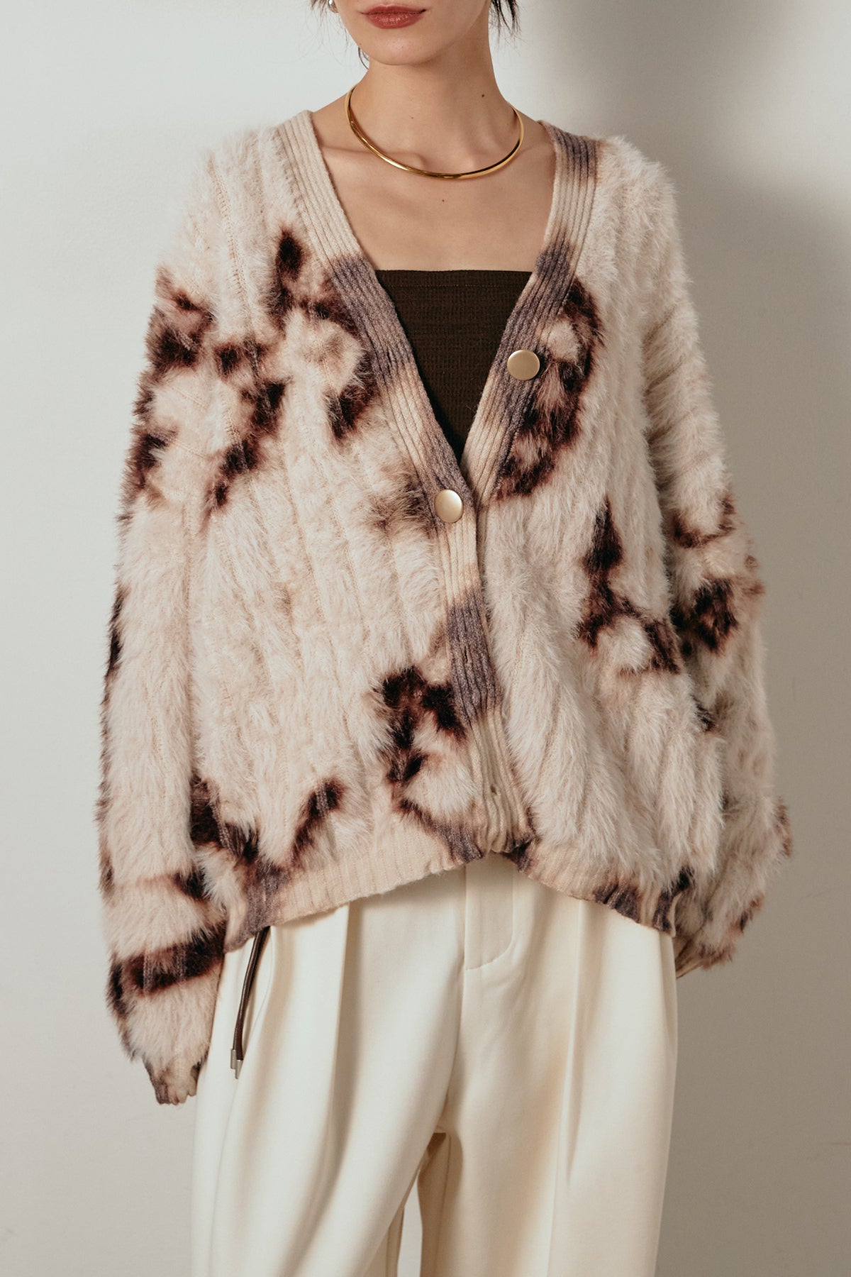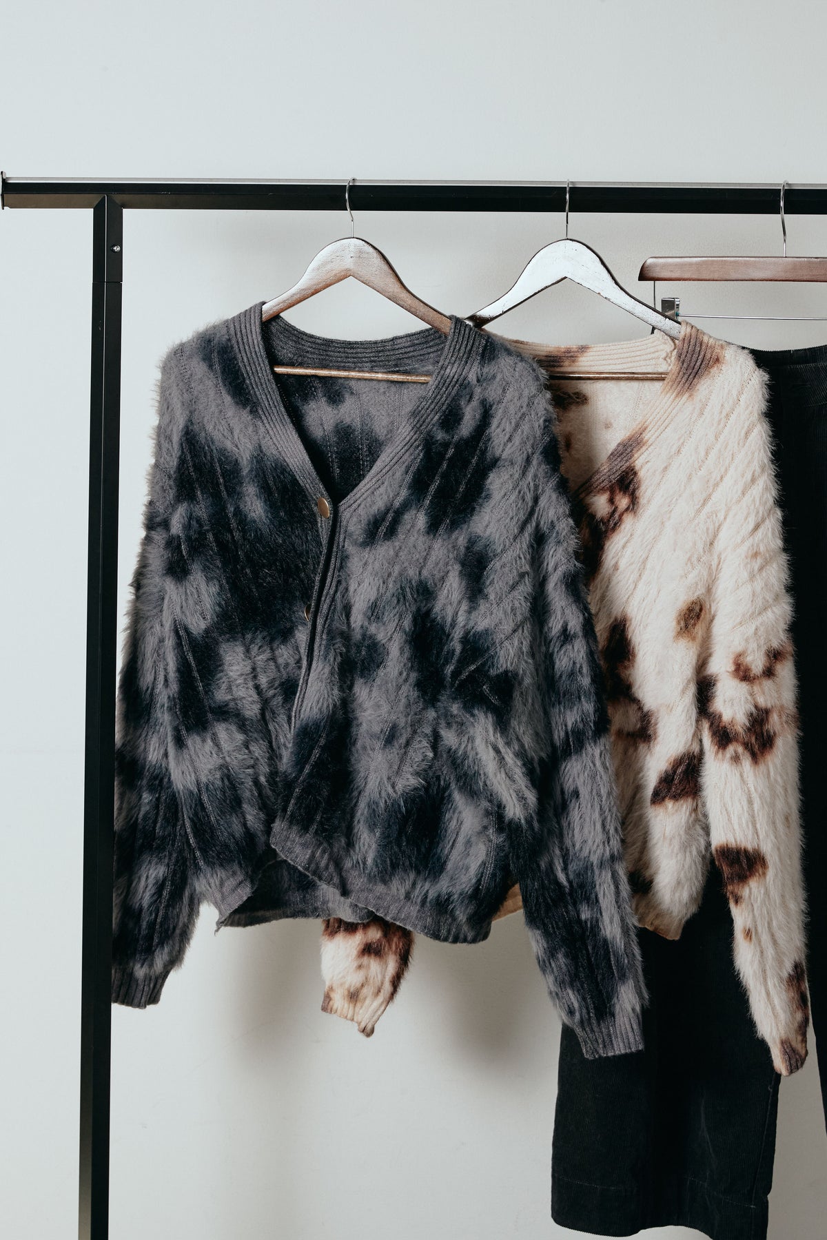 ふんわりとしたシャギー素材にタイダイ柄を落とし込んだニットカーディガン。優しい毛足の表情があたたかみを引き立て、存在感のある柄がスタイリングのアクセントに。ゆるやかなシルエットで抜け感があり、羽織るだけでこなれた雰囲気に仕上がります。デニムやスラックスとも相性が良く、幅広いシーンで活躍するアイテムです。