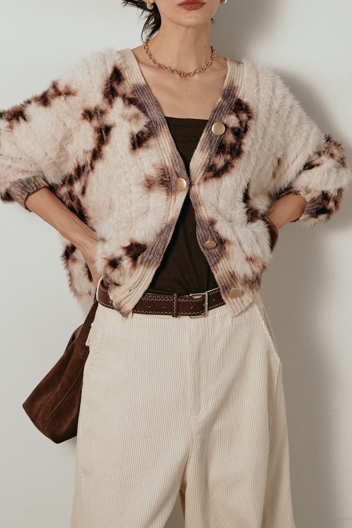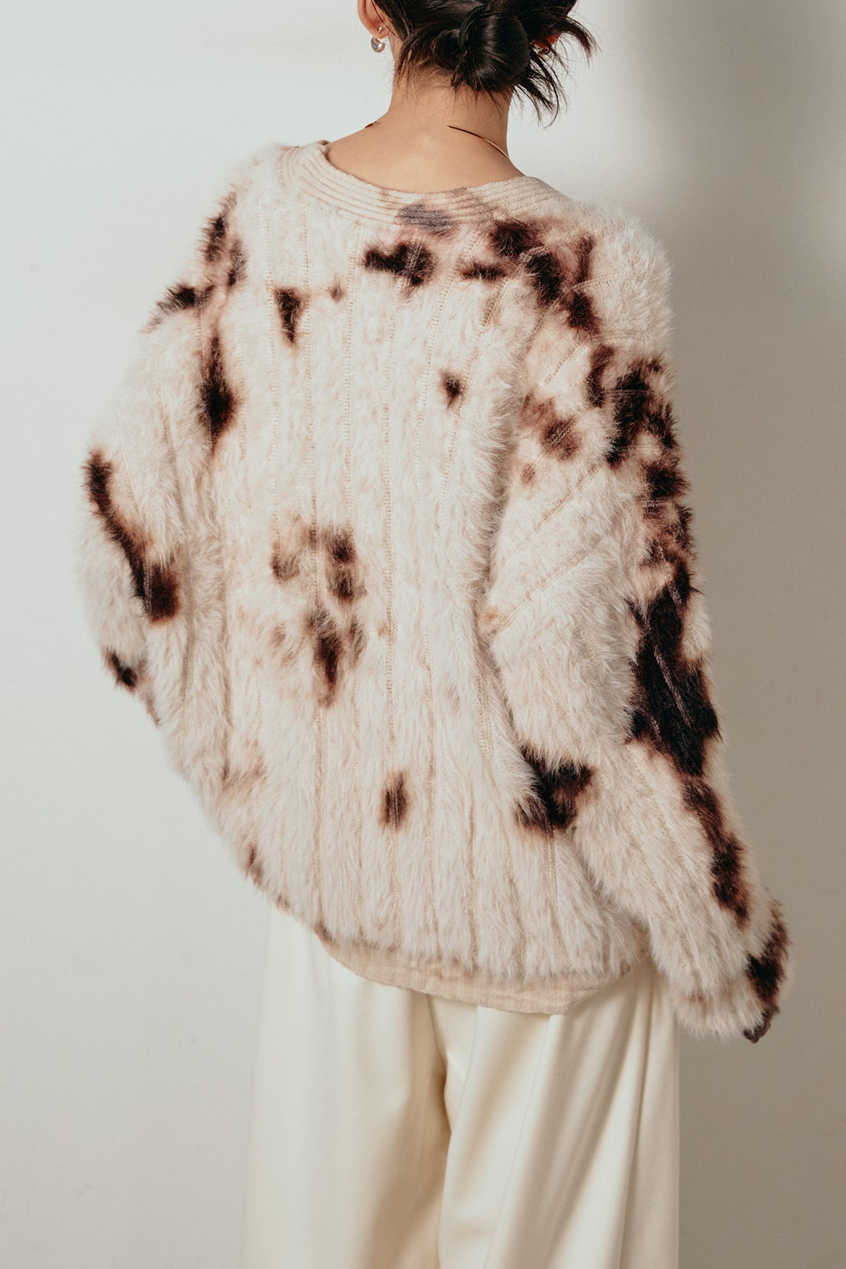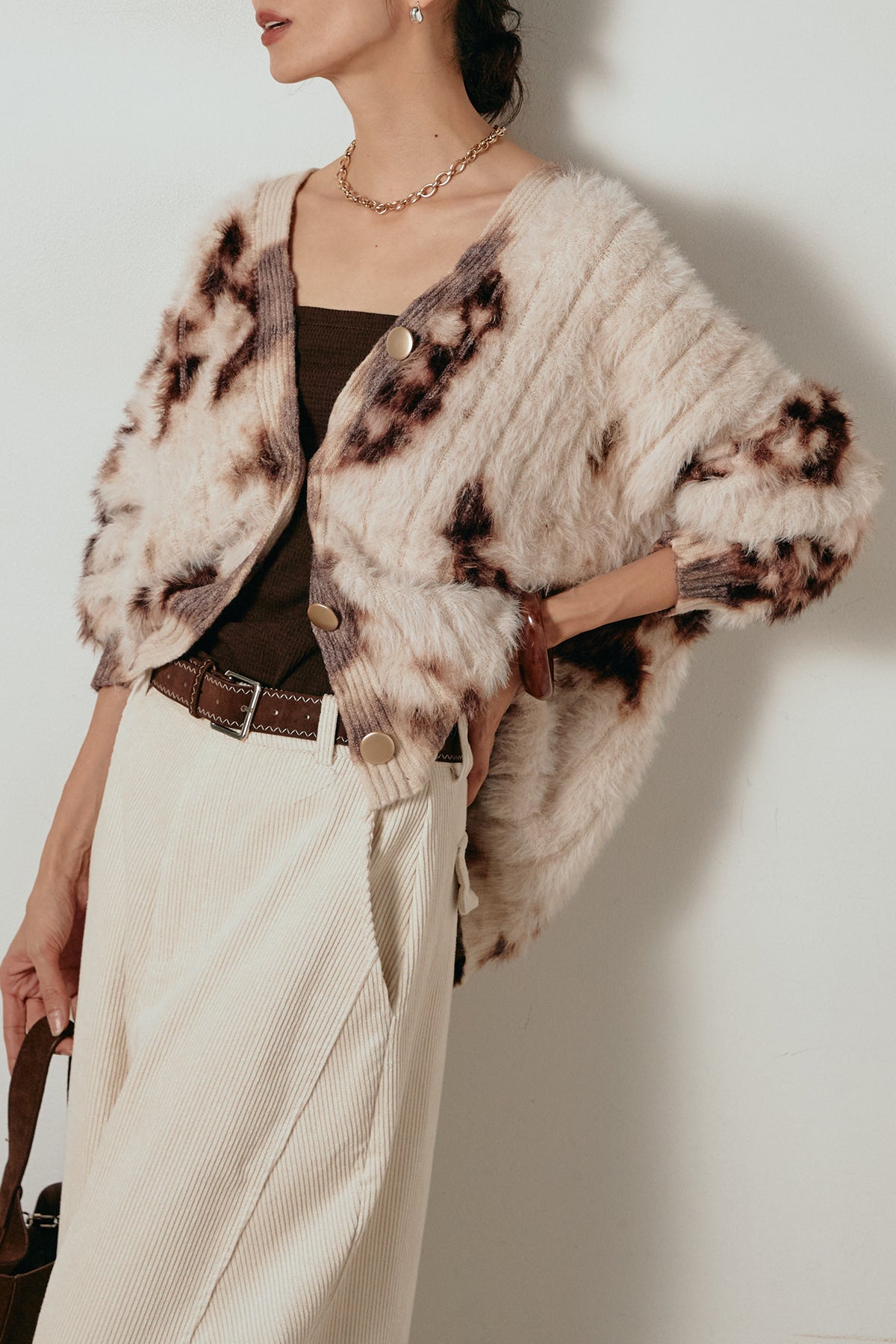 ふんわりとしたシャギー素材にタイダイ柄を落とし込んだニットカーディガン。優しい毛足の表情があたたかみを引き立て、存在感のある柄がスタイリングのアクセントに。ゆるやかなシルエットで抜け感があり、羽織るだけでこなれた雰囲気に仕上がります。デニムやスラックスとも相性が良く、幅広いシーンで活躍するアイテムです。