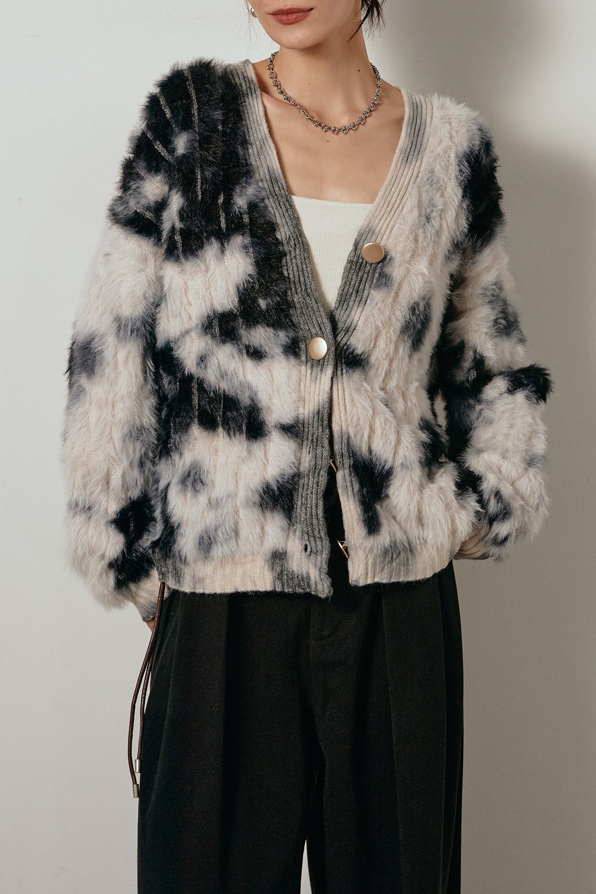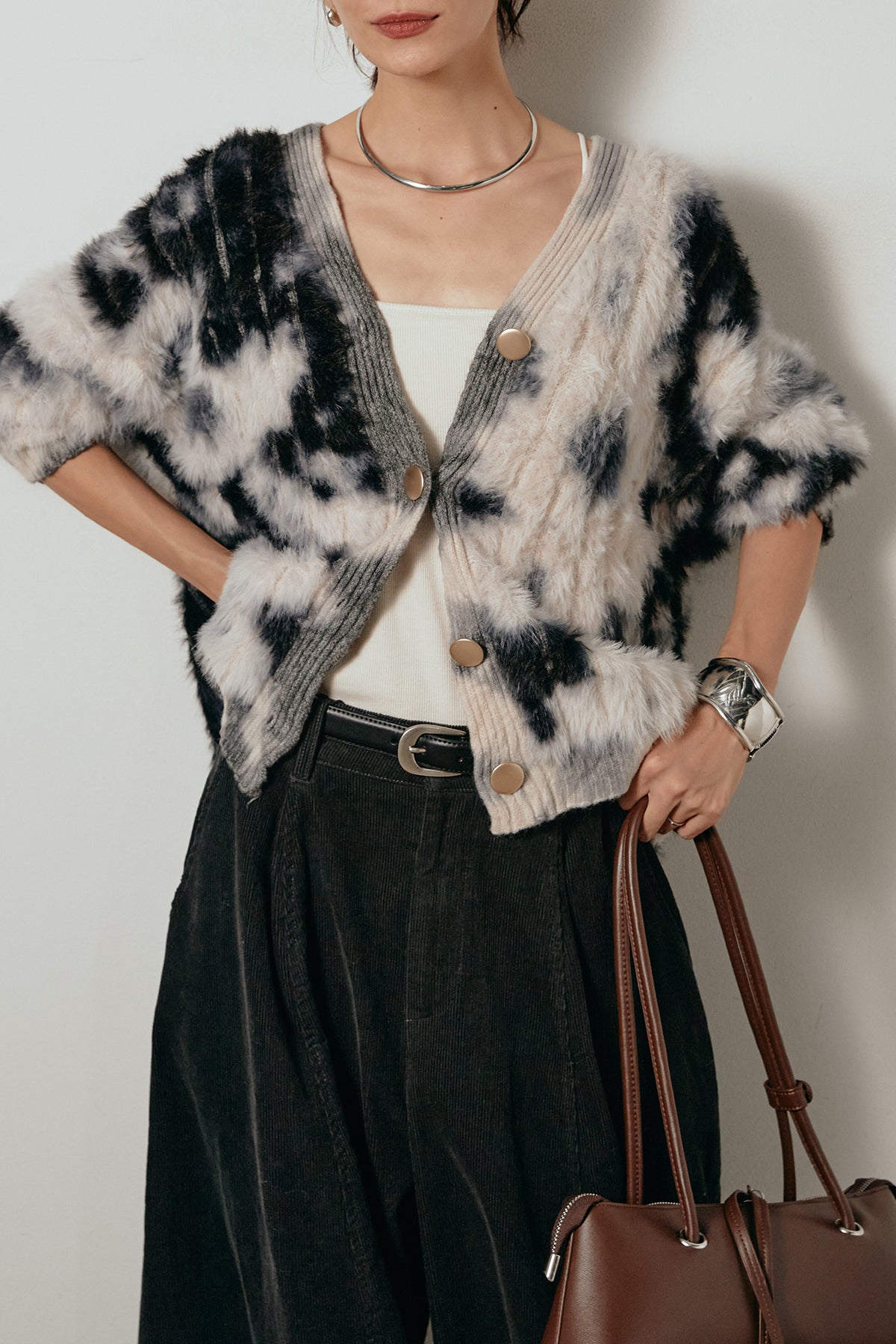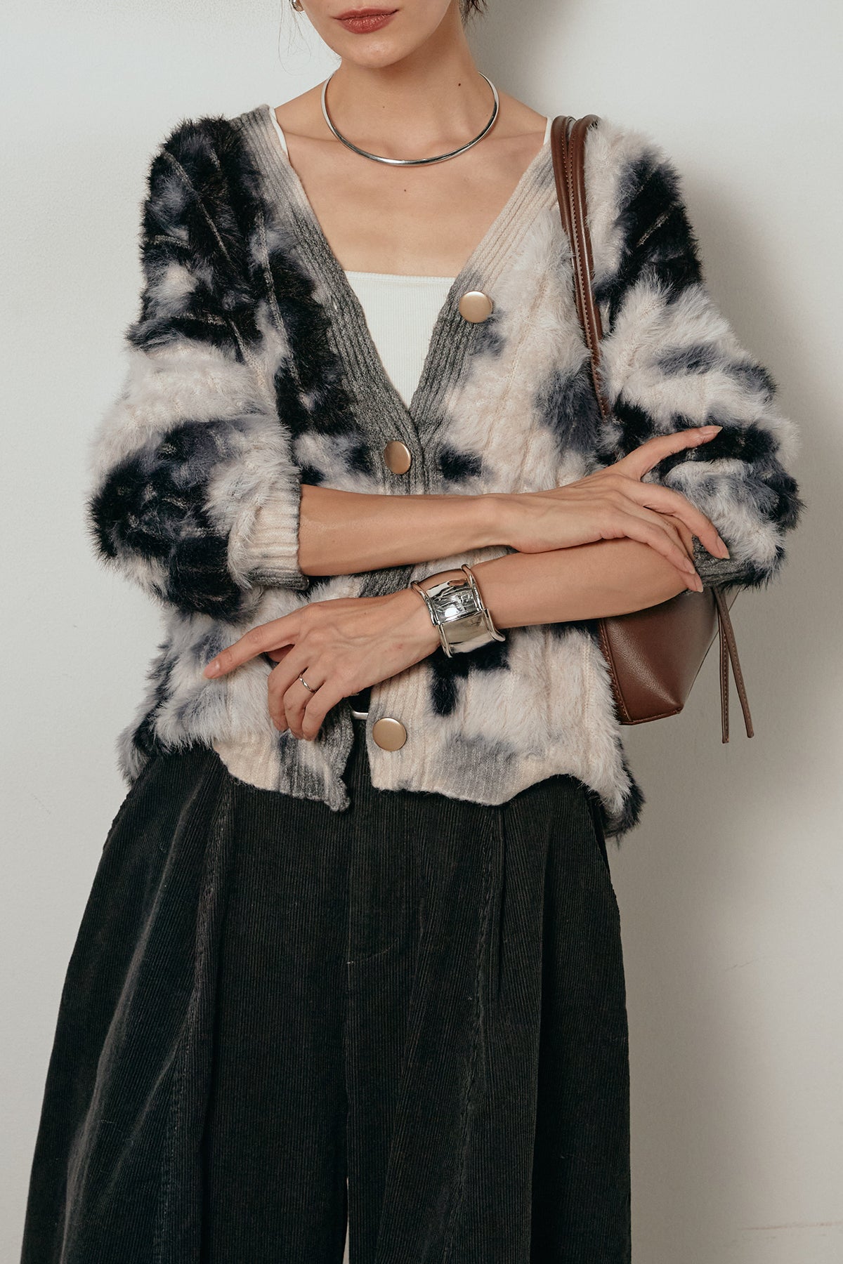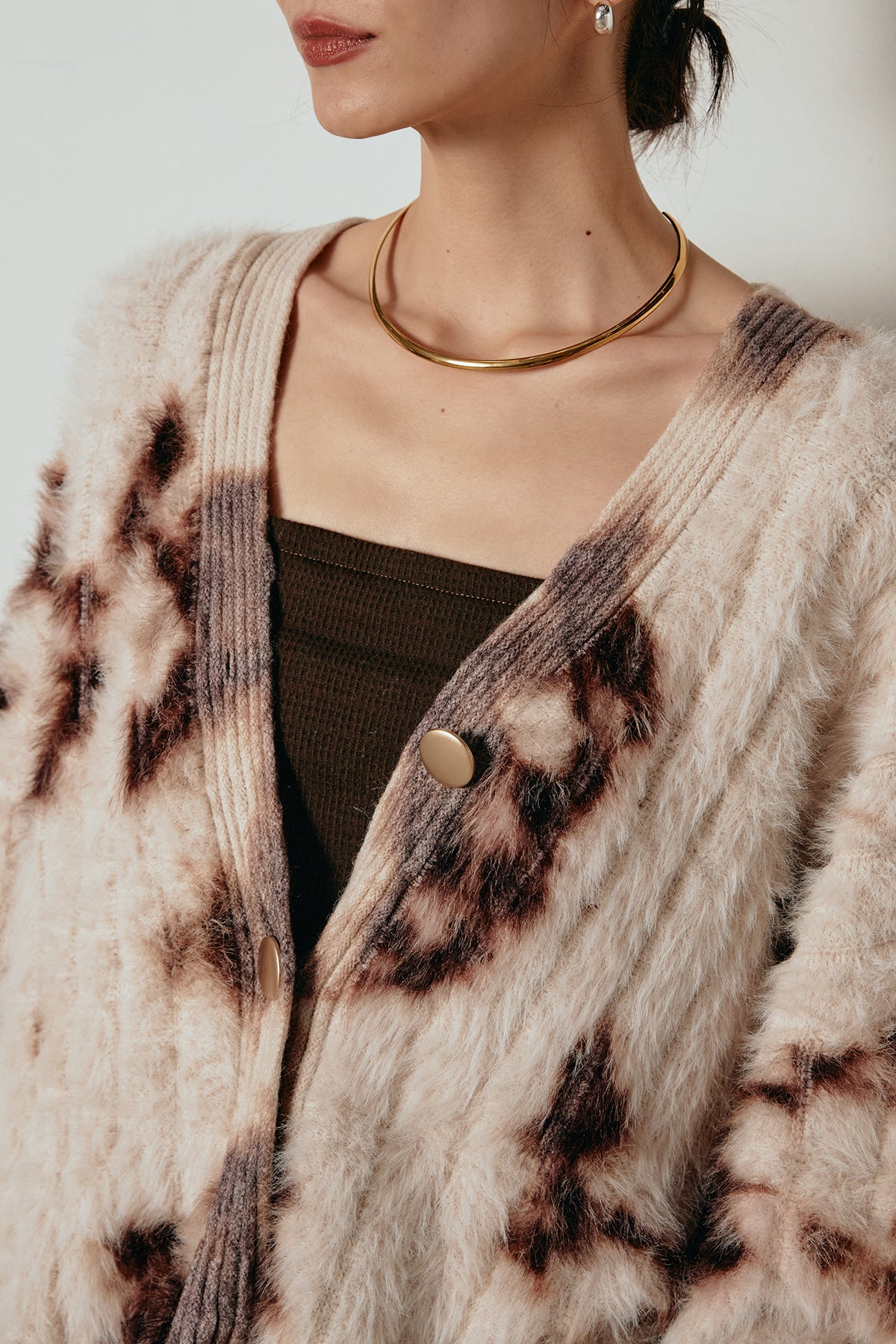 ふんわりとしたシャギー素材にタイダイ柄を落とし込んだニットカーディガン。優しい毛足の表情があたたかみを引き立て、存在感のある柄がスタイリングのアクセントに。ゆるやかなシルエットで抜け感があり、羽織るだけでこなれた雰囲気に仕上がります。デニムやスラックスとも相性が良く、幅広いシーンで活躍するアイテムです。