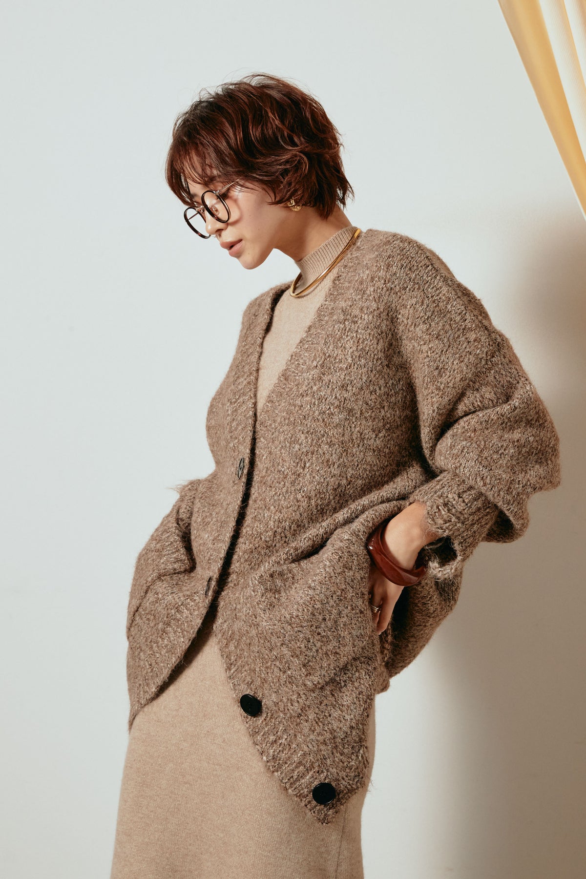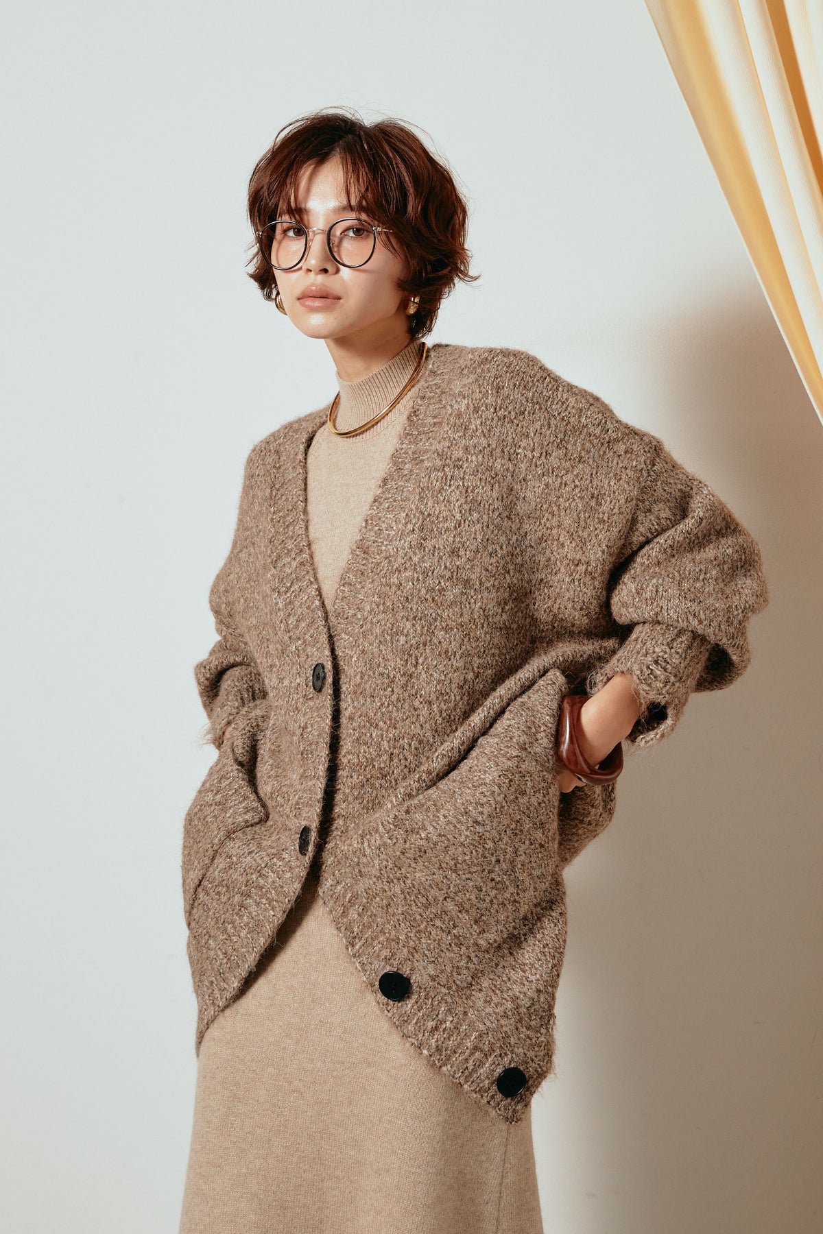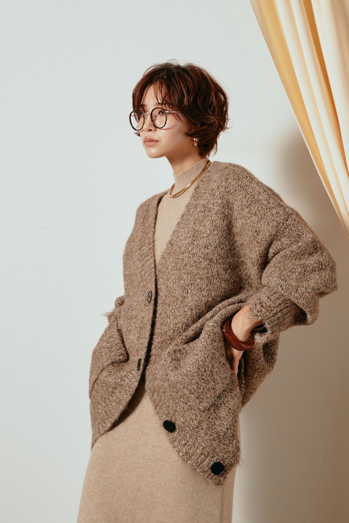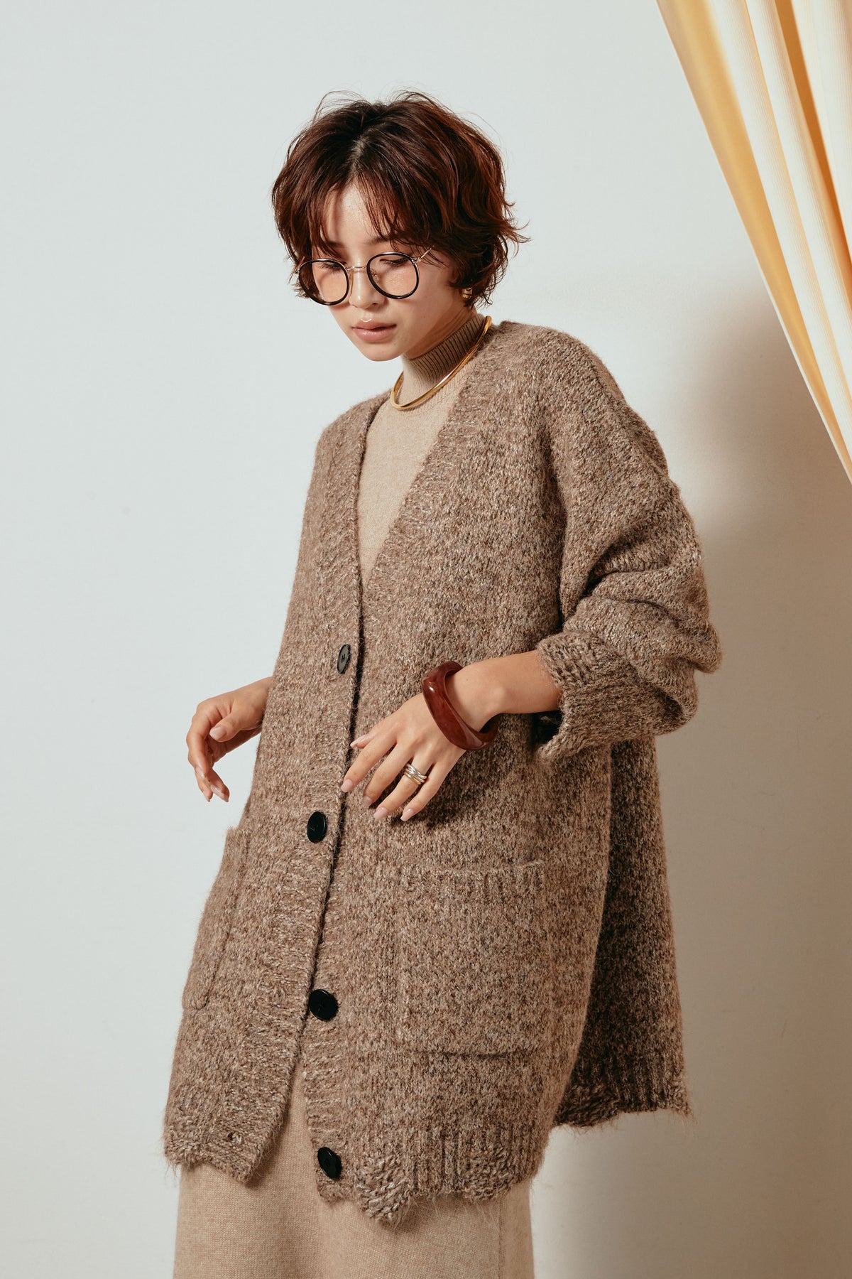 異なる糸をミックスした表情豊かなVネックカーディガン。 程よくゆとりのあるシルエットが抜け感を演出し、羽織るだけでこなれた印象に。 シャツやタートルをレイヤードしてもバランスよくまとまり、季節の変わり目にも重宝する一枚です。