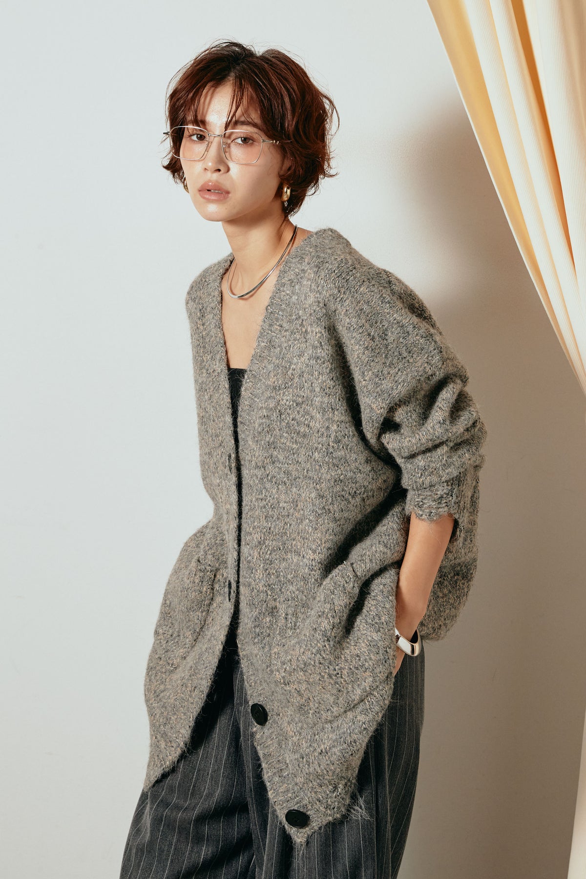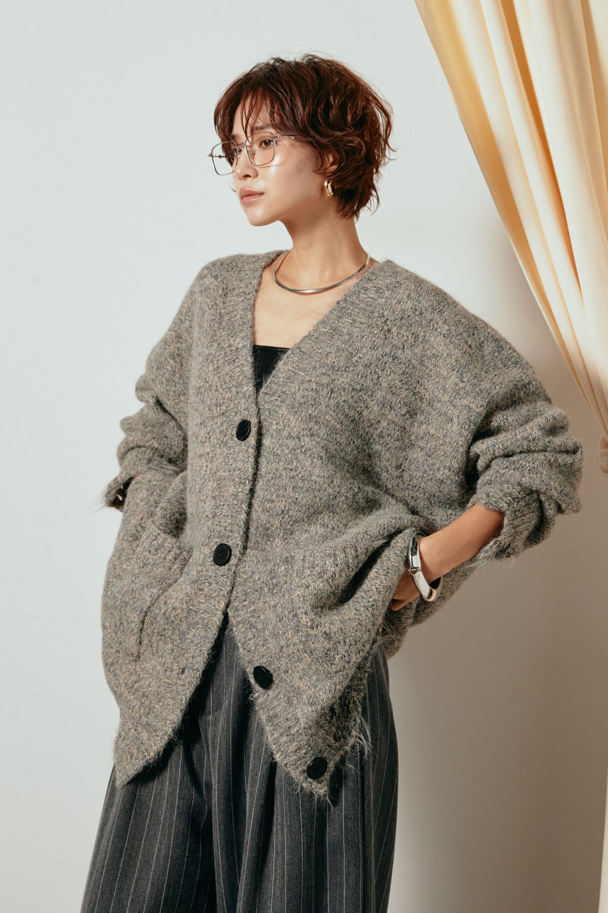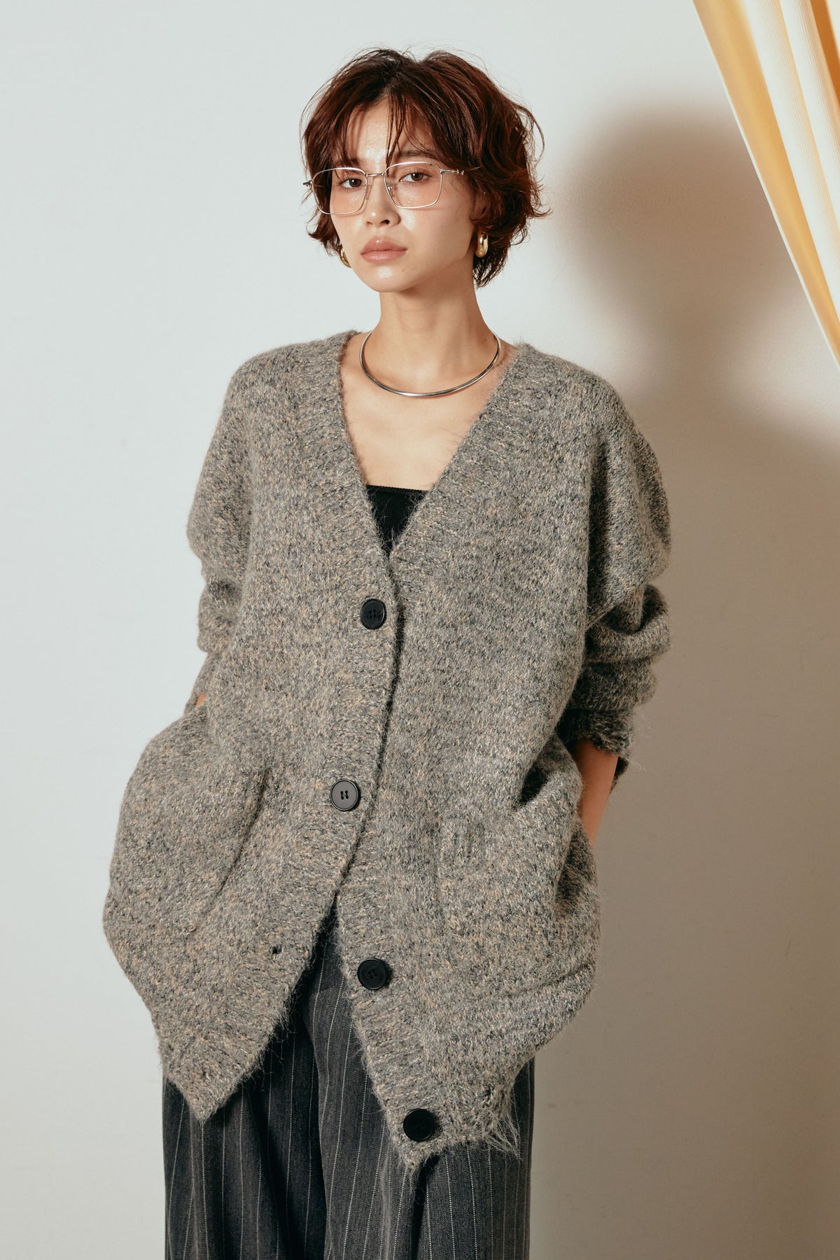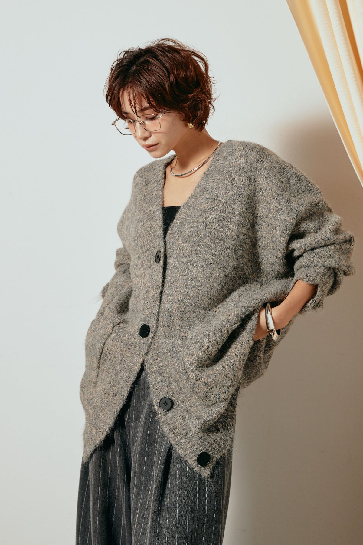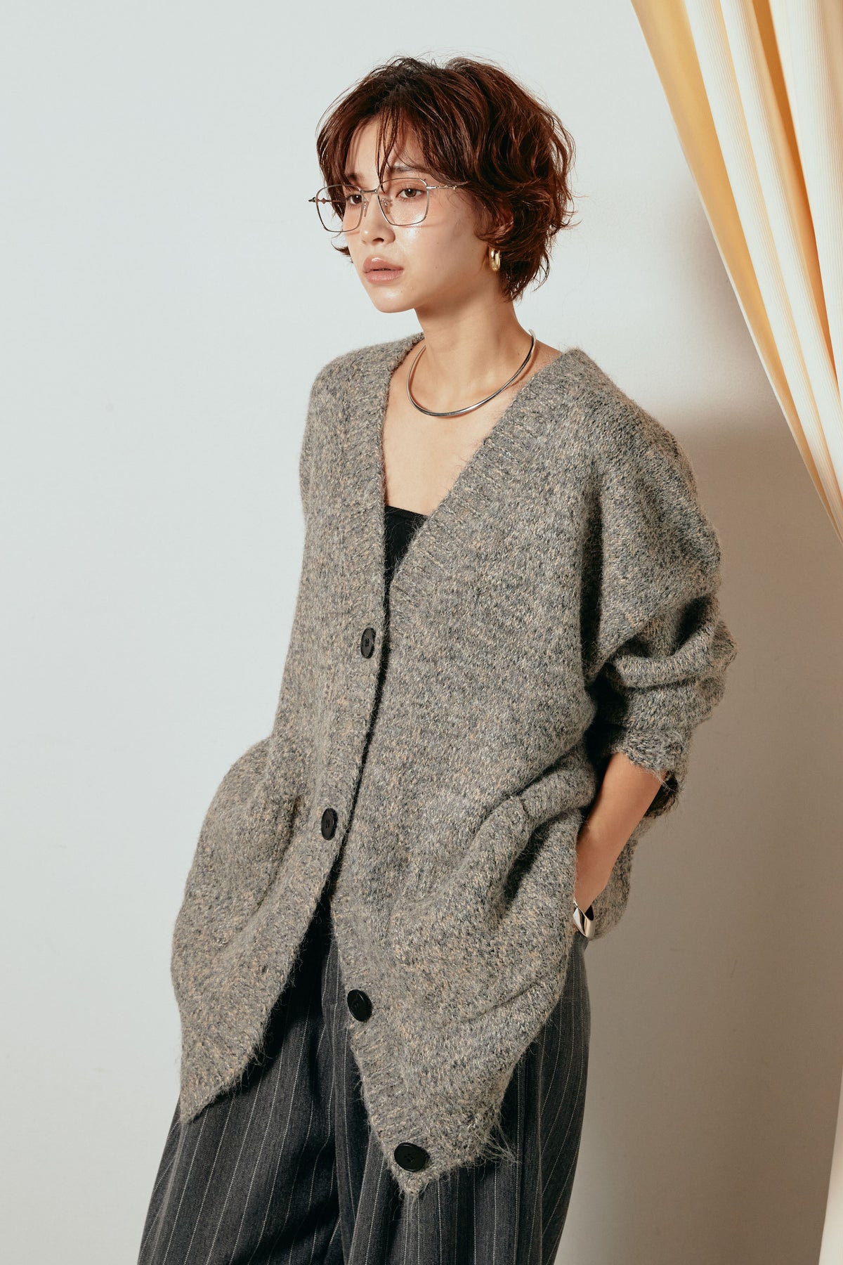 異なる糸をミックスした表情豊かなVネックカーディガン。 程よくゆとりのあるシルエットが抜け感を演出し、羽織るだけでこなれた印象に。 シャツやタートルをレイヤードしてもバランスよくまとまり、季節の変わり目にも重宝する一枚です。
