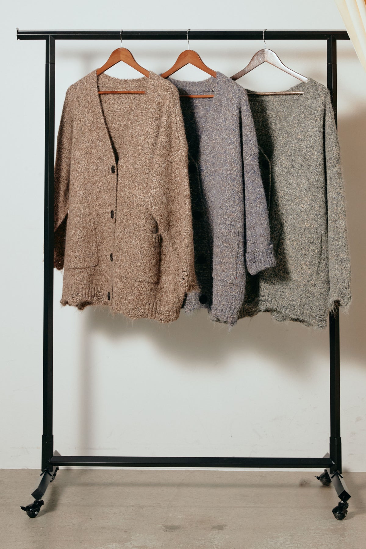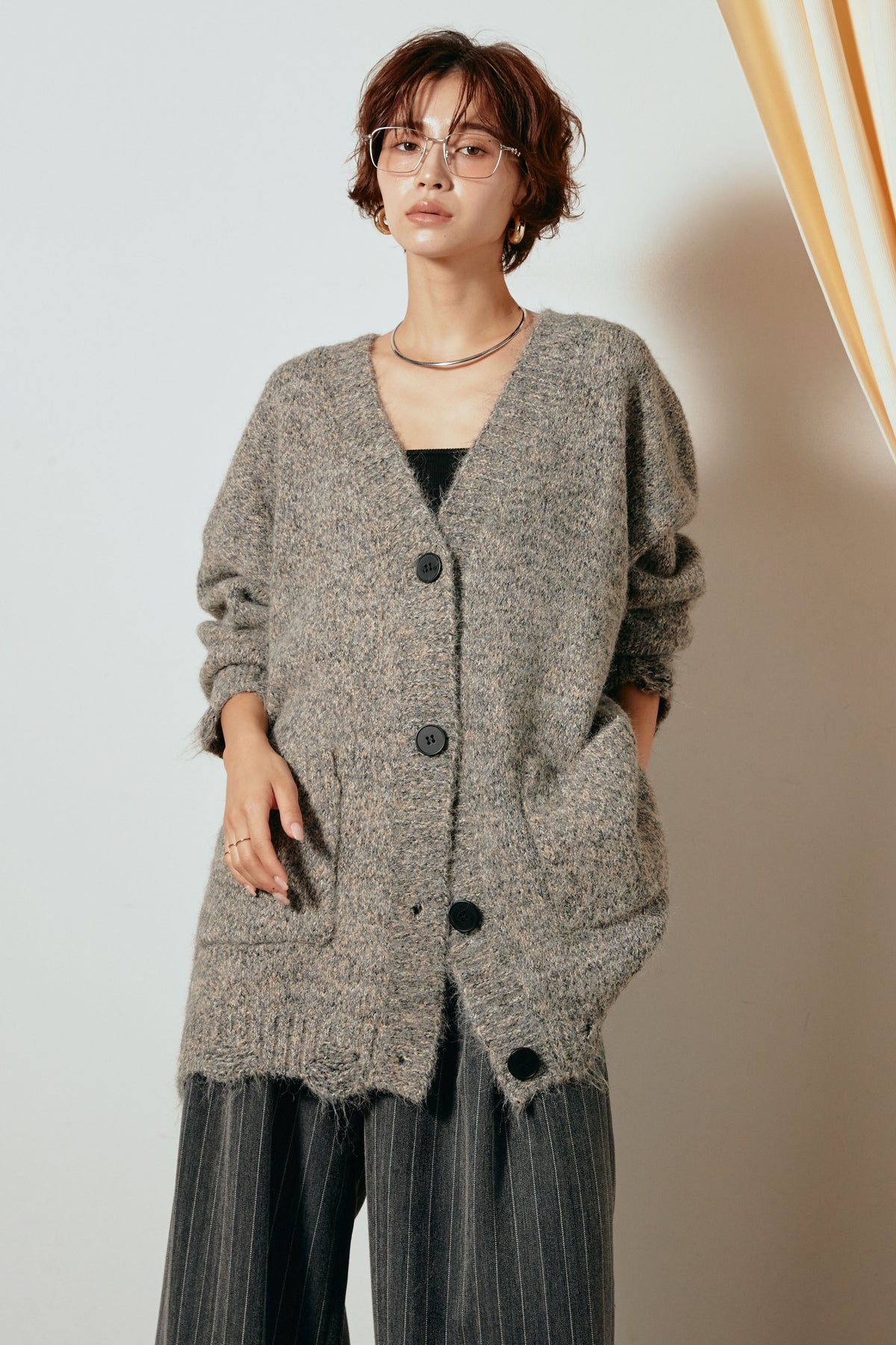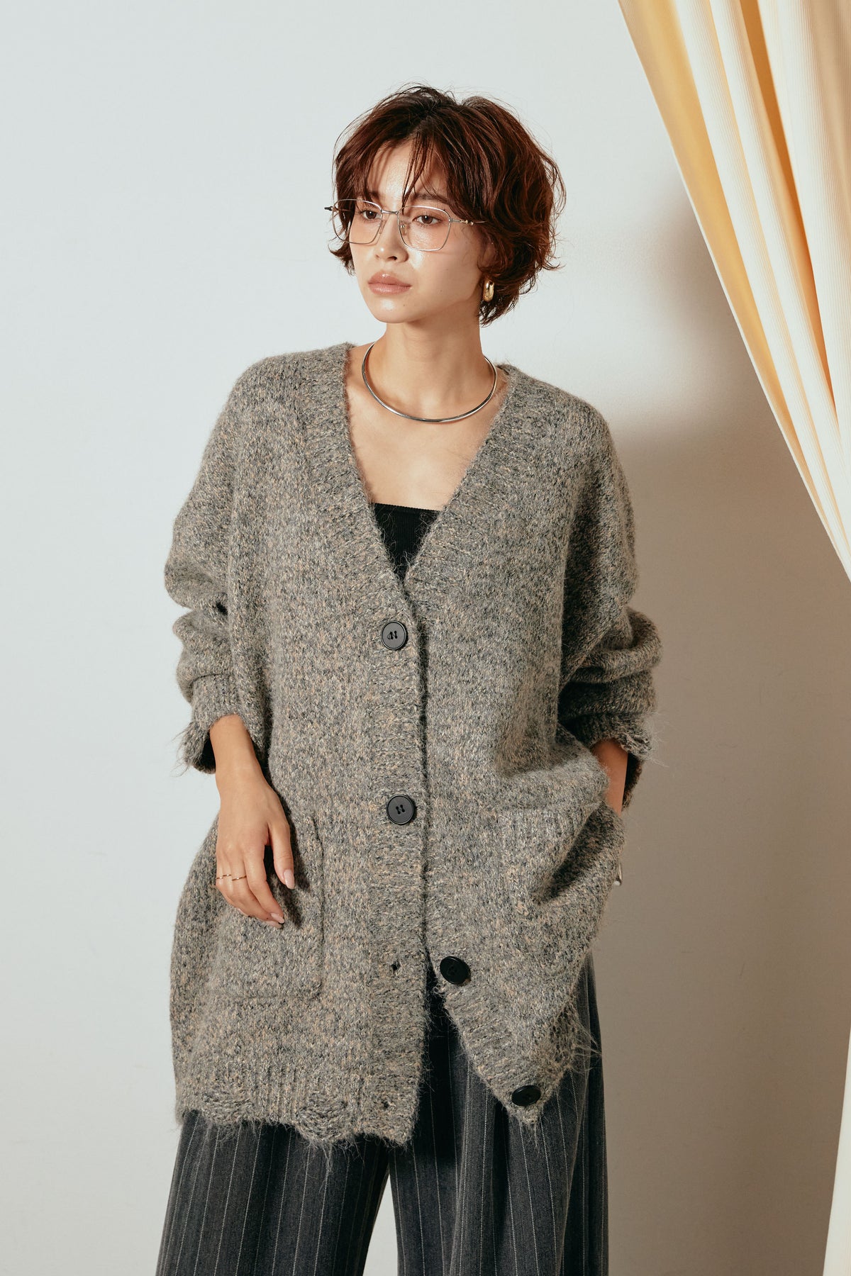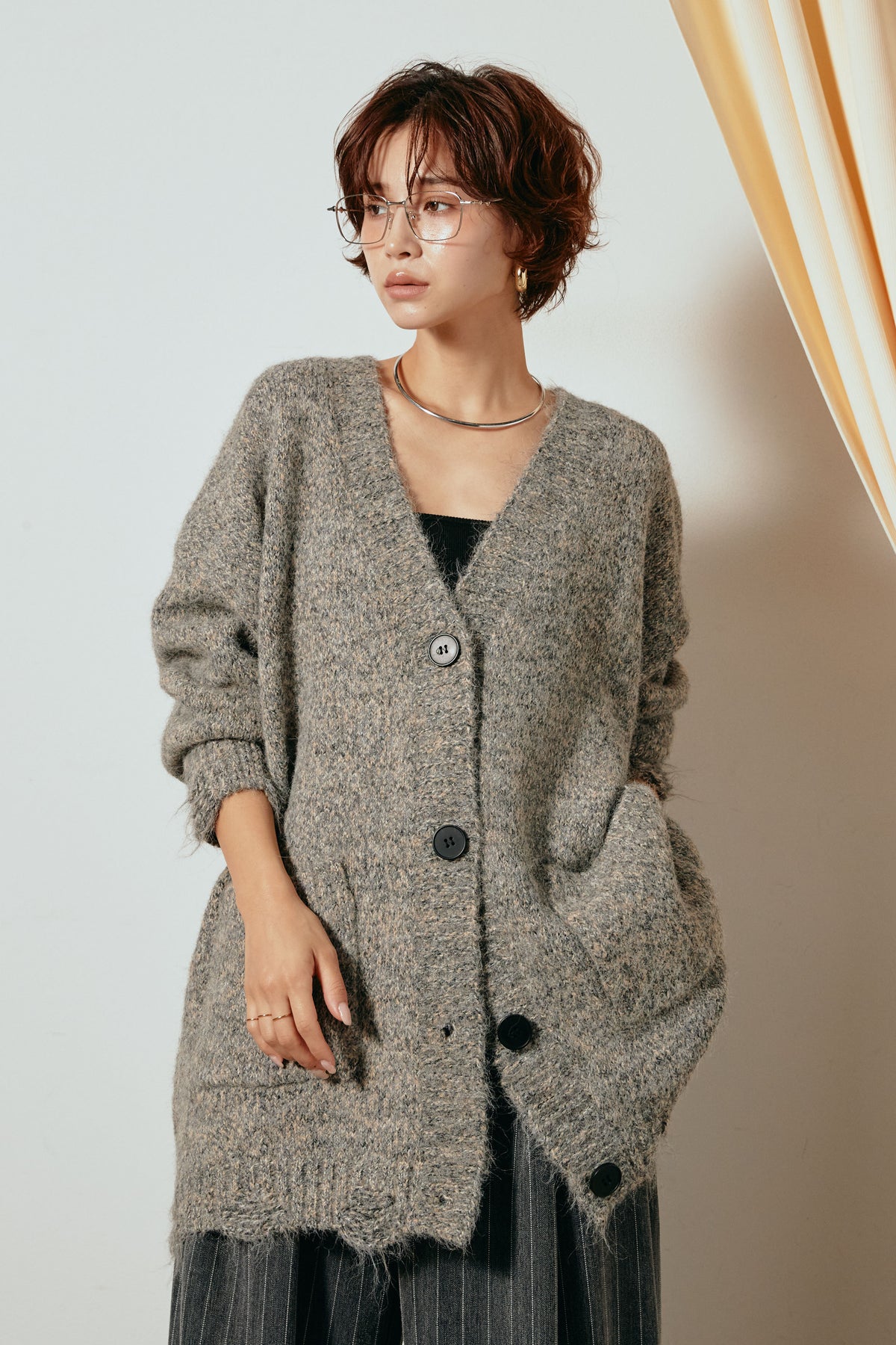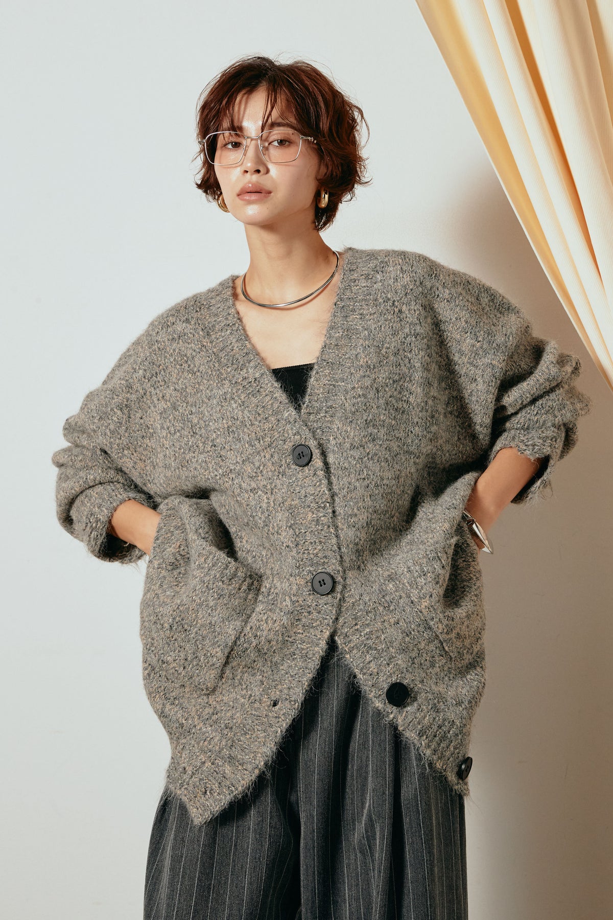 異なる糸をミックスした表情豊かなVネックカーディガン。 程よくゆとりのあるシルエットが抜け感を演出し、羽織るだけでこなれた印象に。 シャツやタートルをレイヤードしてもバランスよくまとまり、季節の変わり目にも重宝する一枚です。