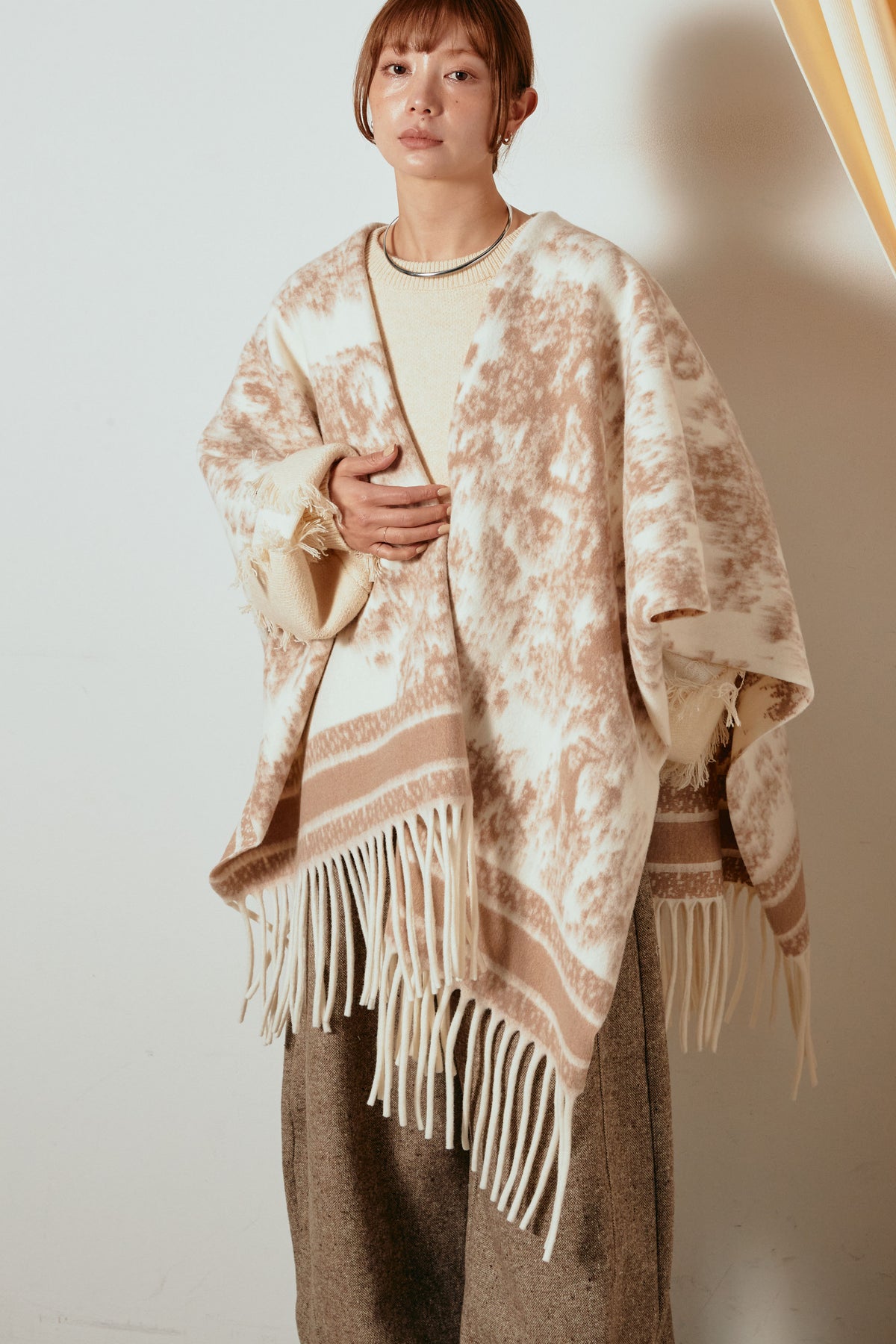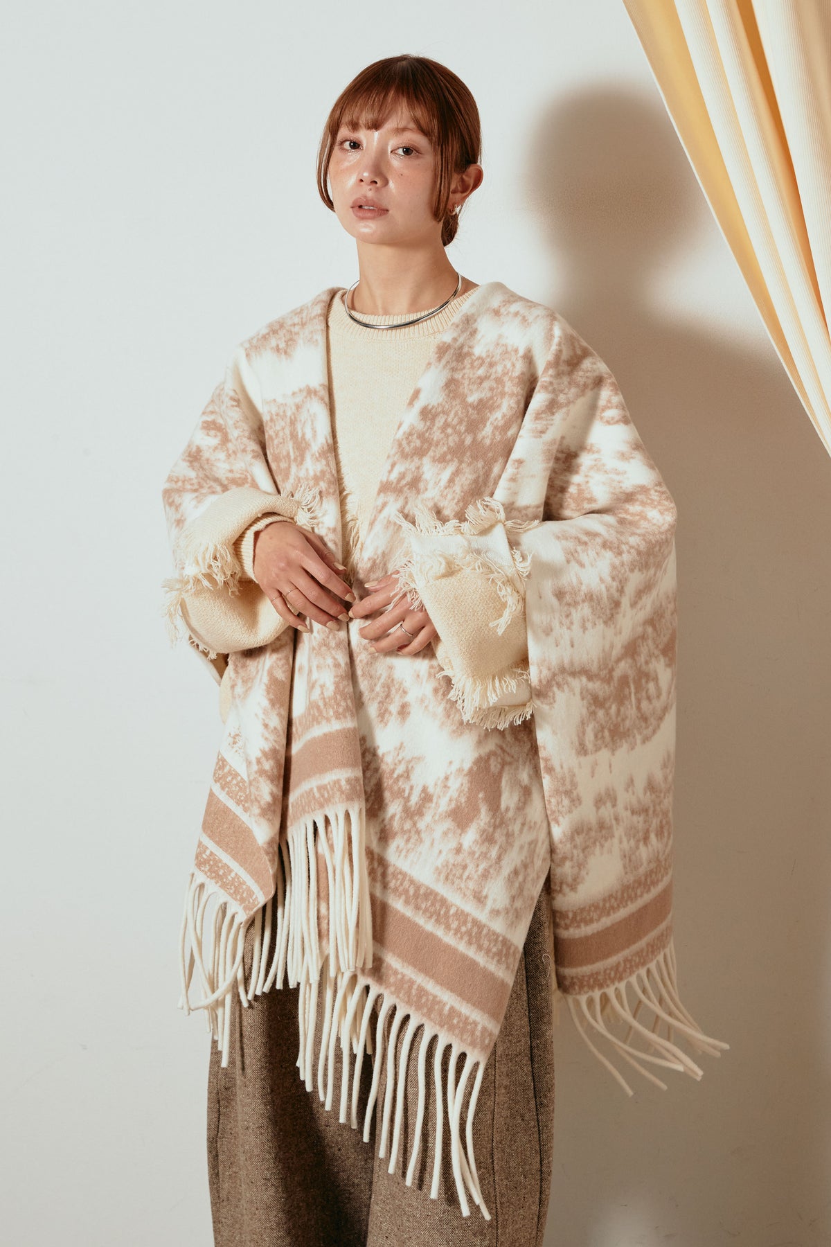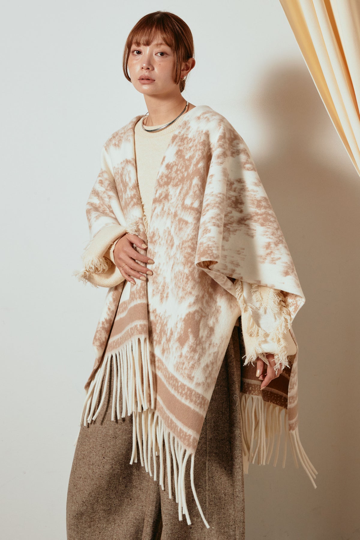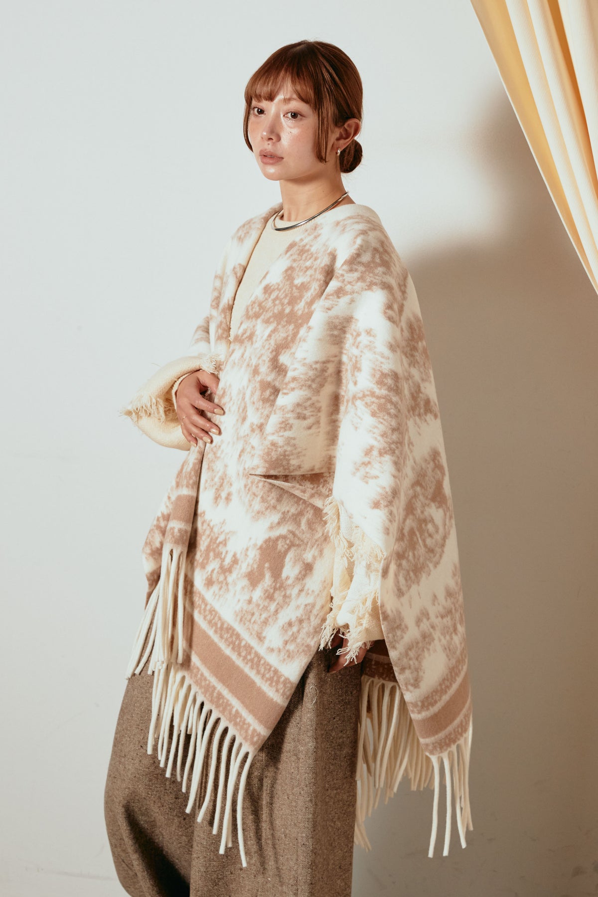 裾フリンジジャガード柄ポンチョアウター/アイボリー