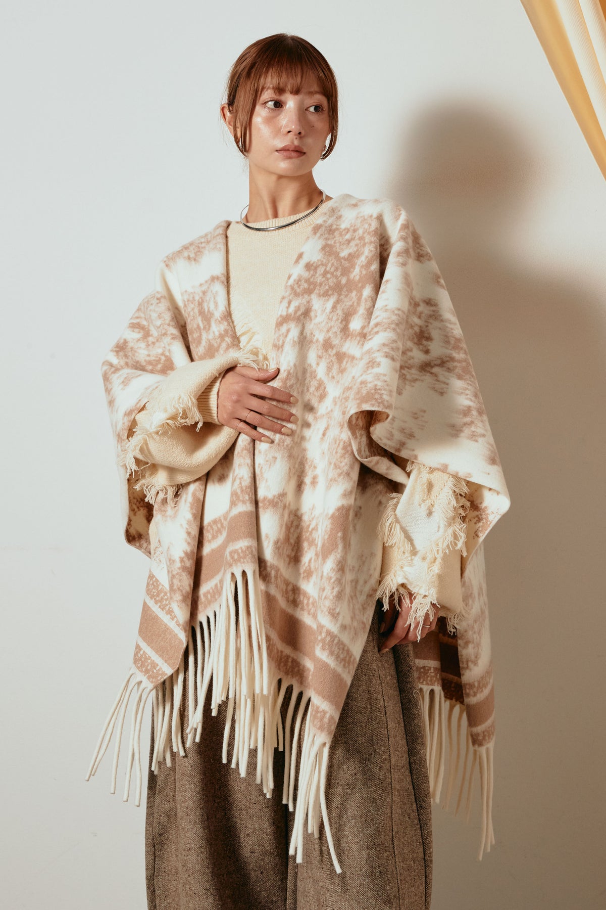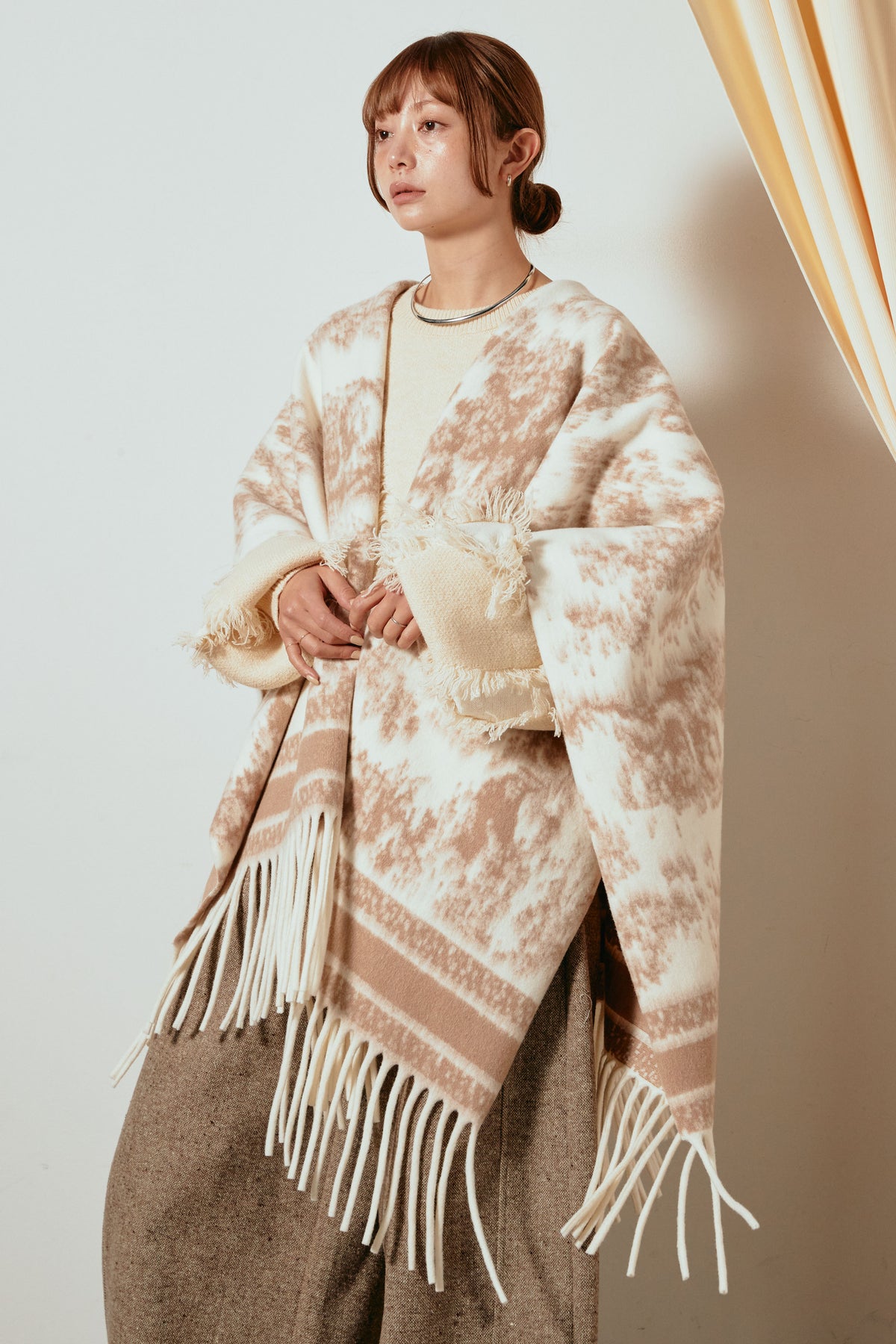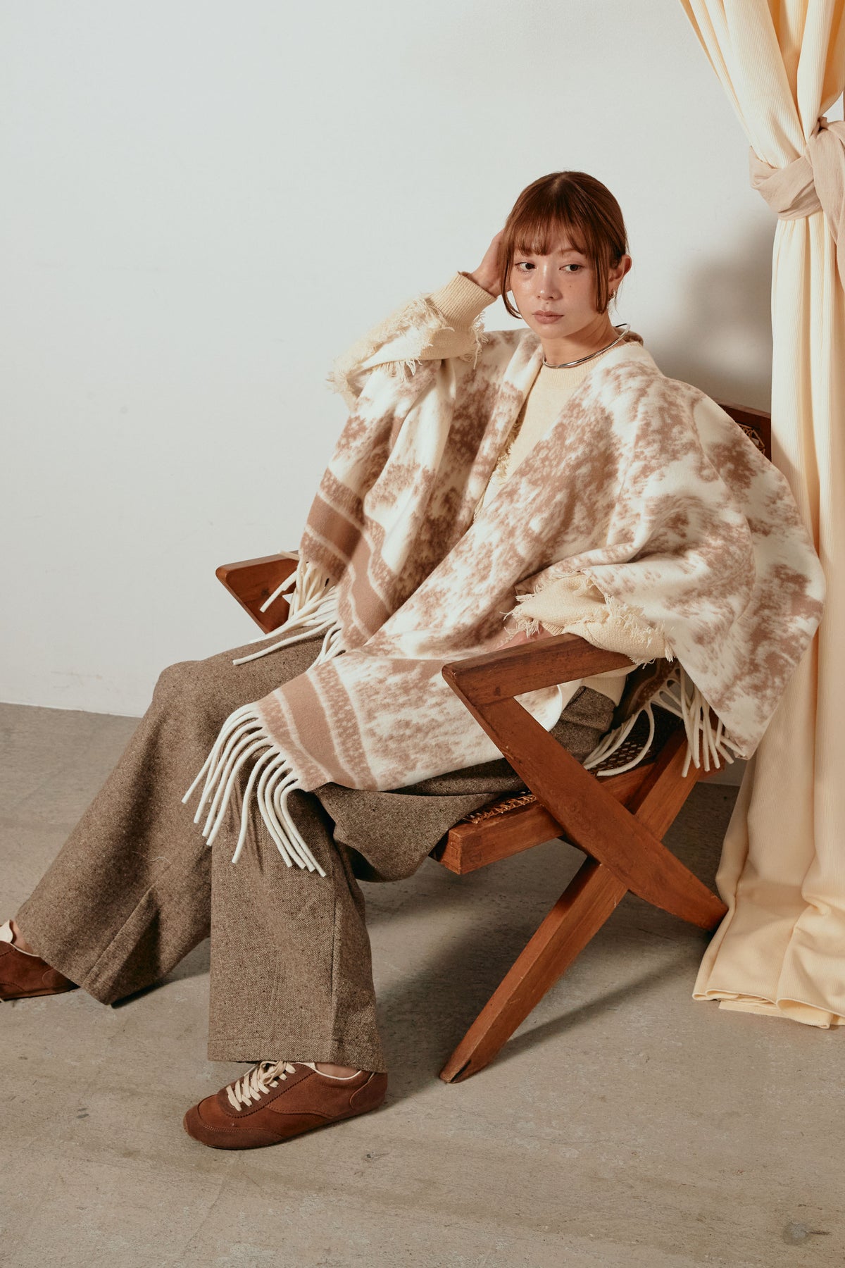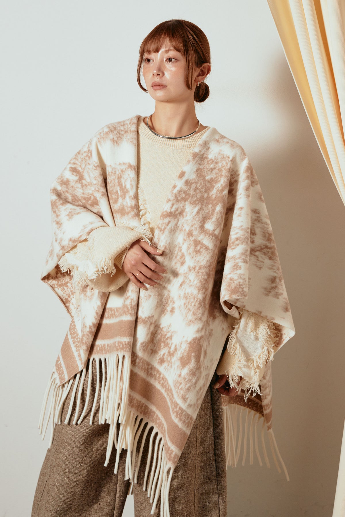 裾フリンジジャガード柄ポンチョアウター/アイボリー
