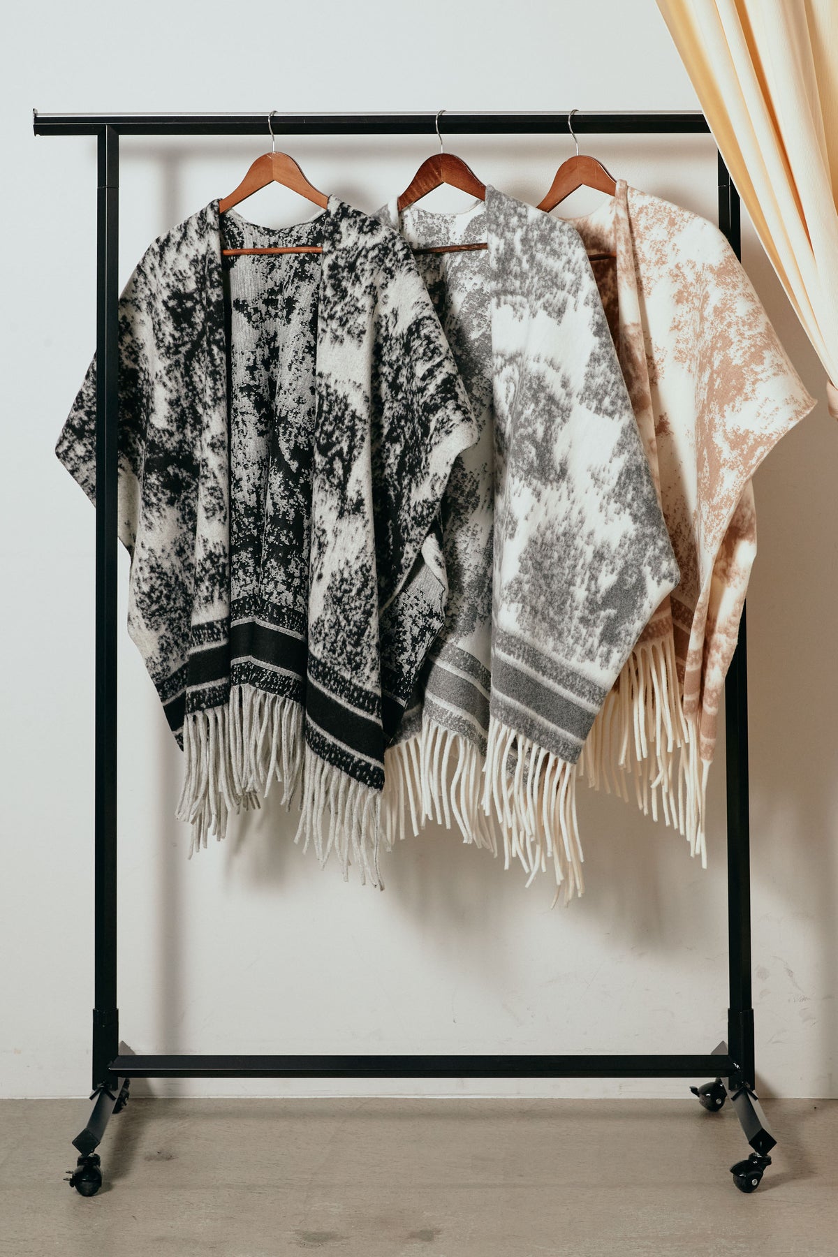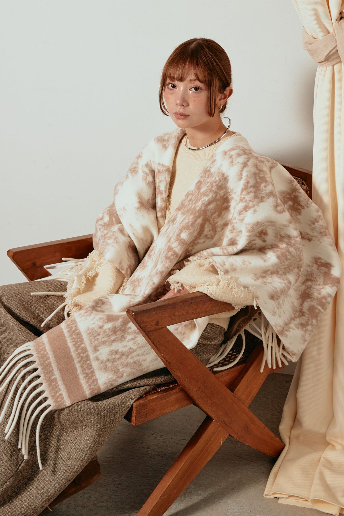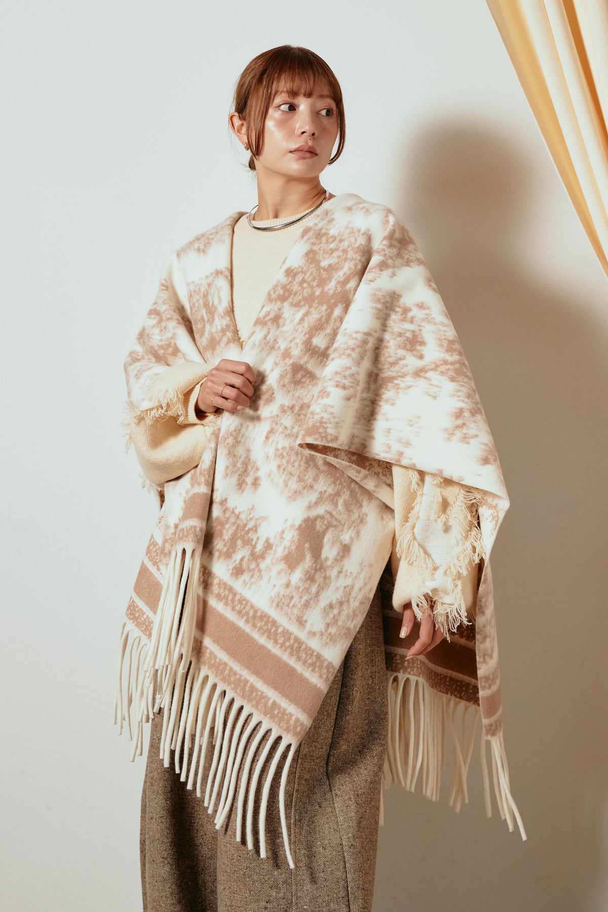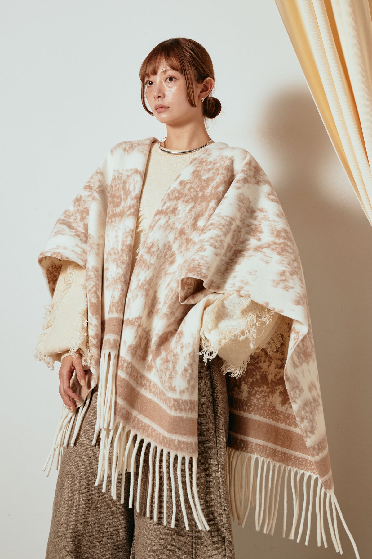 裾フリンジジャガード柄ポンチョアウター/アイボリー