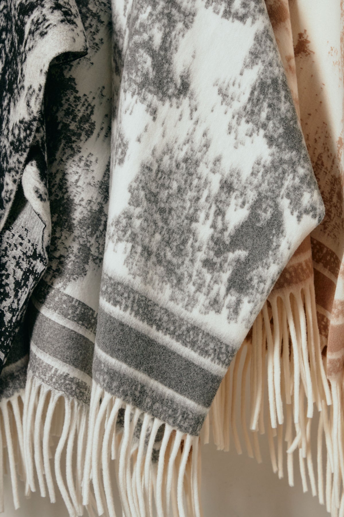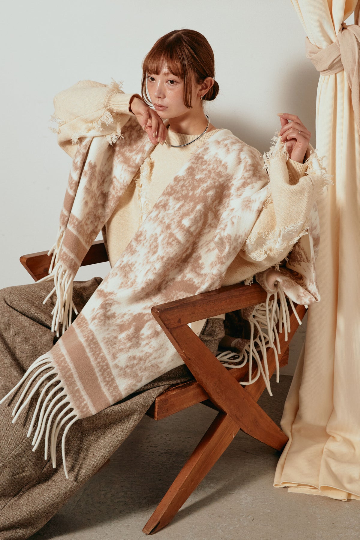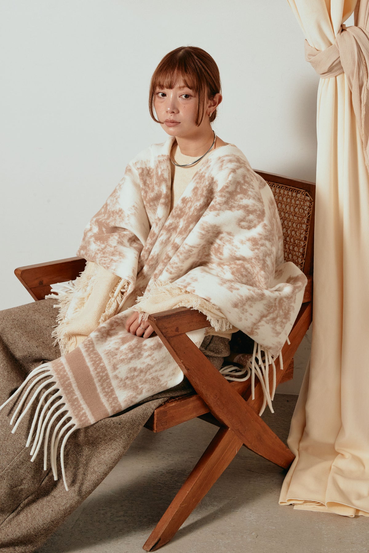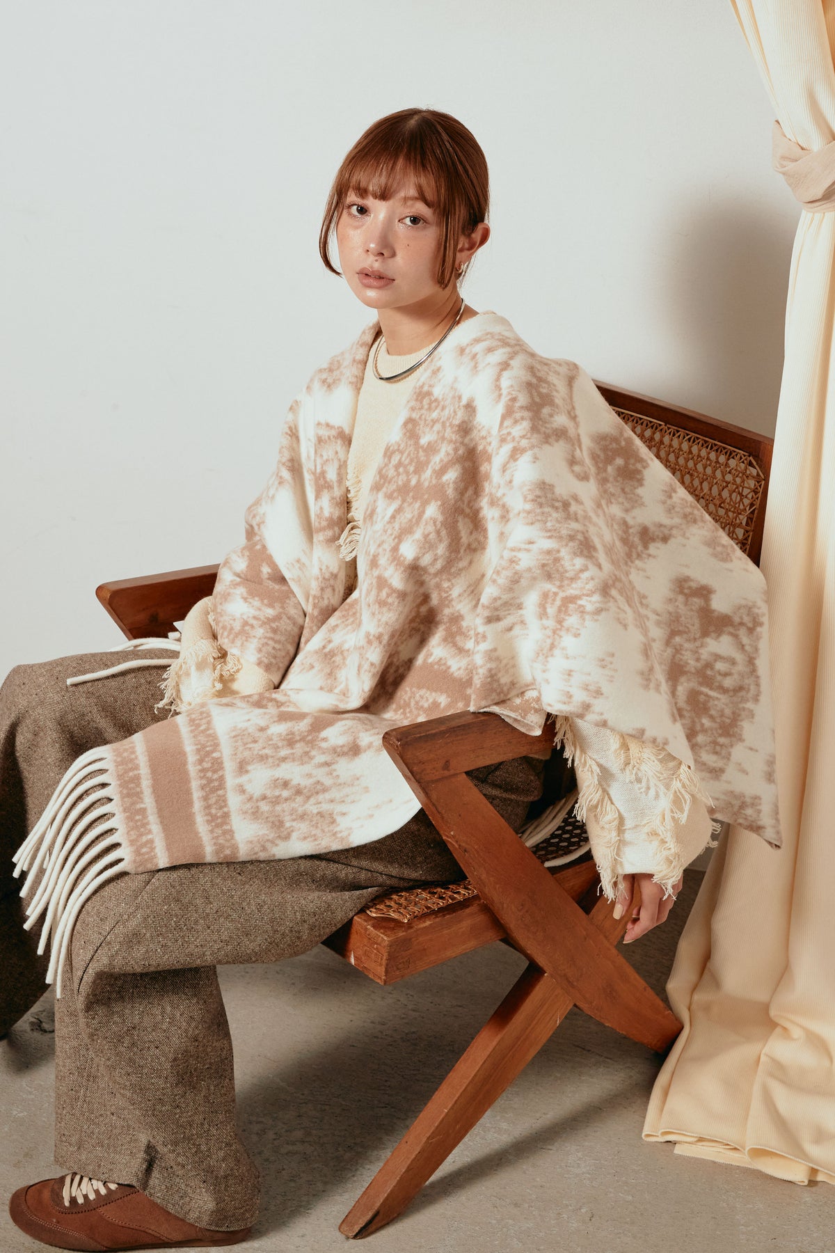 存在感のあるジャガード柄と裾フリンジが目を引くポンチョアウター。 ふんわりとしたシルエットで、さっと羽織るだけでこなれ感のあるスタイリングに。 軽やかな着心地ながらもしっかり暖かく、季節の変わり目や秋冬のレイヤードにぴったりな1着です。