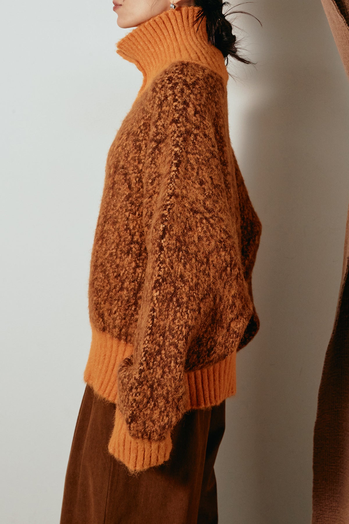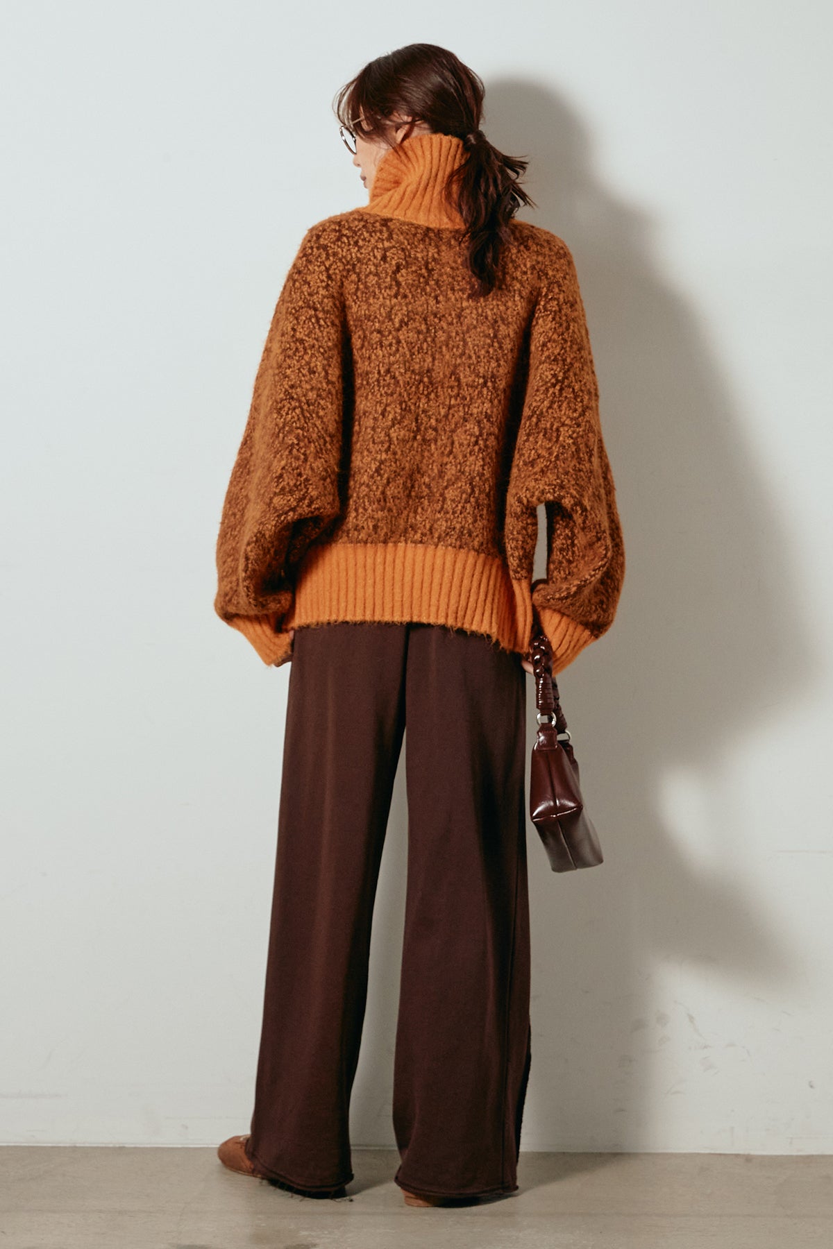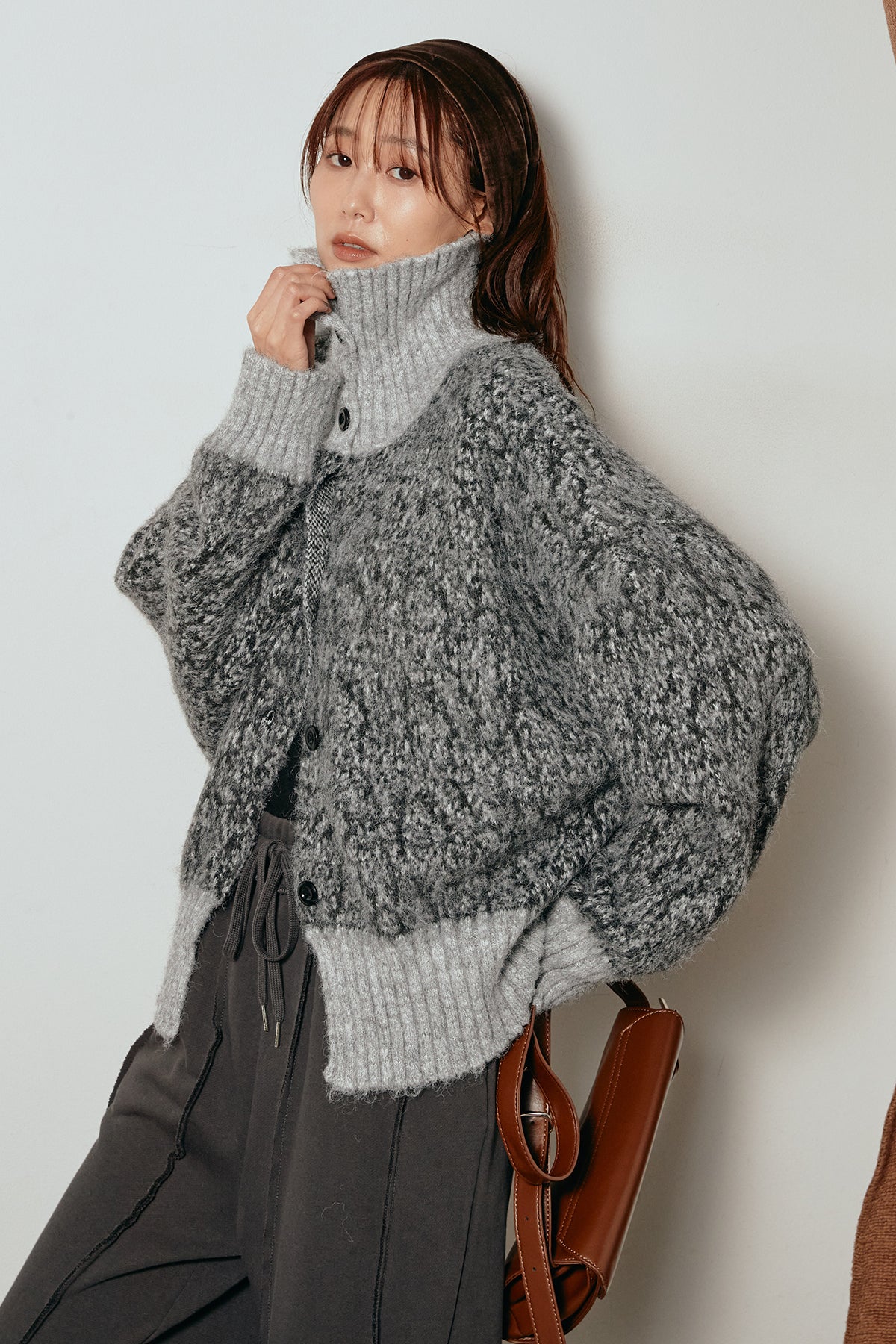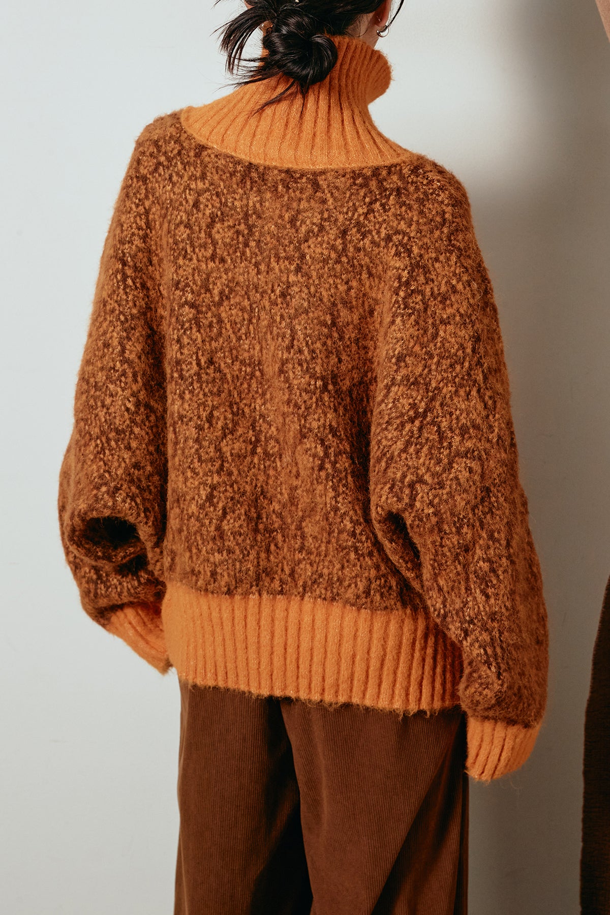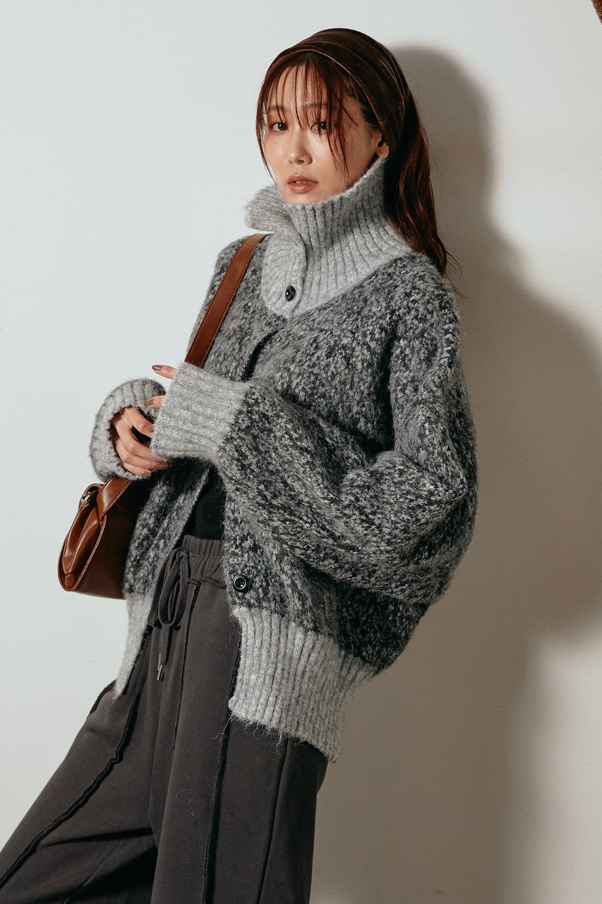 表情豊かなミックス糸を使用したハイネックニットトップス。異なる糸の風合いが奥行きのある色合いを生み、シンプルながら印象的な仕上がりに。ボリューム感のあるスリーブとリブ切り替えのディテールがアクセントになっています。ジップを開けて襟元を抜いた着こなしもおすすめで、パンツにもスカートにも合わせやすいバランスの取れた一枚です。