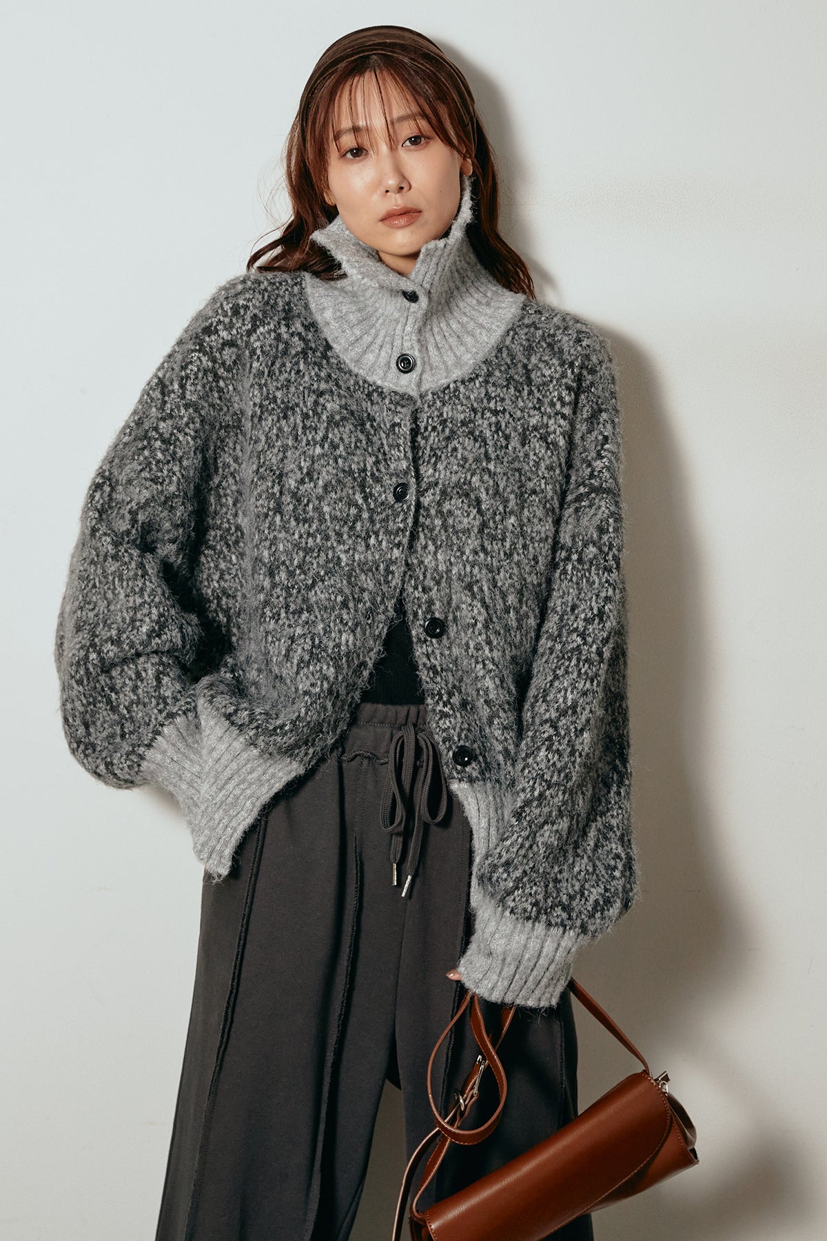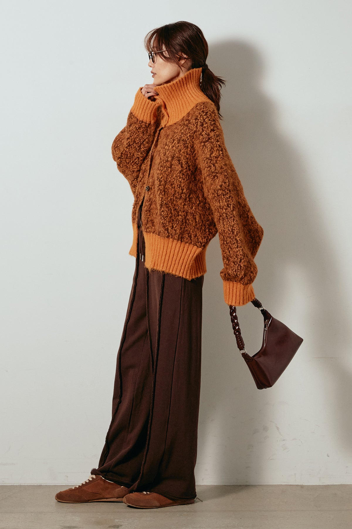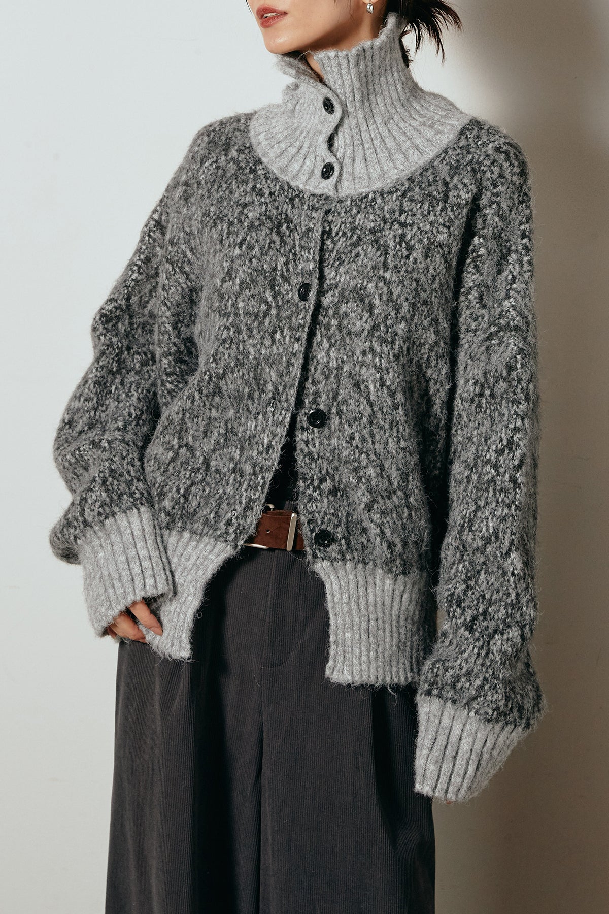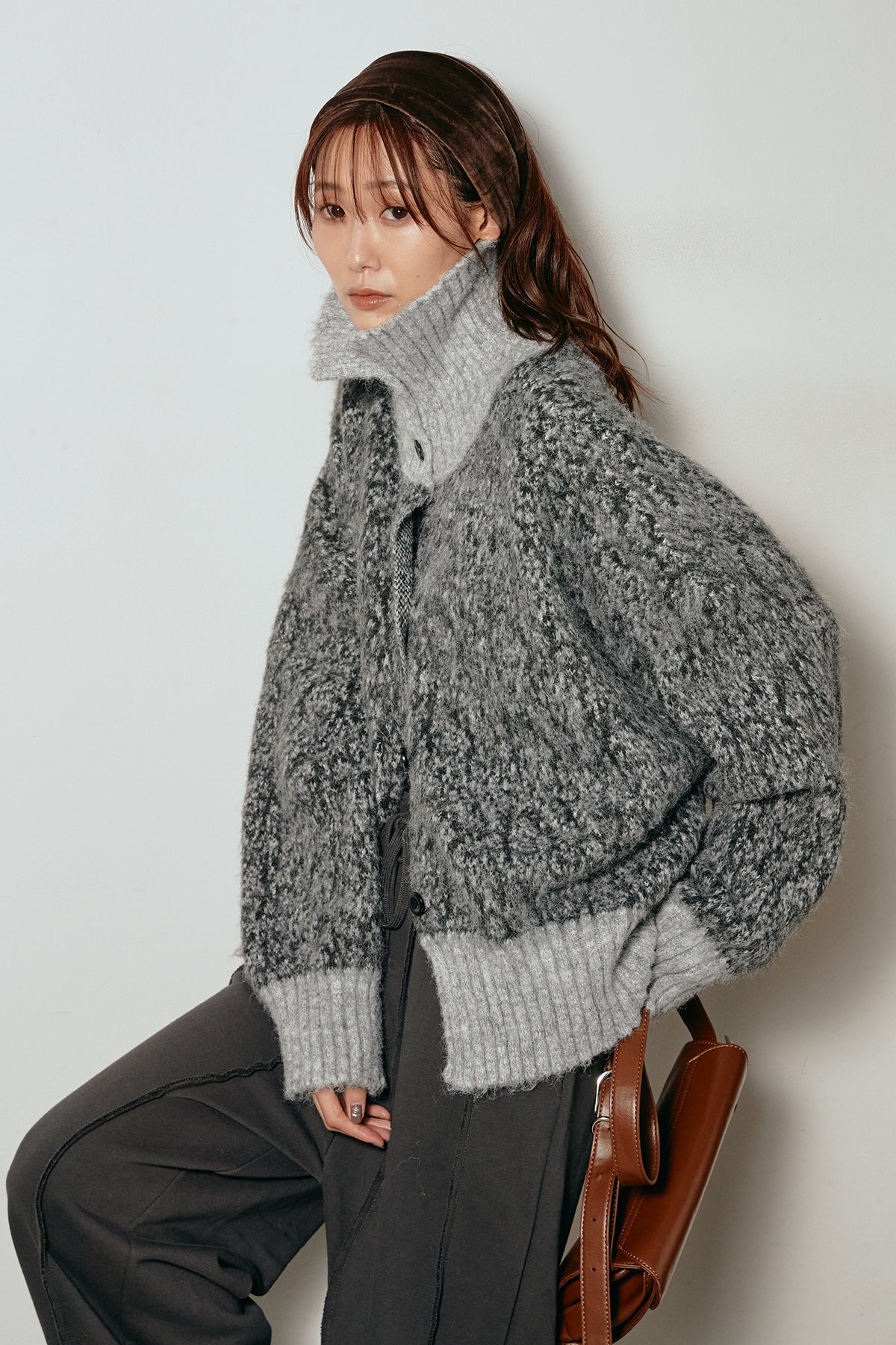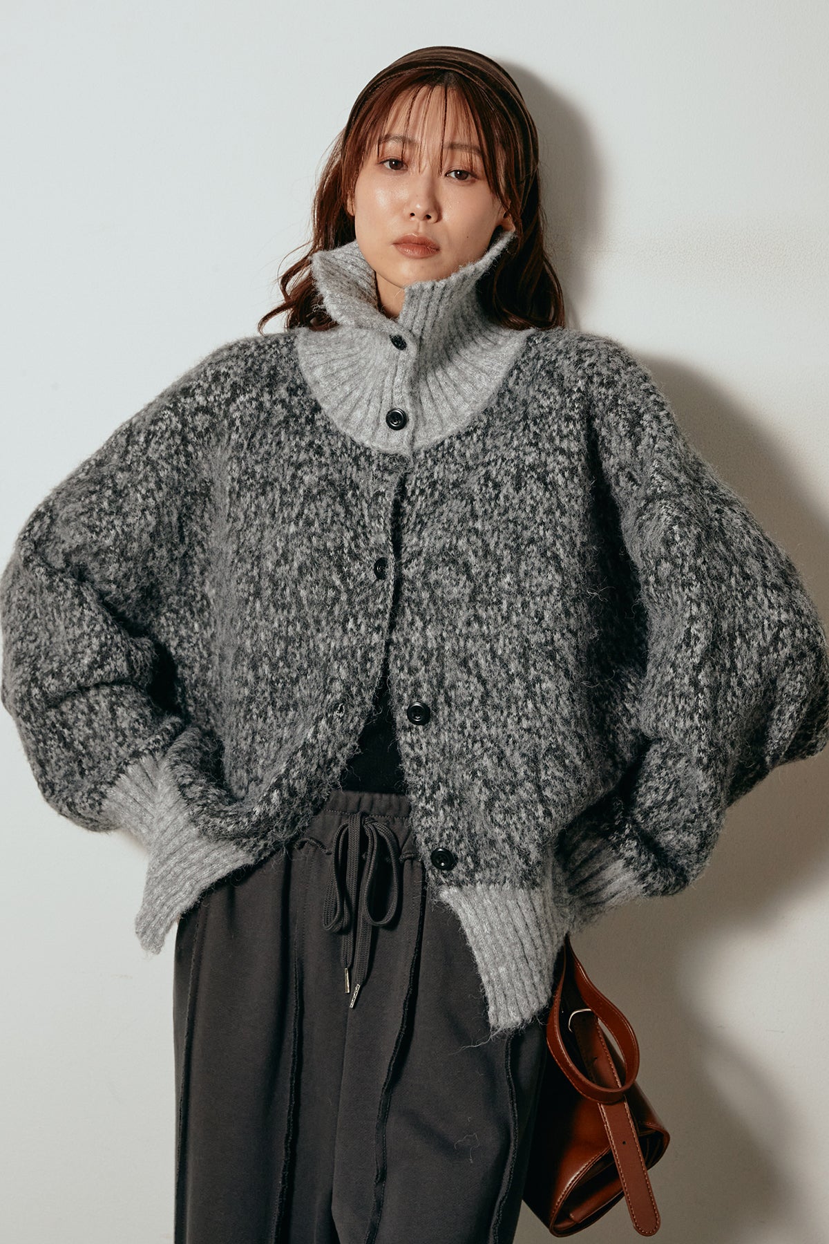 表情豊かなミックス糸を使用したハイネックニットトップス。異なる糸の風合いが奥行きのある色合いを生み、シンプルながら印象的な仕上がりに。ボリューム感のあるスリーブとリブ切り替えのディテールがアクセントになっています。ジップを開けて襟元を抜いた着こなしもおすすめで、パンツにもスカートにも合わせやすいバランスの取れた一枚です。