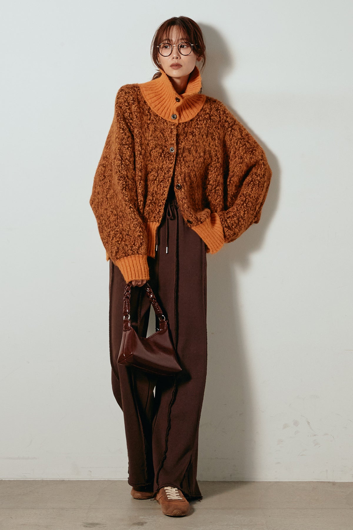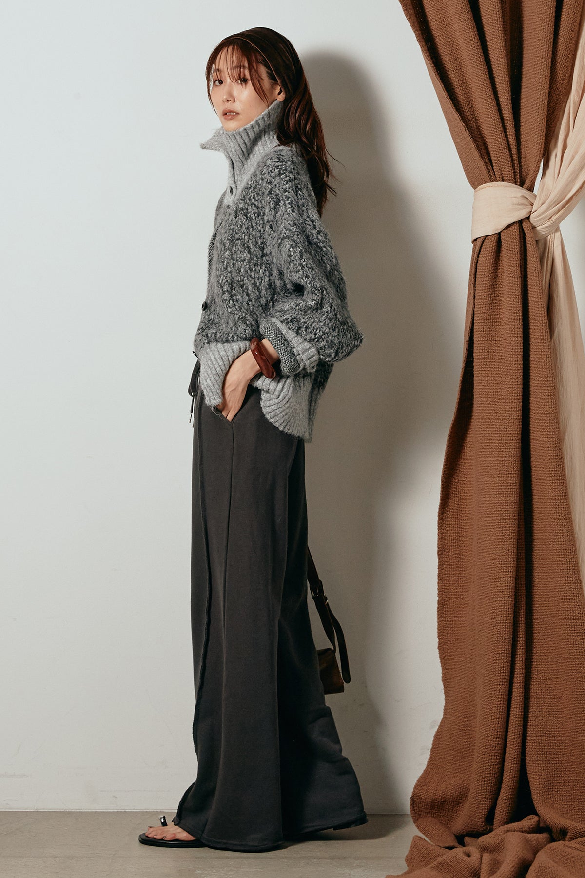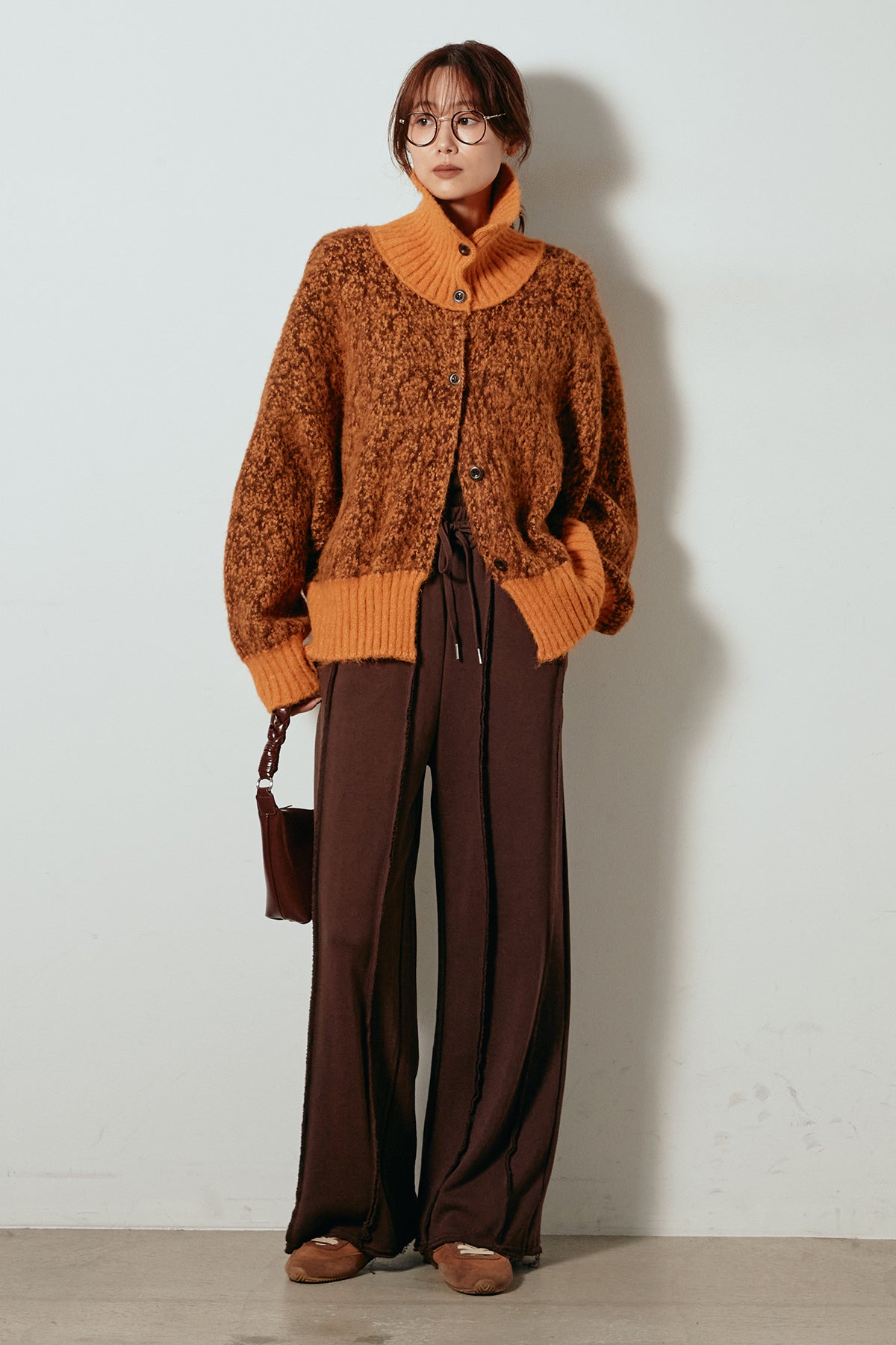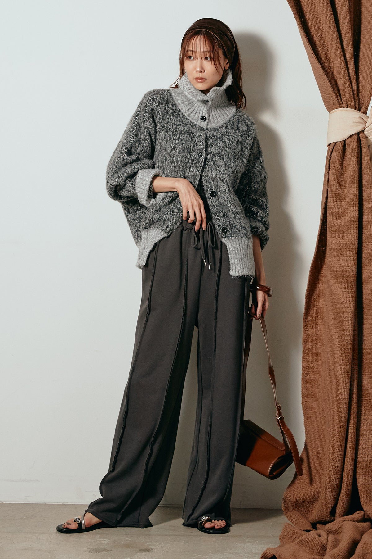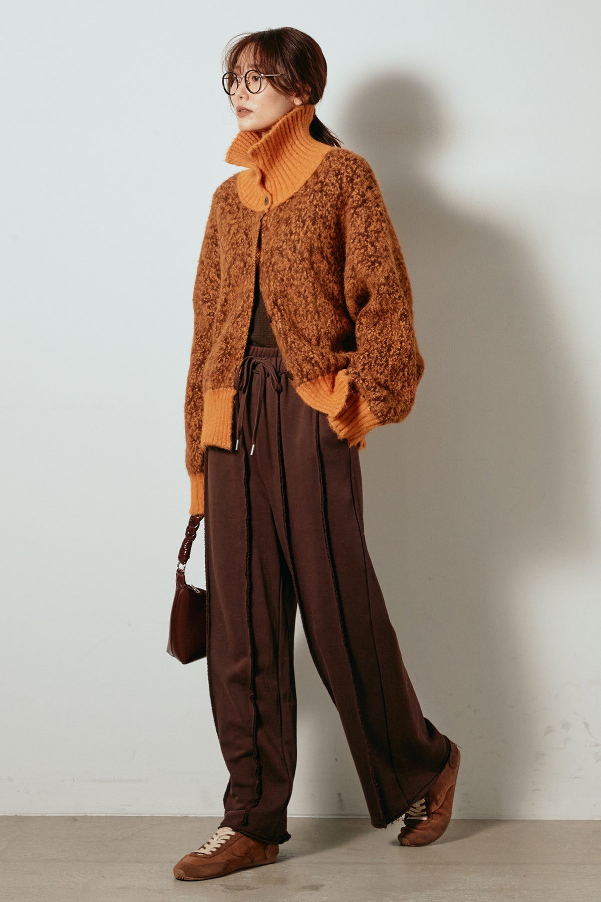 表情豊かなミックス糸を使用したハイネックニットトップス。異なる糸の風合いが奥行きのある色合いを生み、シンプルながら印象的な仕上がりに。ボリューム感のあるスリーブとリブ切り替えのディテールがアクセントになっています。ジップを開けて襟元を抜いた着こなしもおすすめで、パンツにもスカートにも合わせやすいバランスの取れた一枚です。