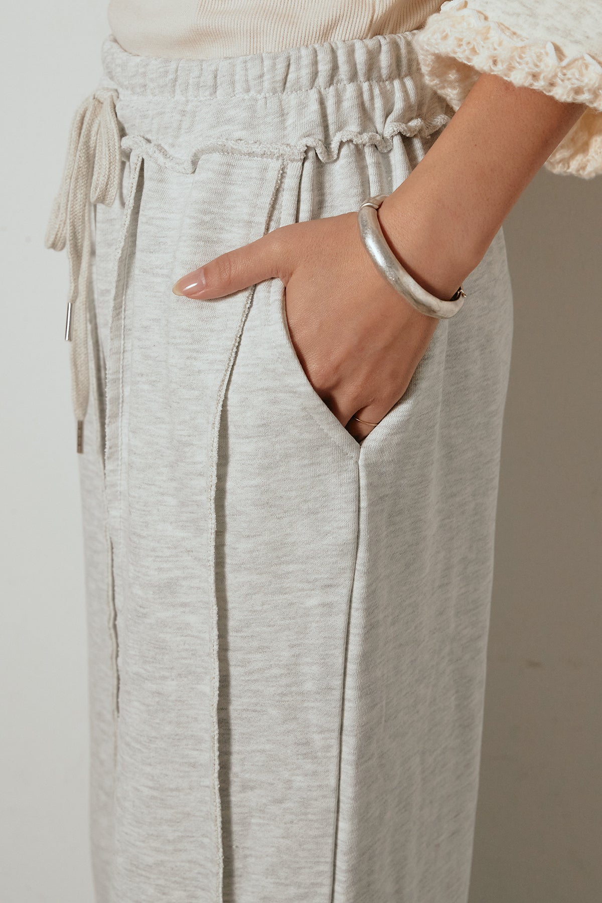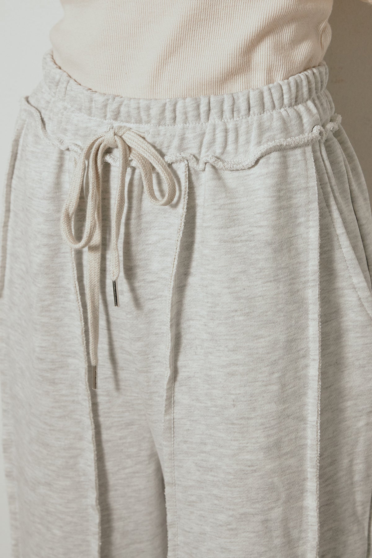 フロントに施されたステッチラインが特徴的なスウェットワイドパンツ。立体感のあるシームデザインが脚のラインをすっきりと見せ、ラフながらも洗練された印象に。ウエストはドローストリング仕様で快適な穿き心地を実現。柔らかく落ち感のある素材で、動きやすさとシルエットの美しさを両立。スウェットながらも大人っぽく着こなせる万能ボトムです。