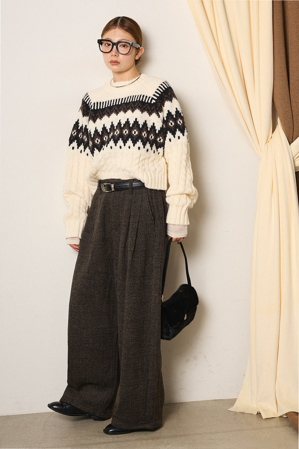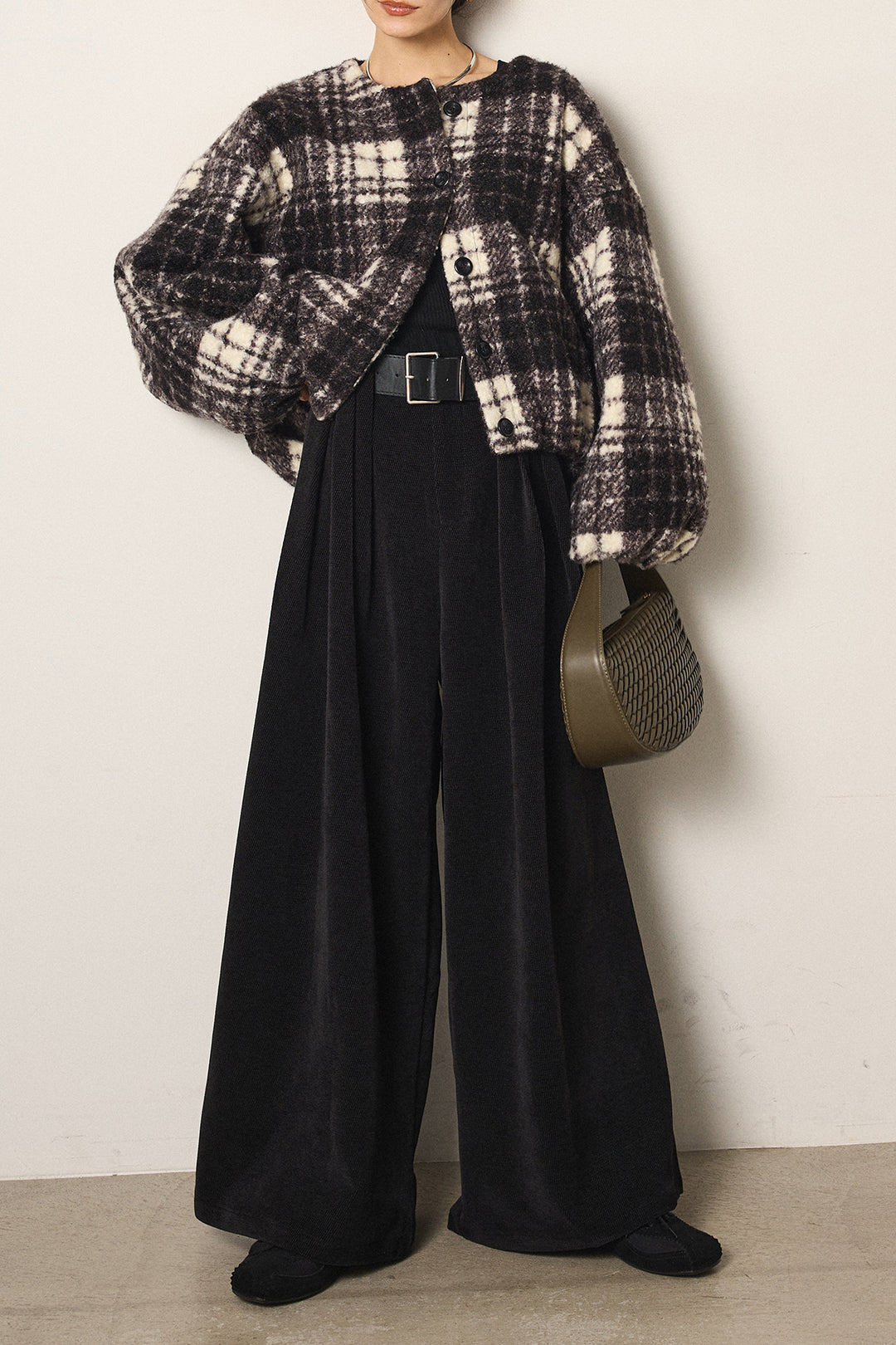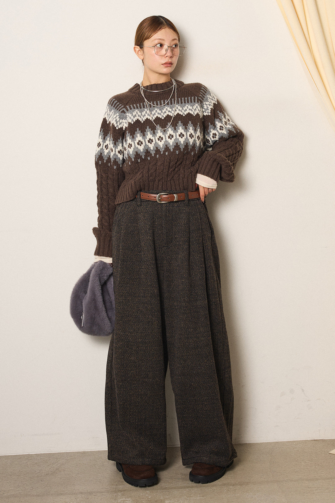 [SET]2WAY求心柄ジャガードショートカーディガン+起毛タック入りツイードワイドパンツ(2set)