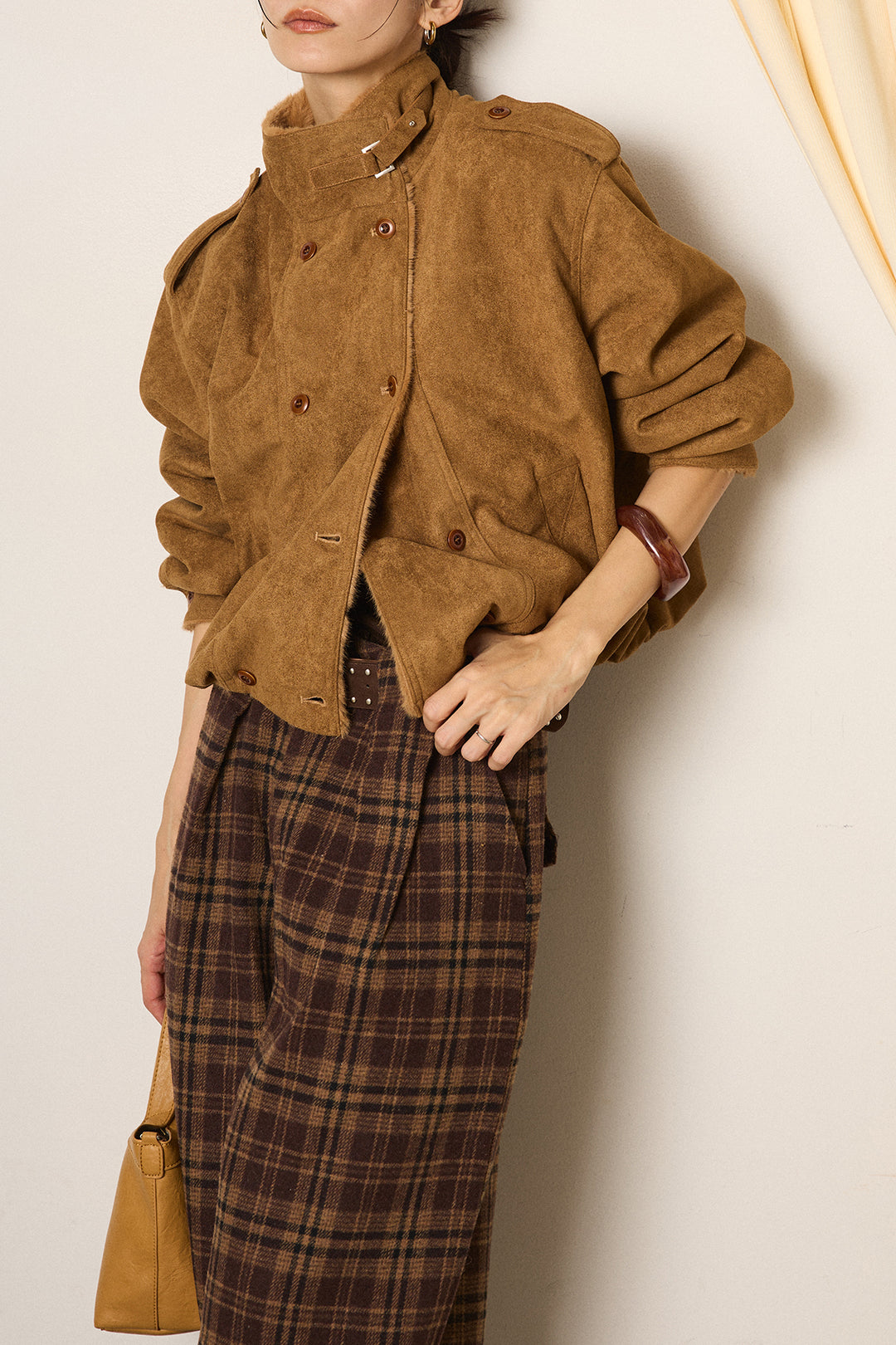 [SET]スタンド襟スウェードライクアウター+スタッズデザインベルトタータンチェックパンツ(2set)