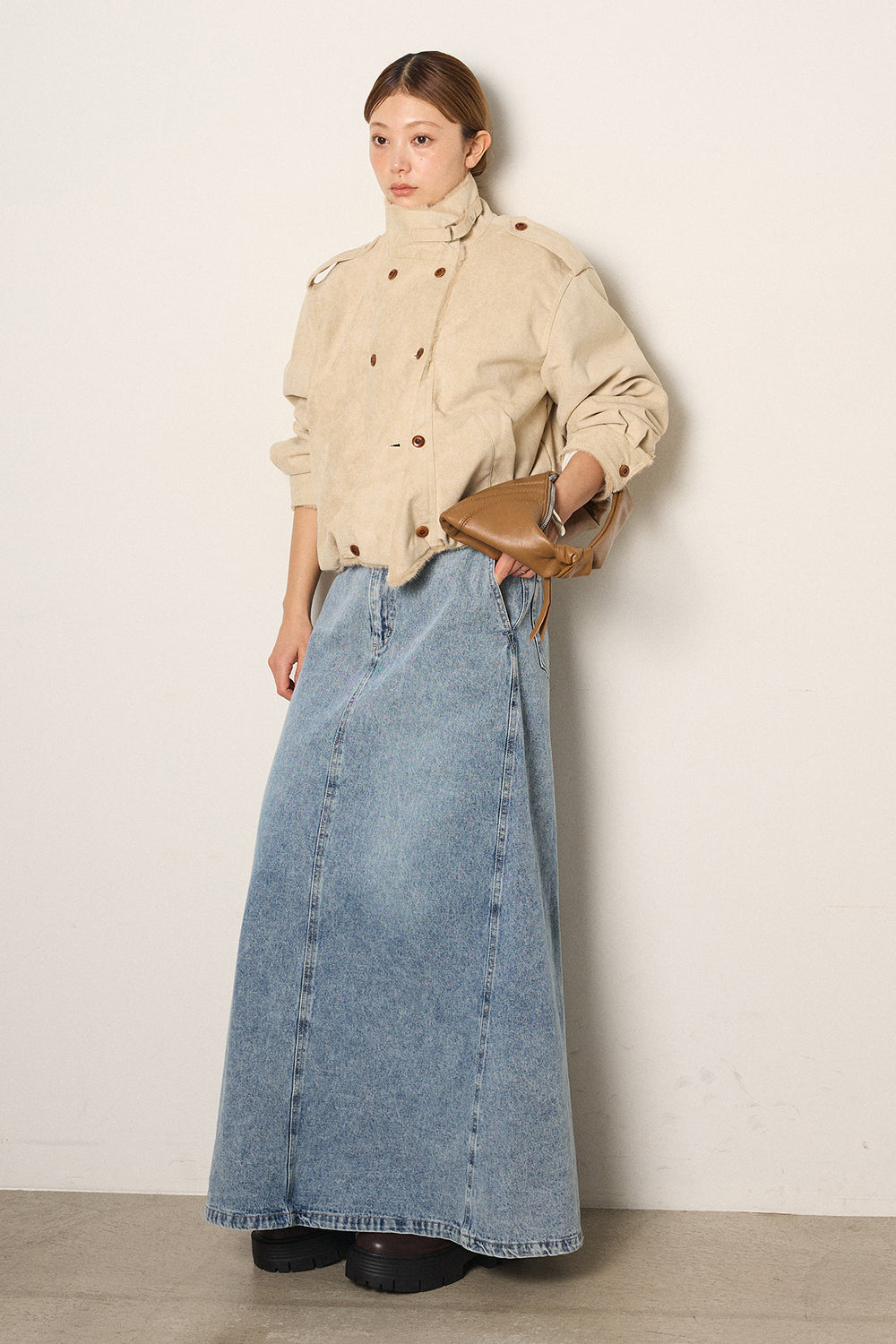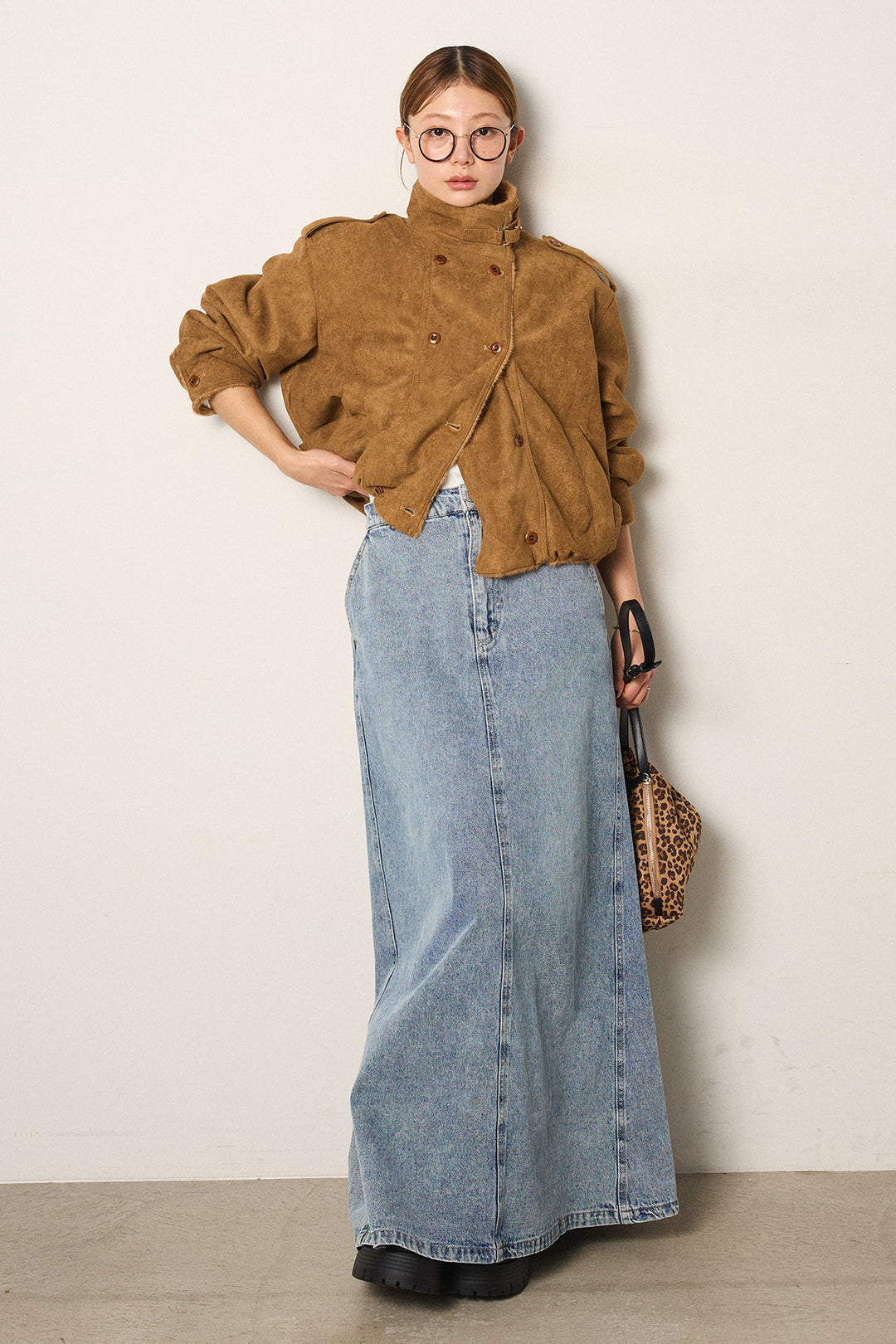 [SET]スタンド襟スウェードライクアウター+デニムロングフレアスカート(2set)