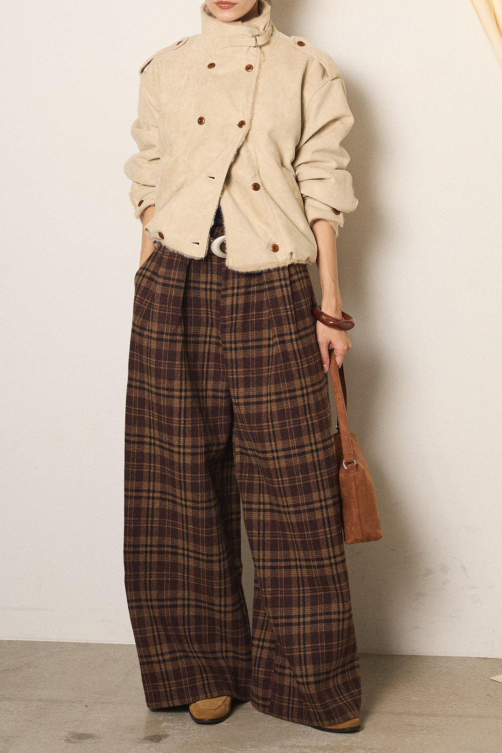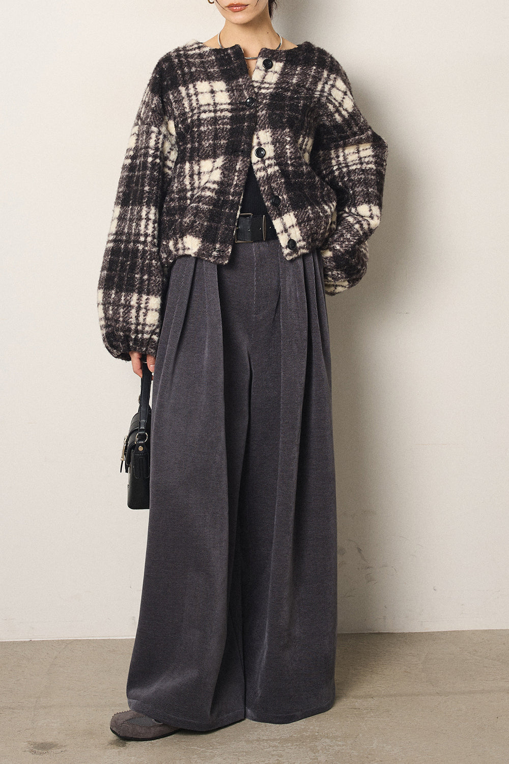 [SET]ノーカラーチェック柄ボアブルゾン+ベルトループコーデュロイワイドパンツ(2set)