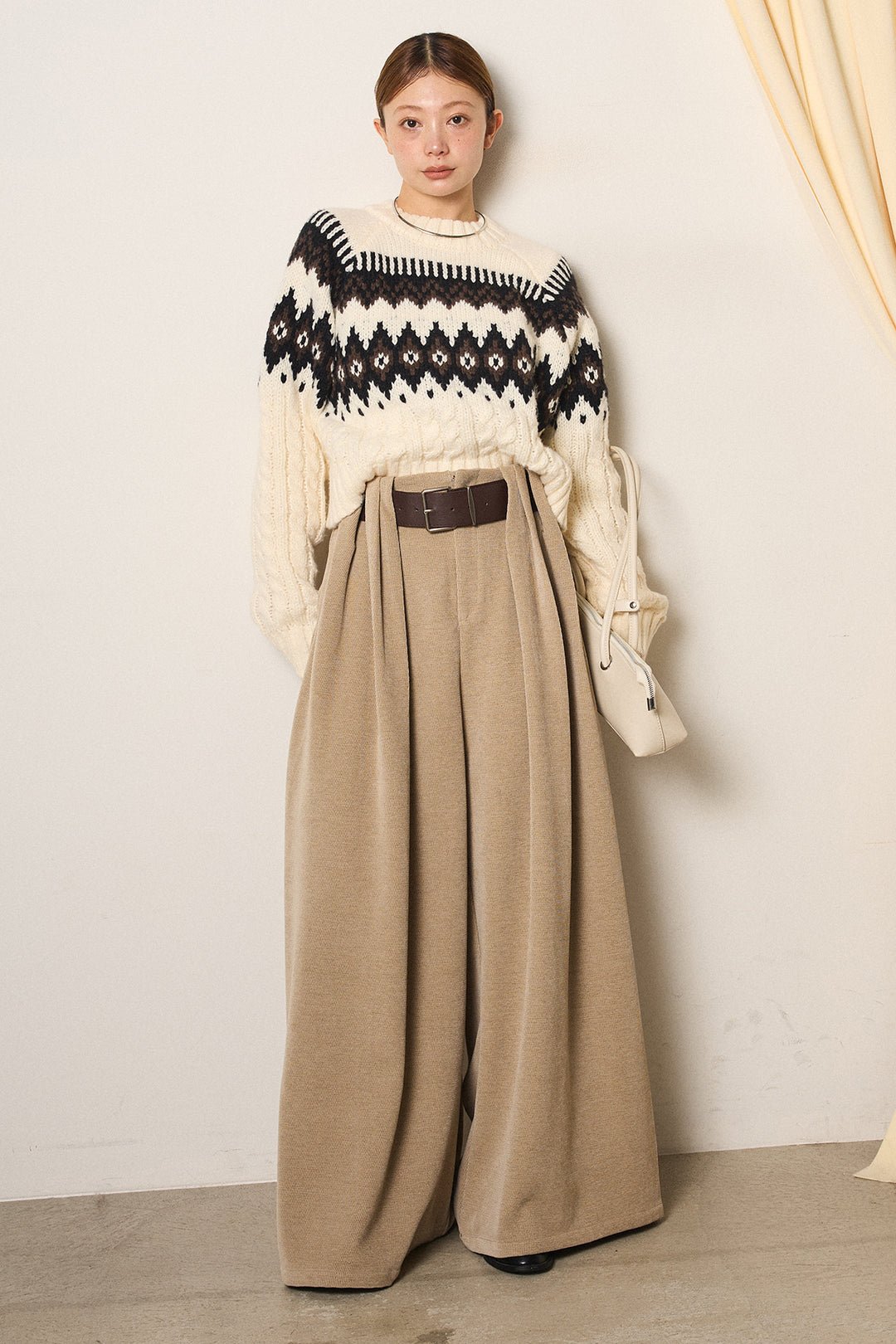 [SET]2WAY求心柄ジャガードショートカーディガン+起毛タック入りツイードワイドパンツ+2WAY袖コード刺繍クルーネックプルオーバー(3set)