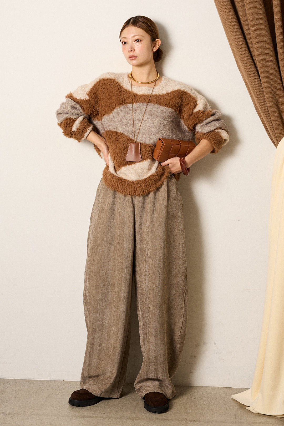 [SET]シャギーウェーブ柄クルーネックニットトップス+細ベルト付き起毛タックワイドパンツ(2set)