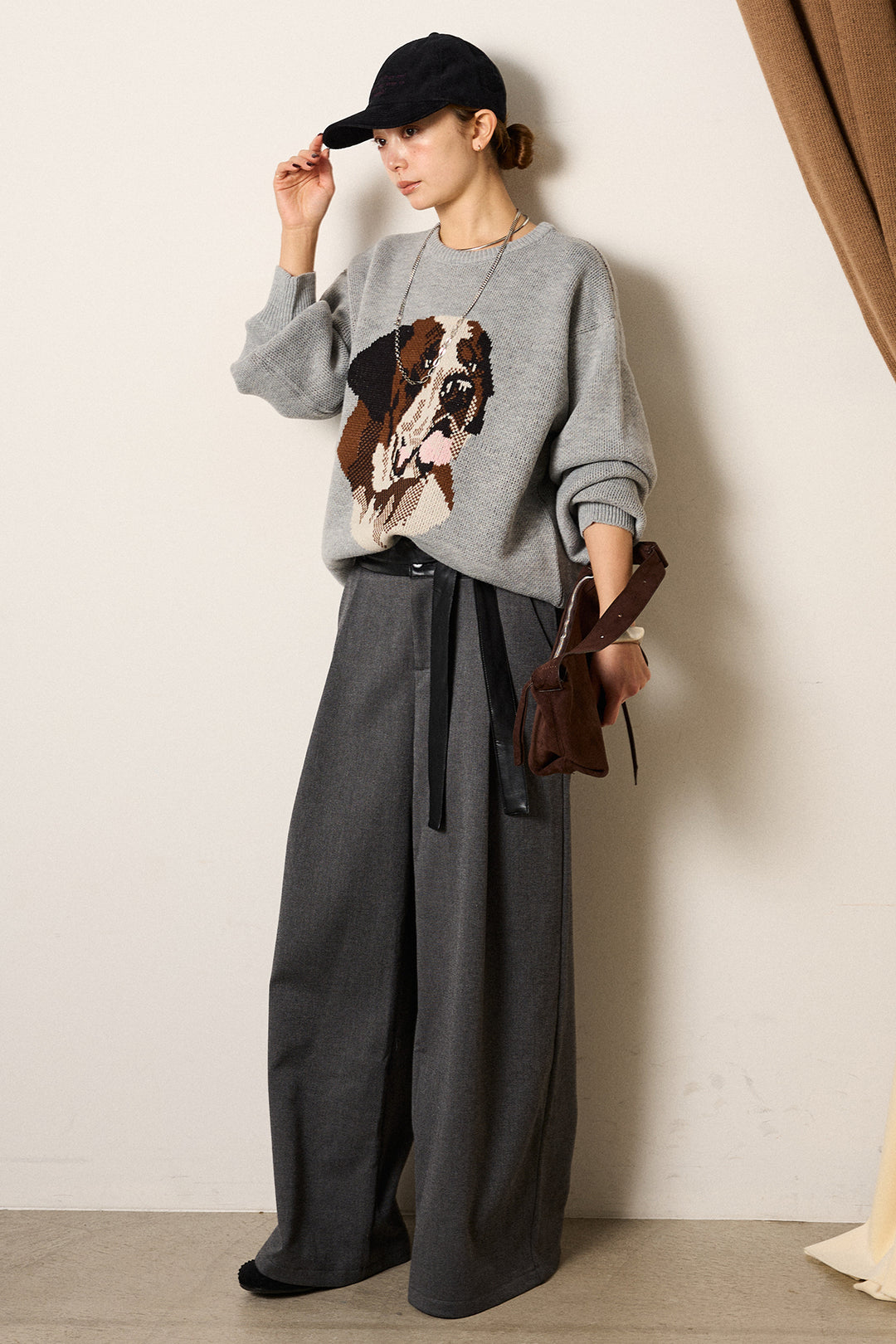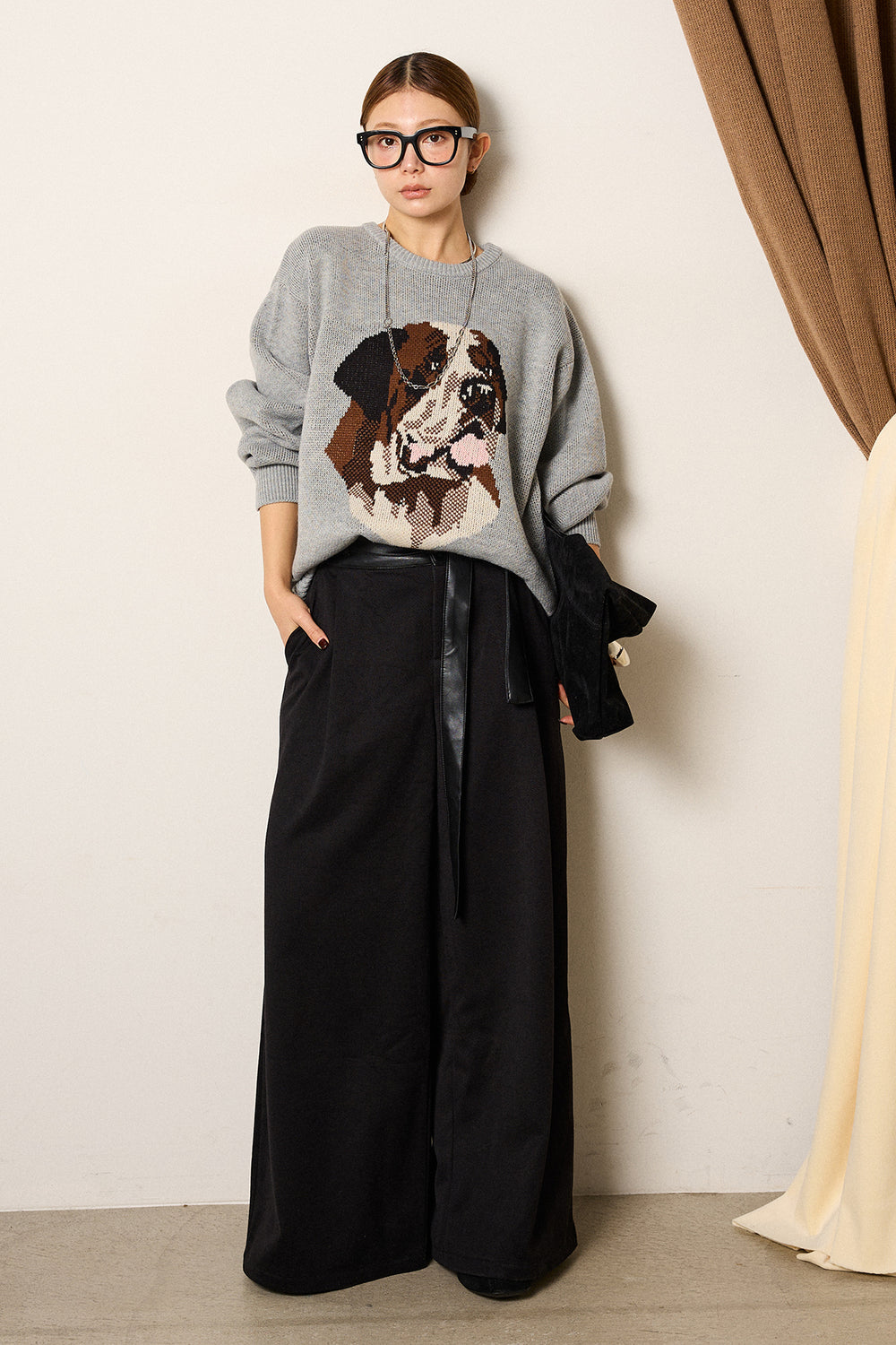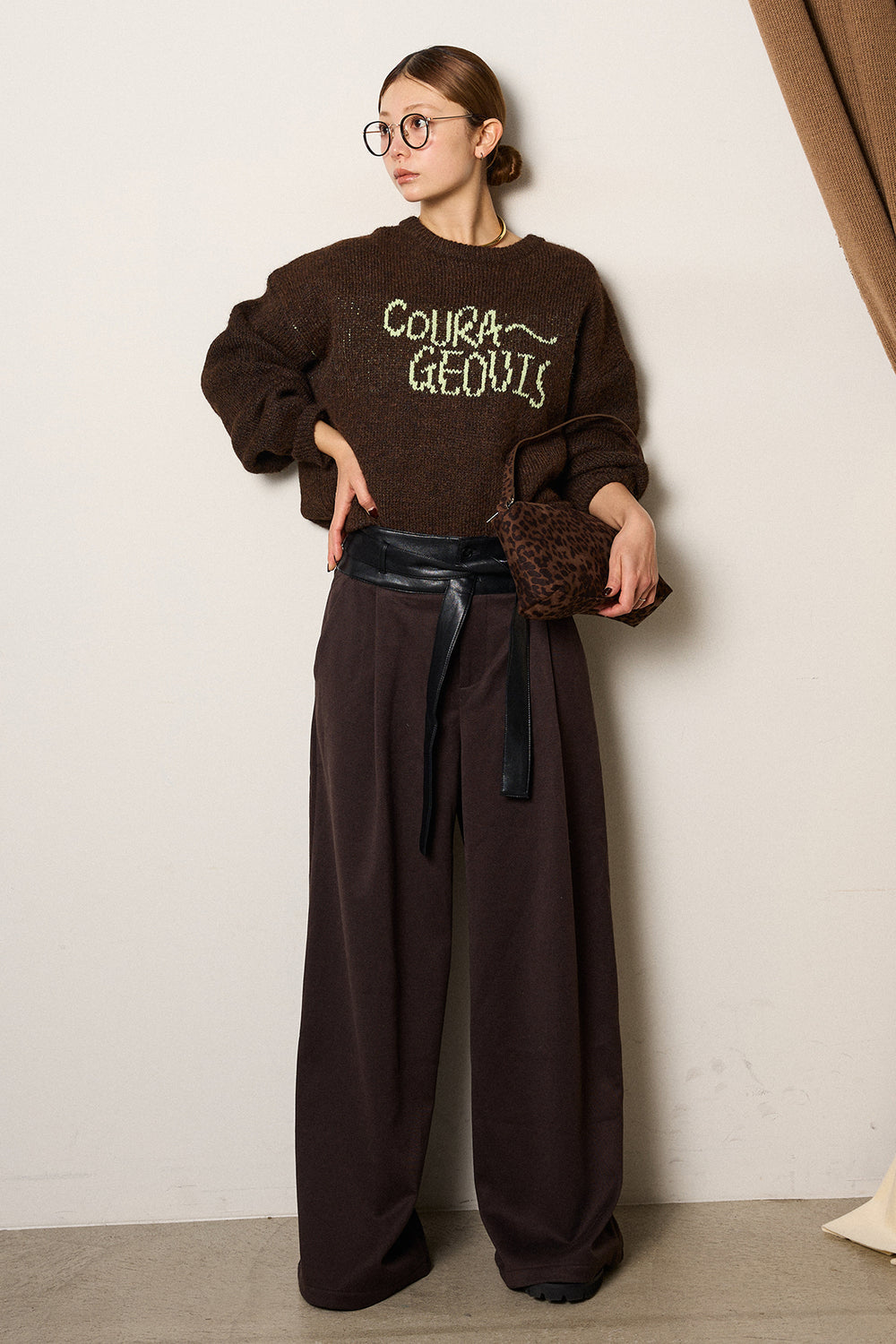 [SET]アニマルジャガード柄ニットトップス+巻ベルトウエストレザーライクワイドパンツ(2set)