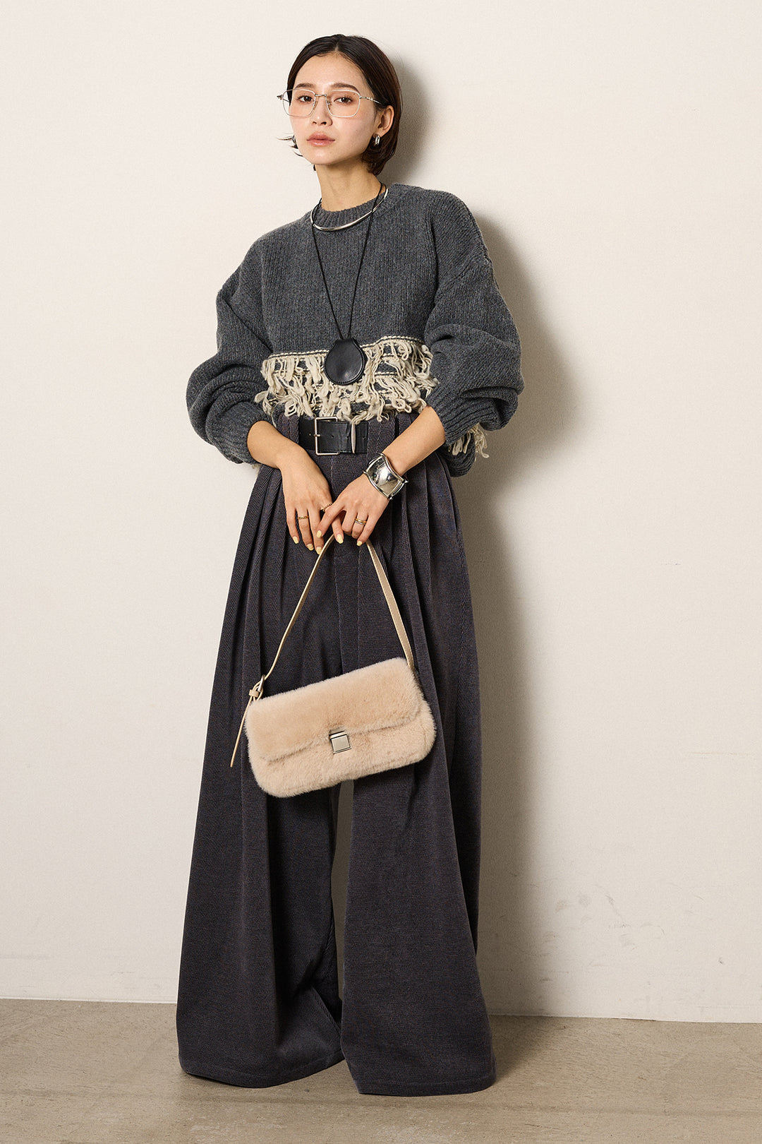 [SET]ロゴシャギーニットプルオーバー+巻ベルトウエストレザーライクワイドパンツ(2set)