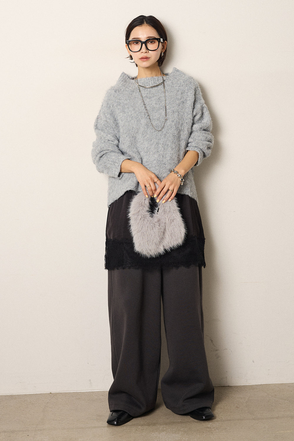 [SET]アルパカタッチオフショルニット+レース切り替えキャミソール+裏起毛スウェットワイドパンツ(3set)
