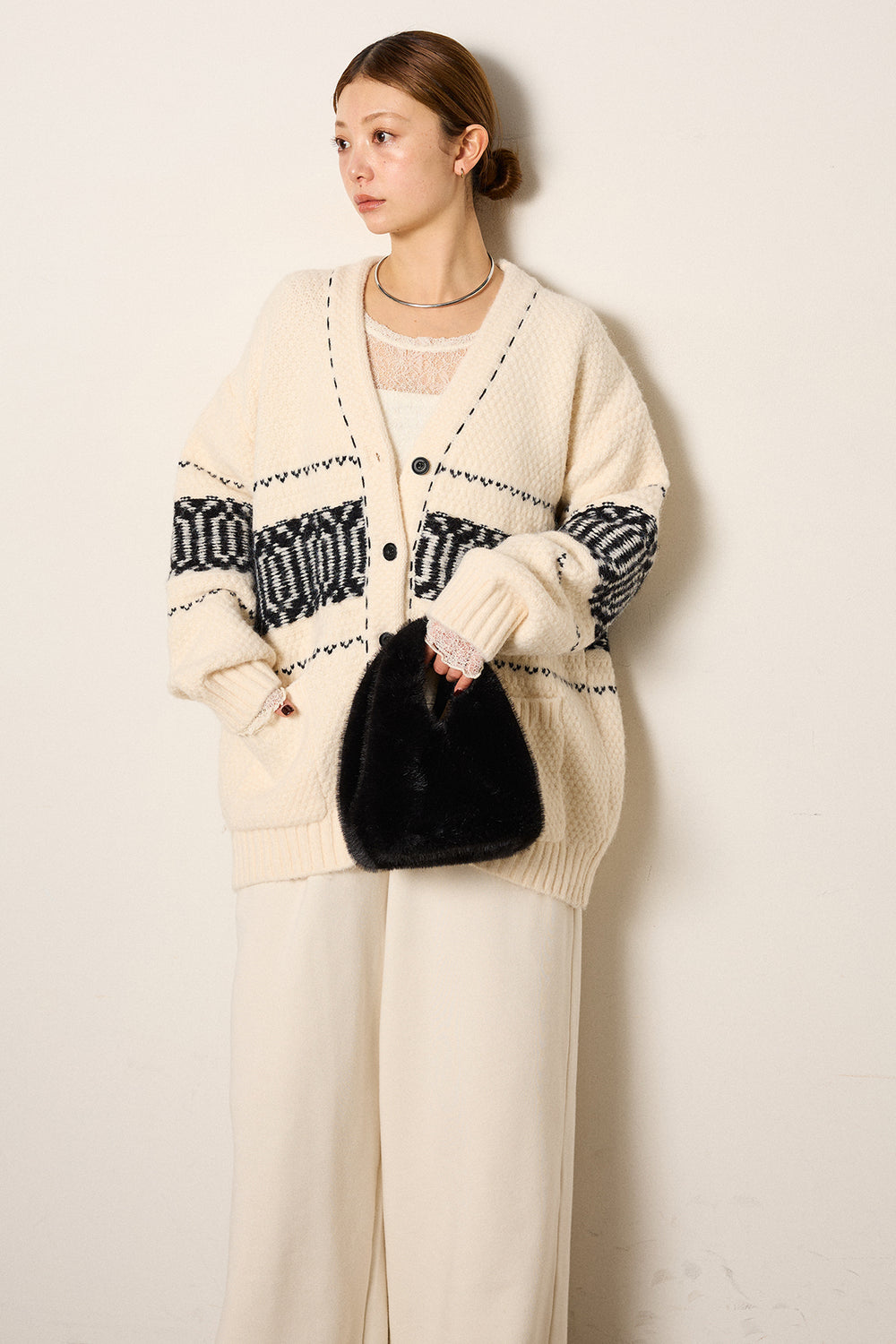 [SET]アラン編みニットノーカラー裾キルティングブルゾン+裏起毛スウェットワイドパンツ(2set)