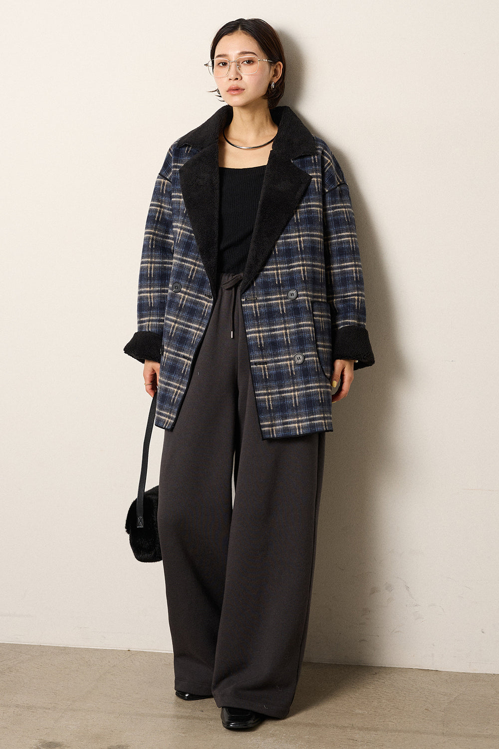 [SET]裏地ボアタータンチェック柄ミディアムコート+裏起毛スウェットワイドパンツ(2set)