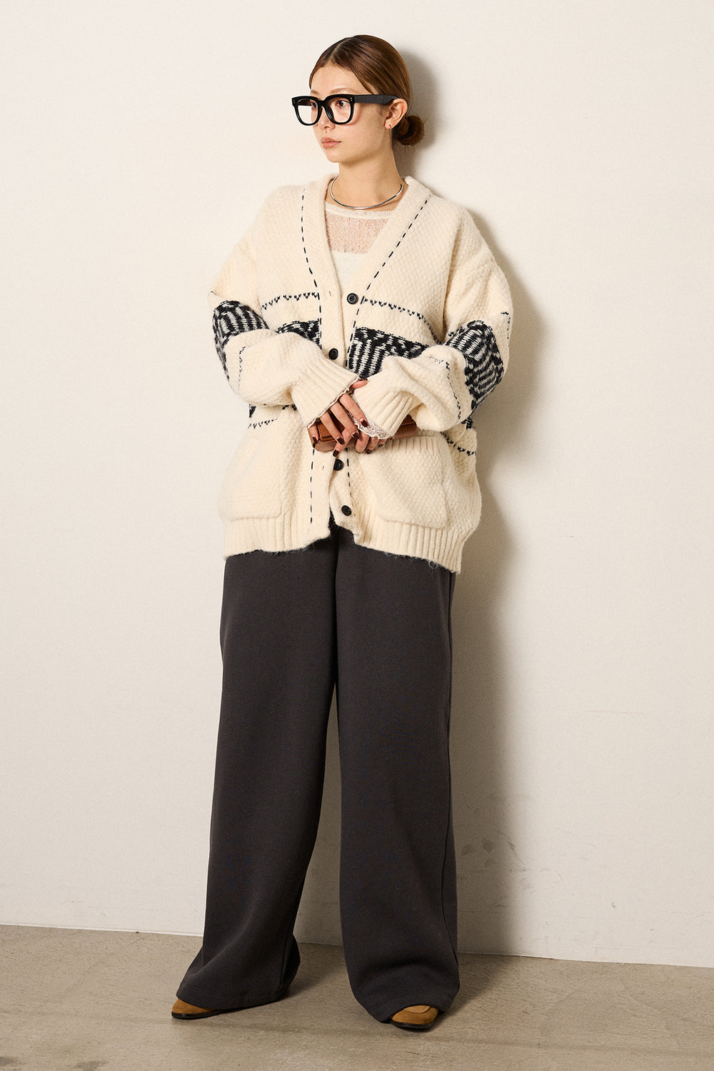 [SET]ライン柄ステッチニットカーディガン+2WAY袖コード刺繍クルーネックプルオーバー+裏起毛スウェットワイドパンツ(3set)