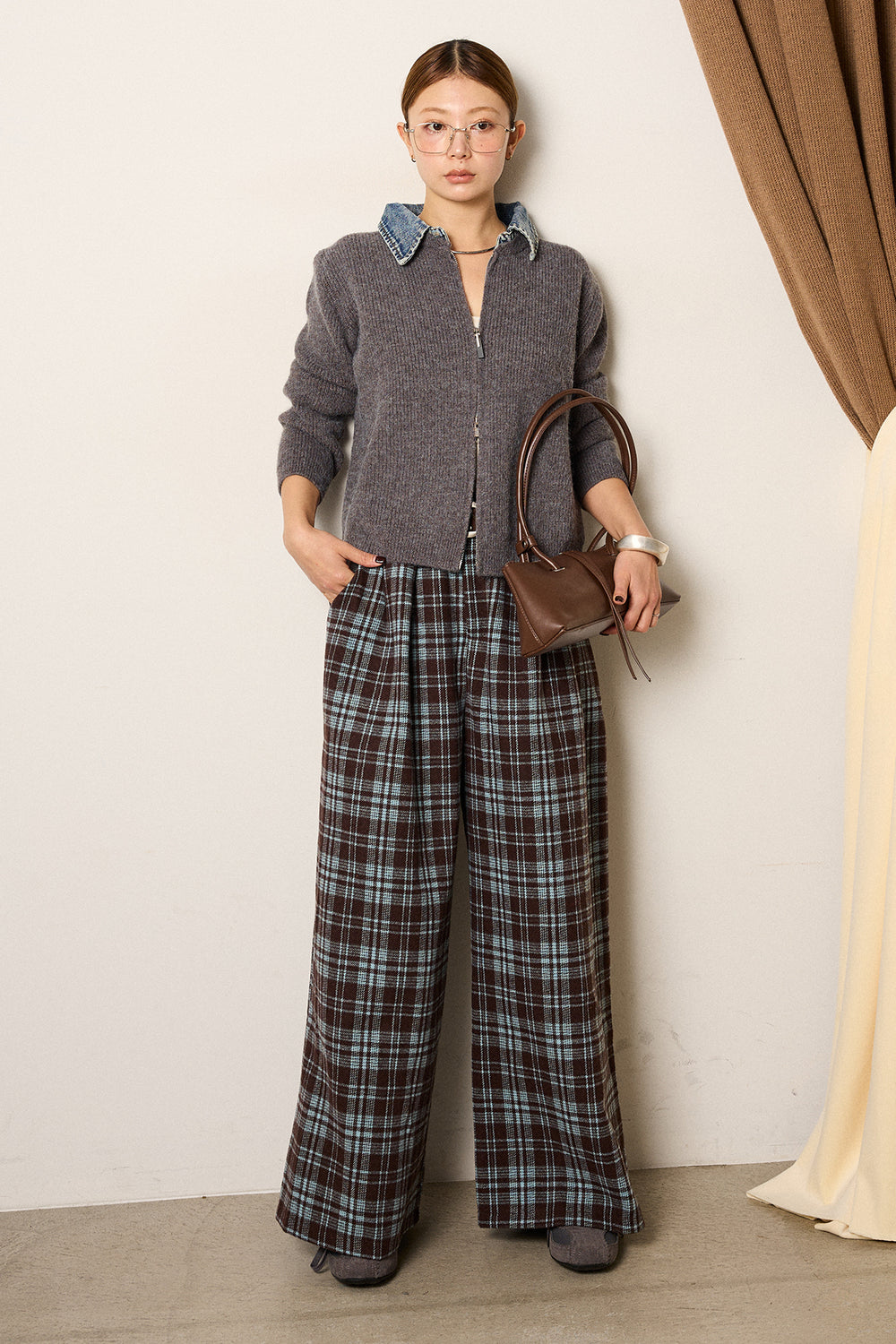 [SET]デニム襟ダブルジップニットトップス+スタッズデザインベルトタータンチェックパンツ(2set)