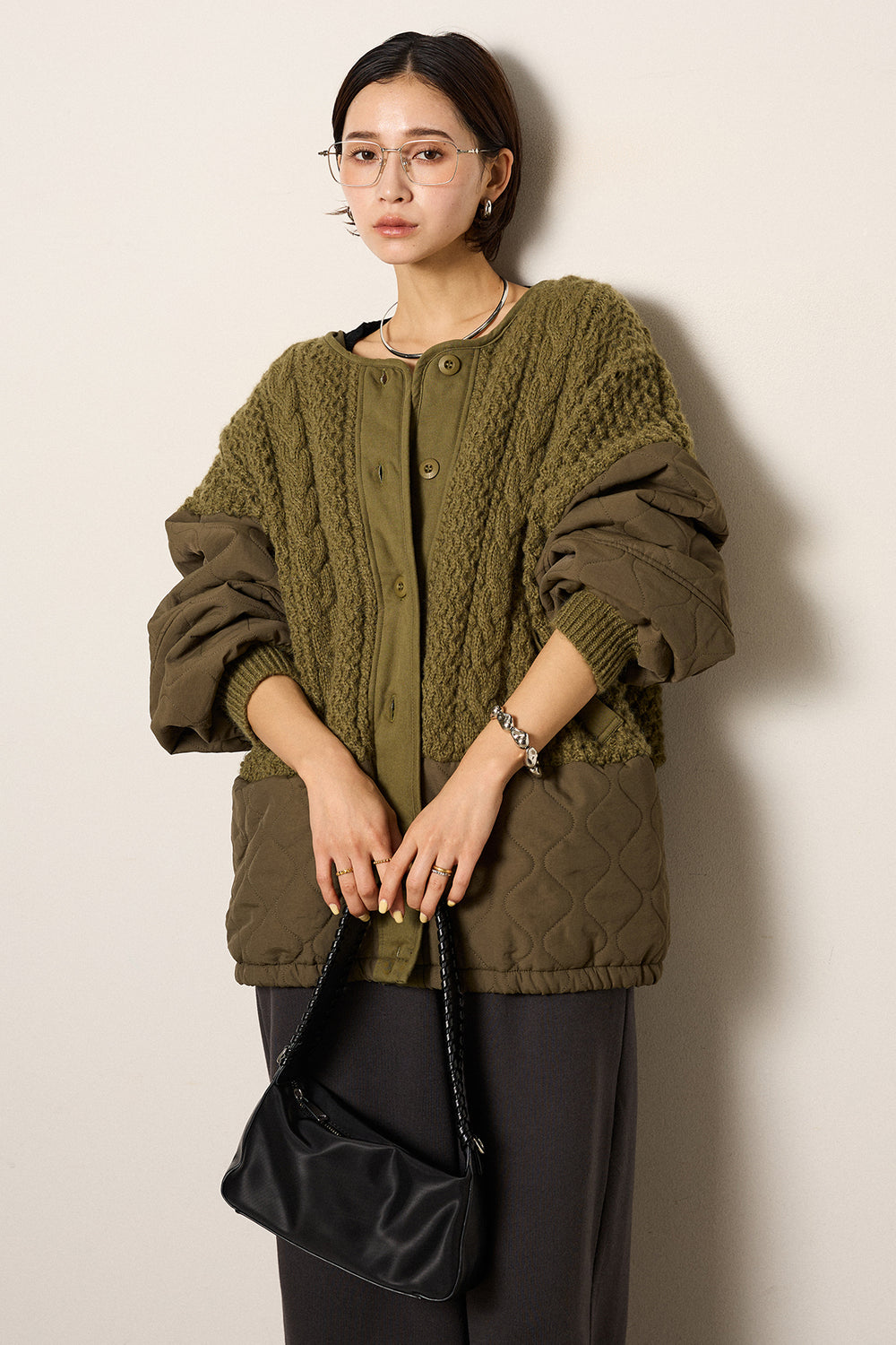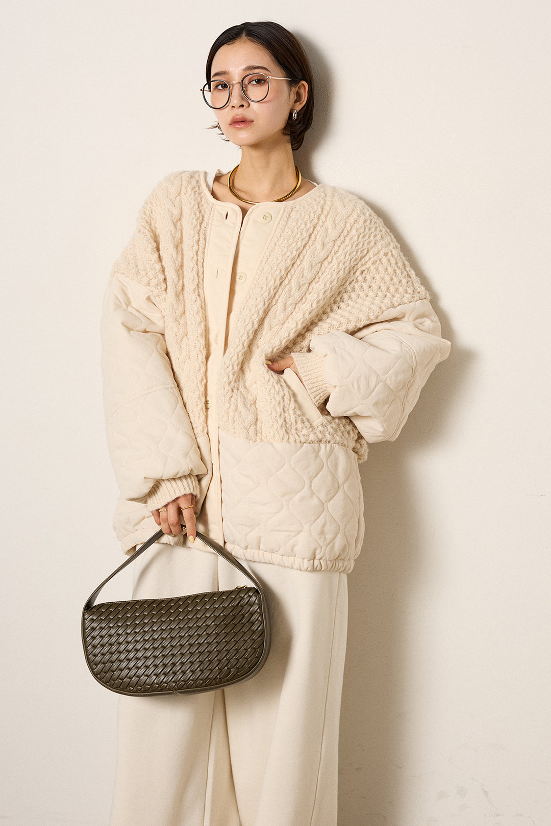 アラン編みニットノーカラー裾キルティングブルゾン
