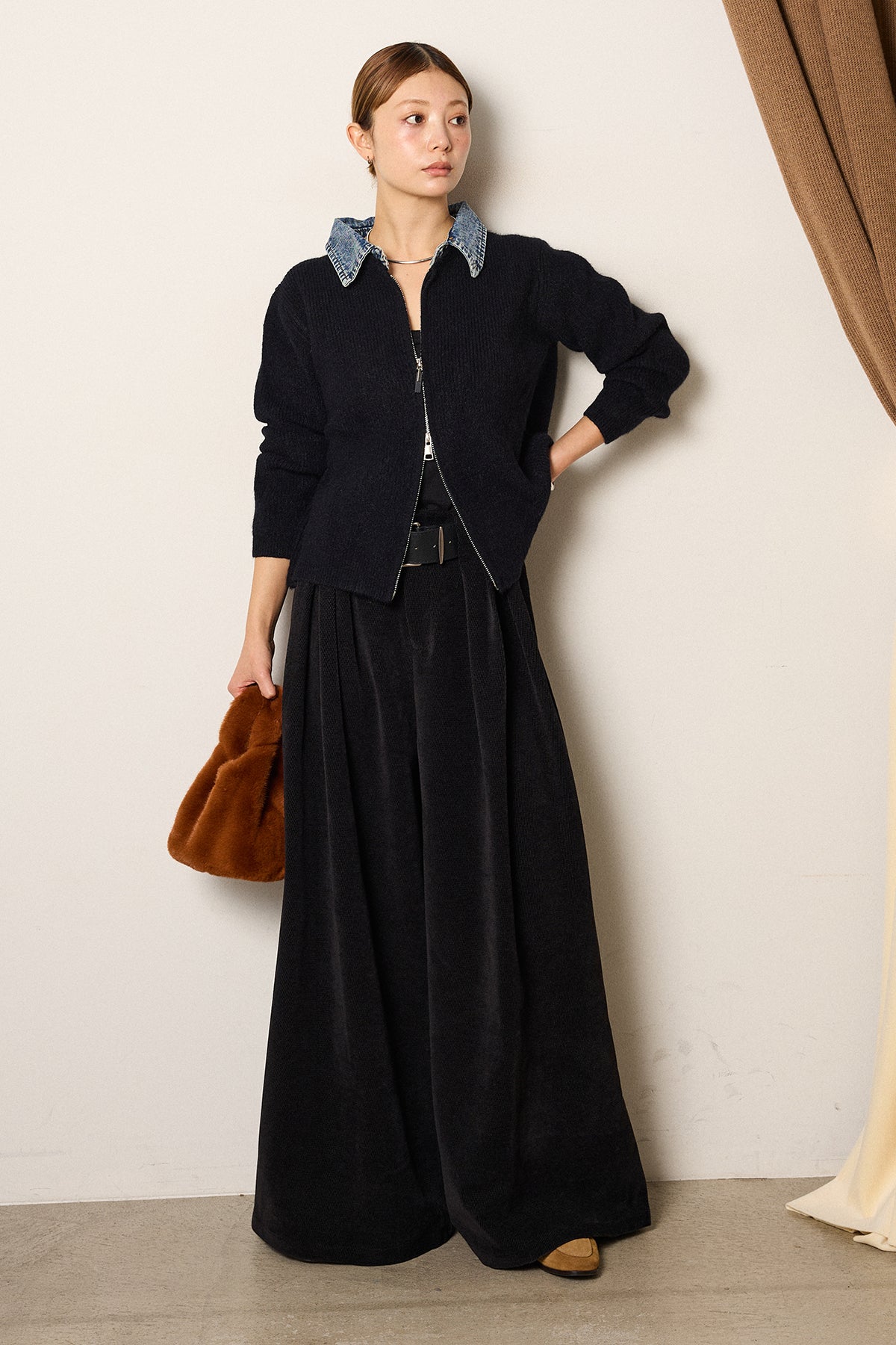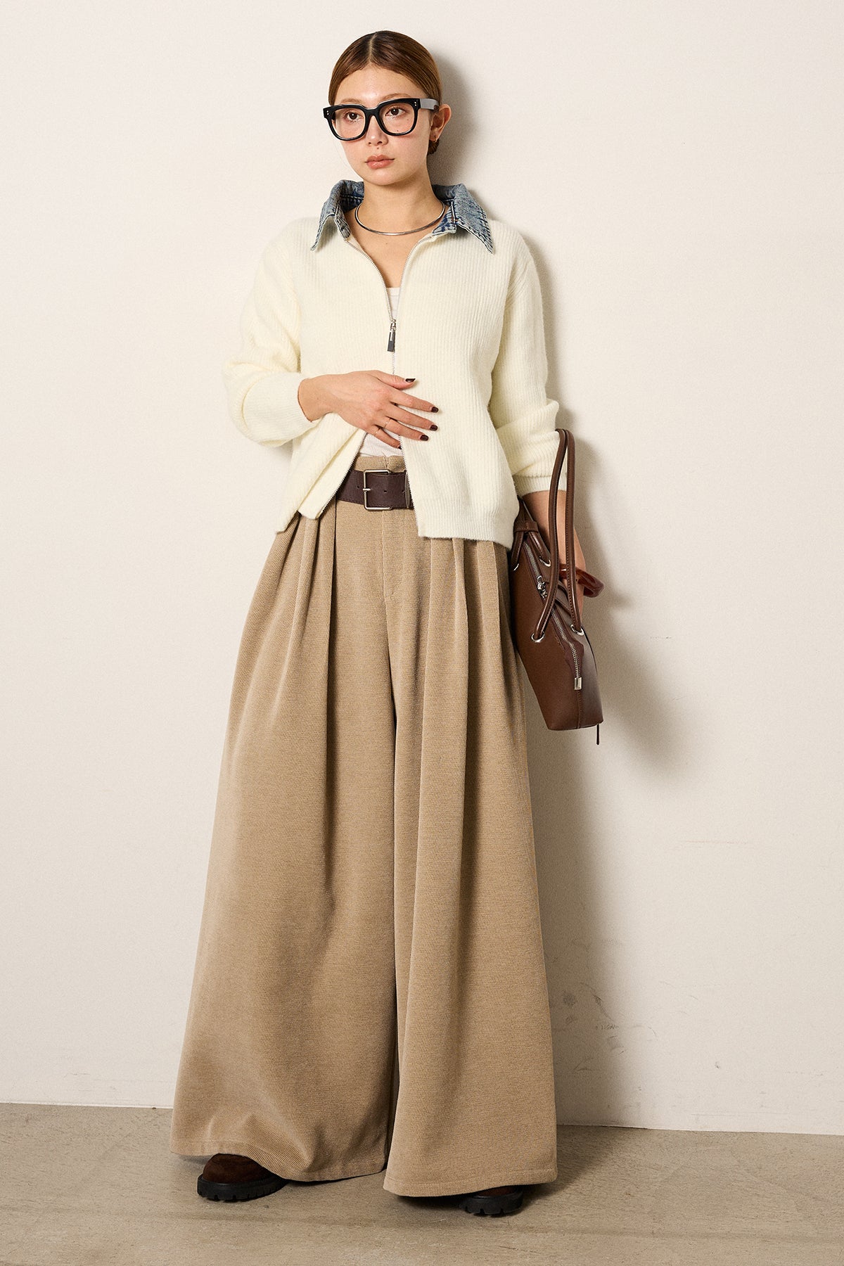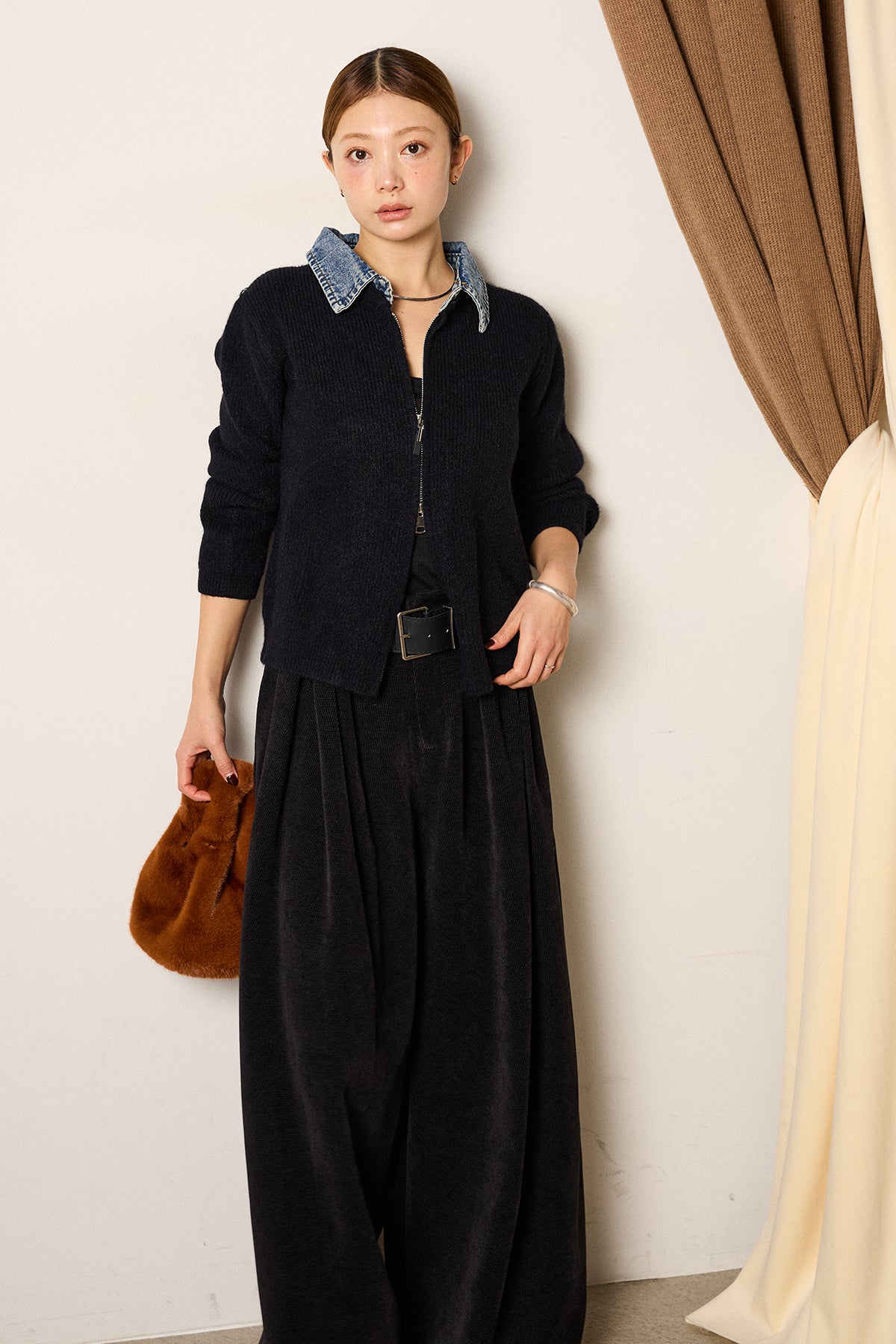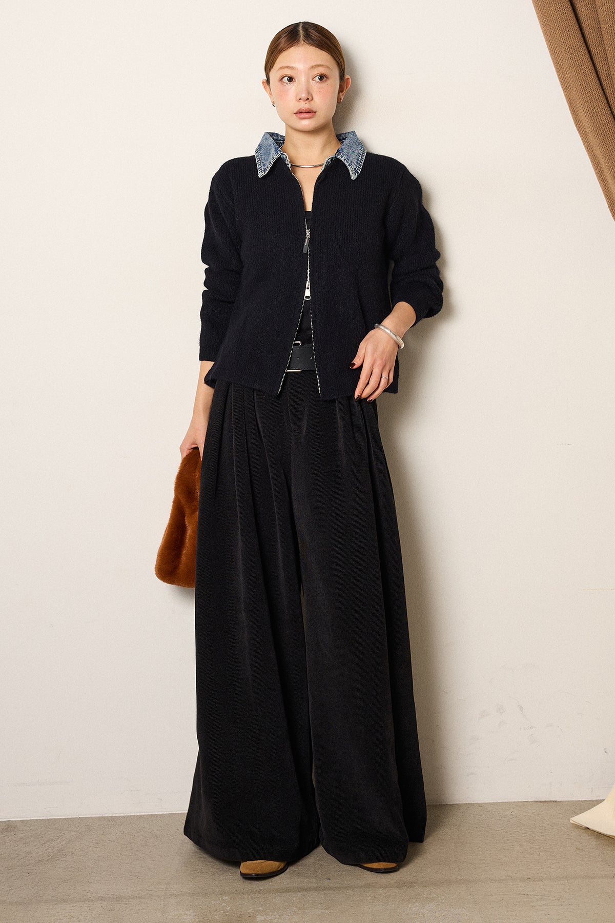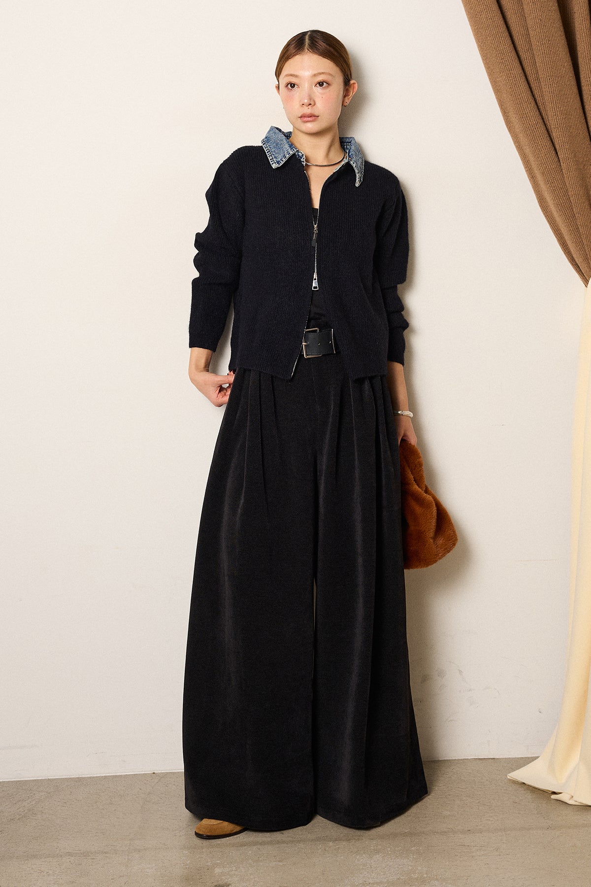 [SET]デニム襟ダブルジップニットトップス+ベルトループコーデュロイワイドパンツ(2set)