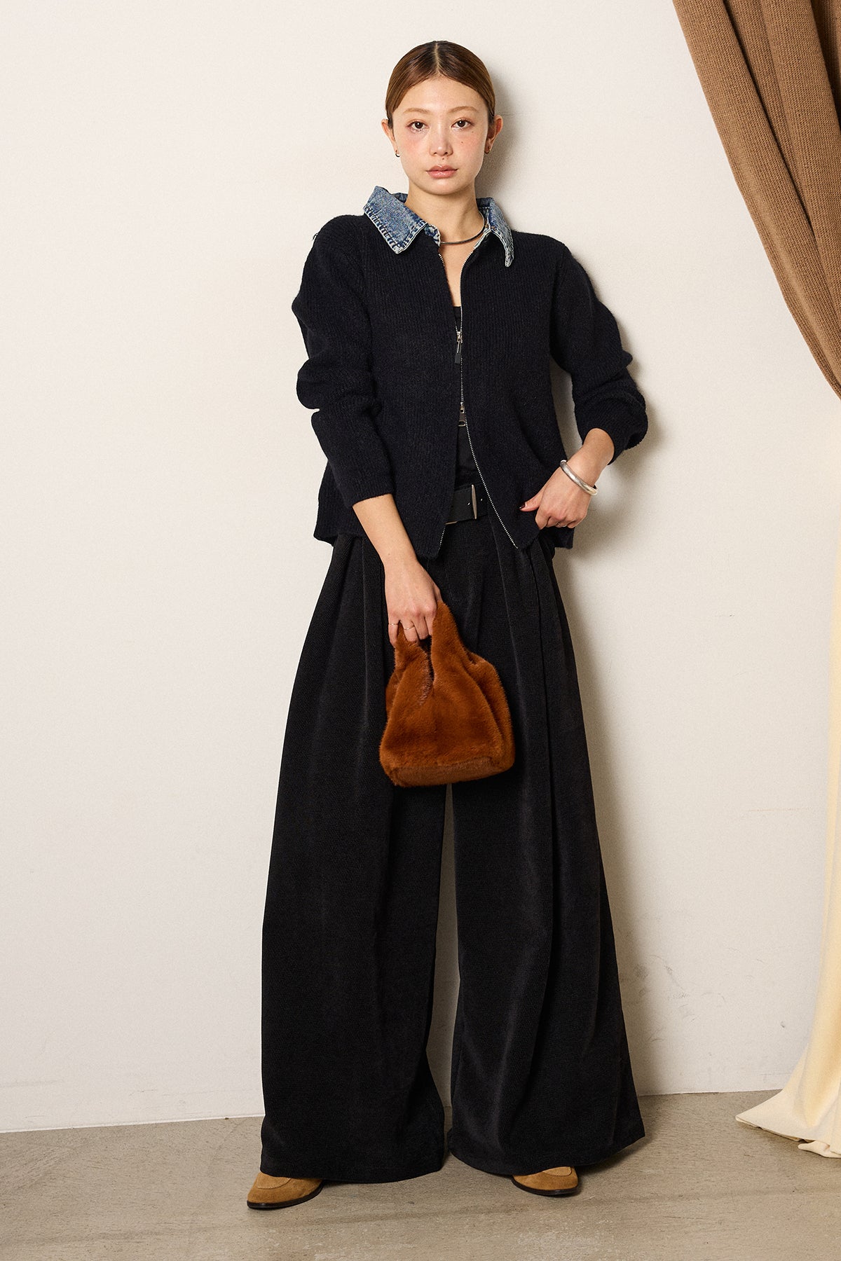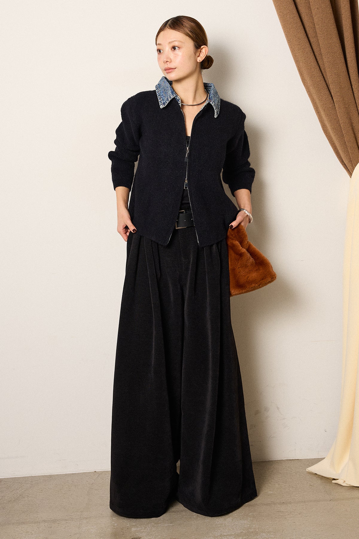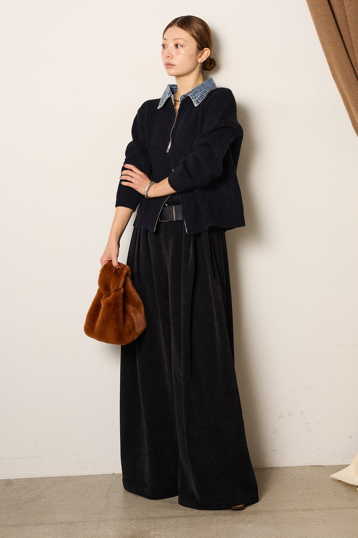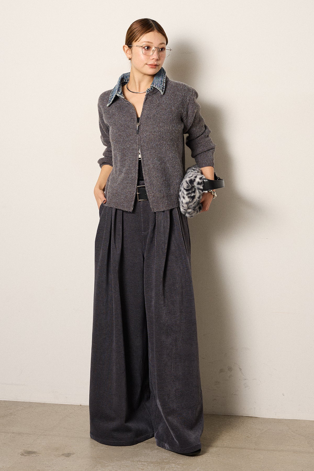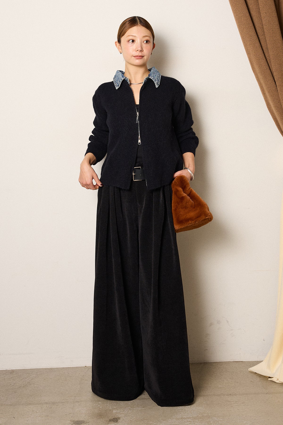 [SET]デニム襟ダブルジップニットトップス+ベルトループコーデュロイワイドパンツ(2set)
