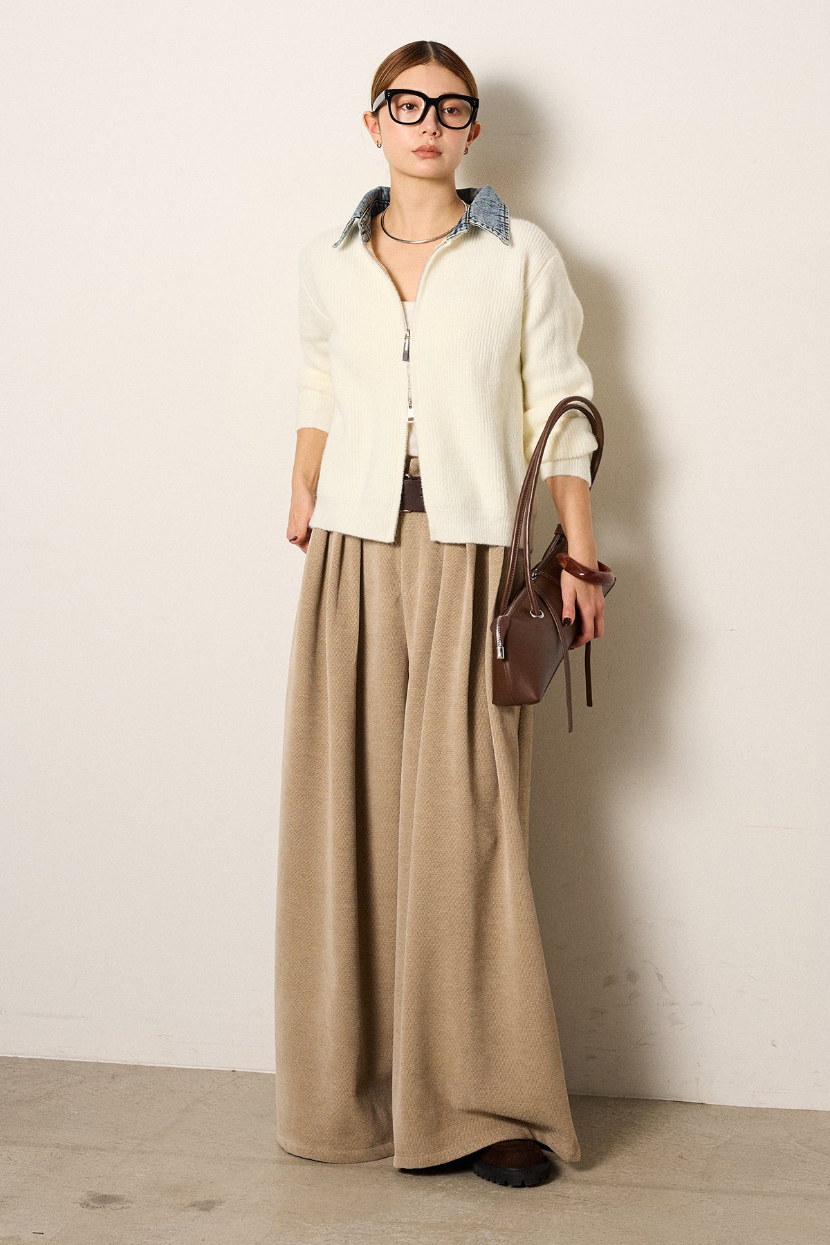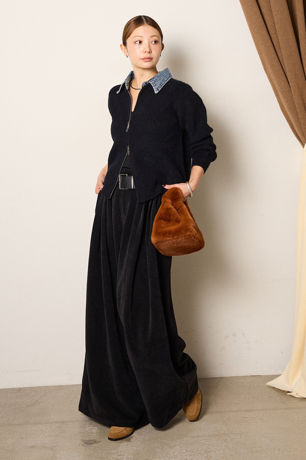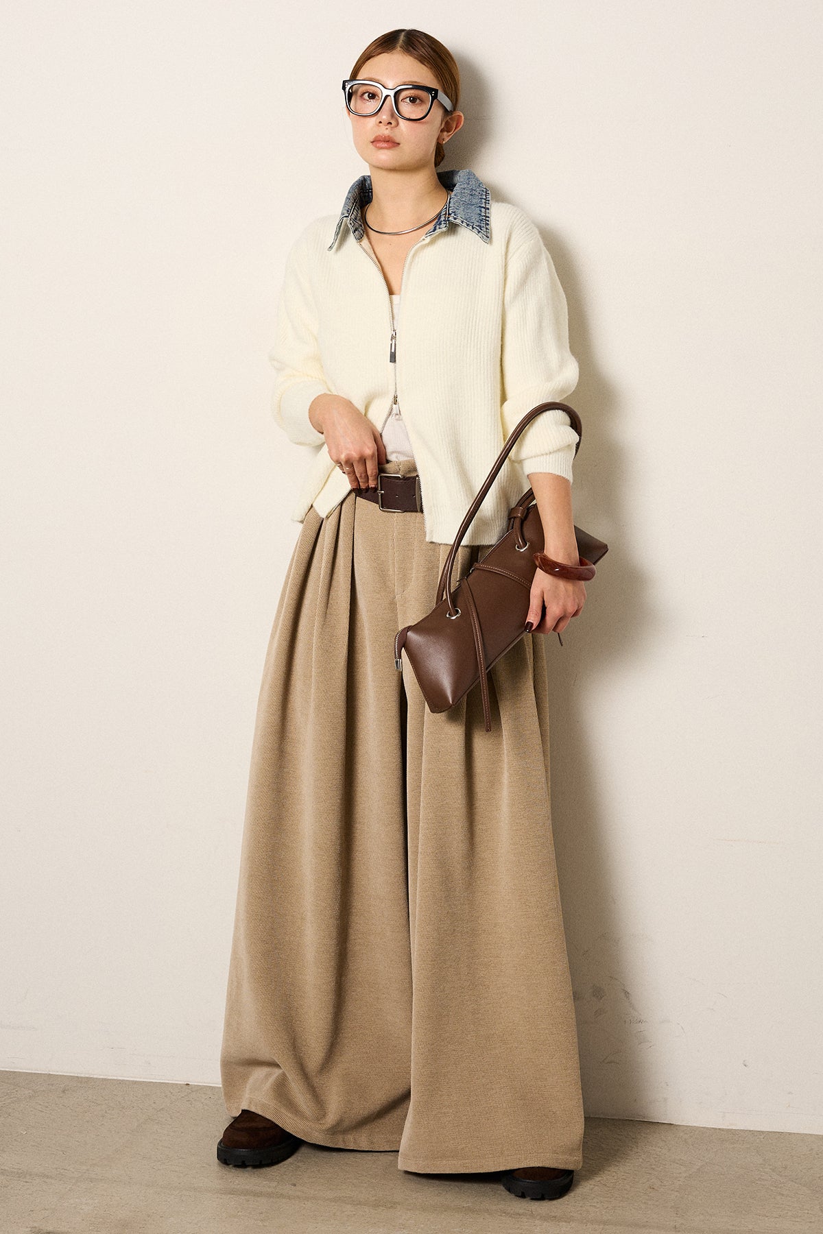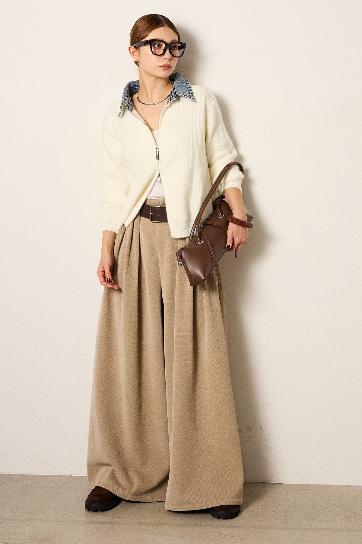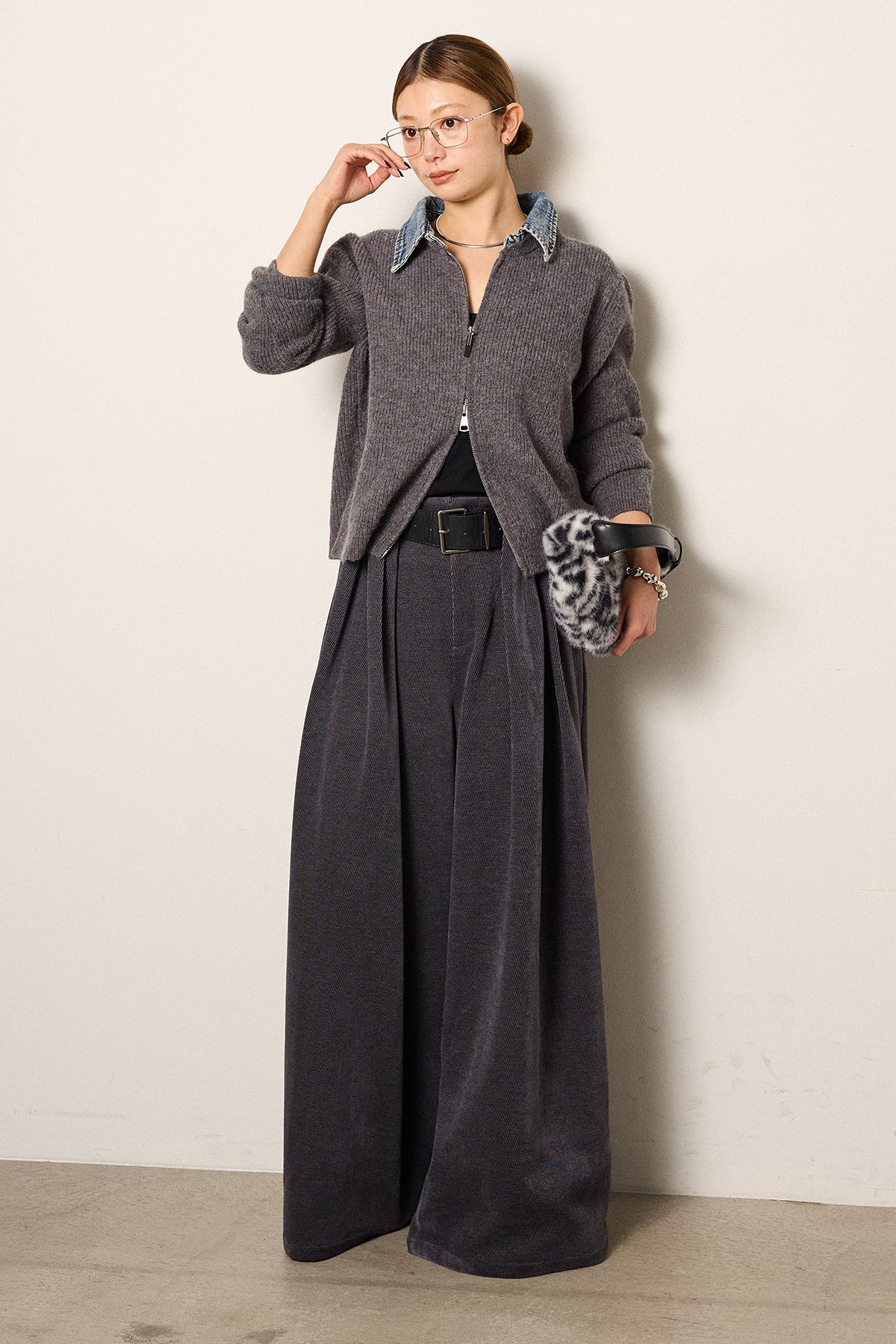[SET]デニム襟ダブルジップニットトップス+ベルトループコーデュロイワイドパンツ(2set)