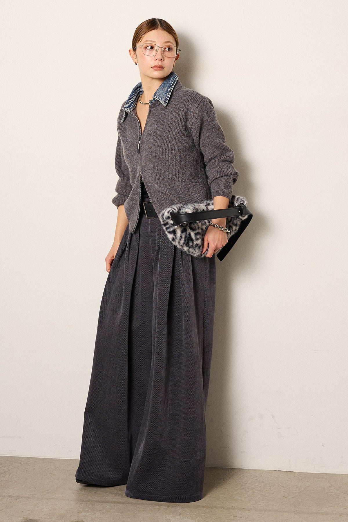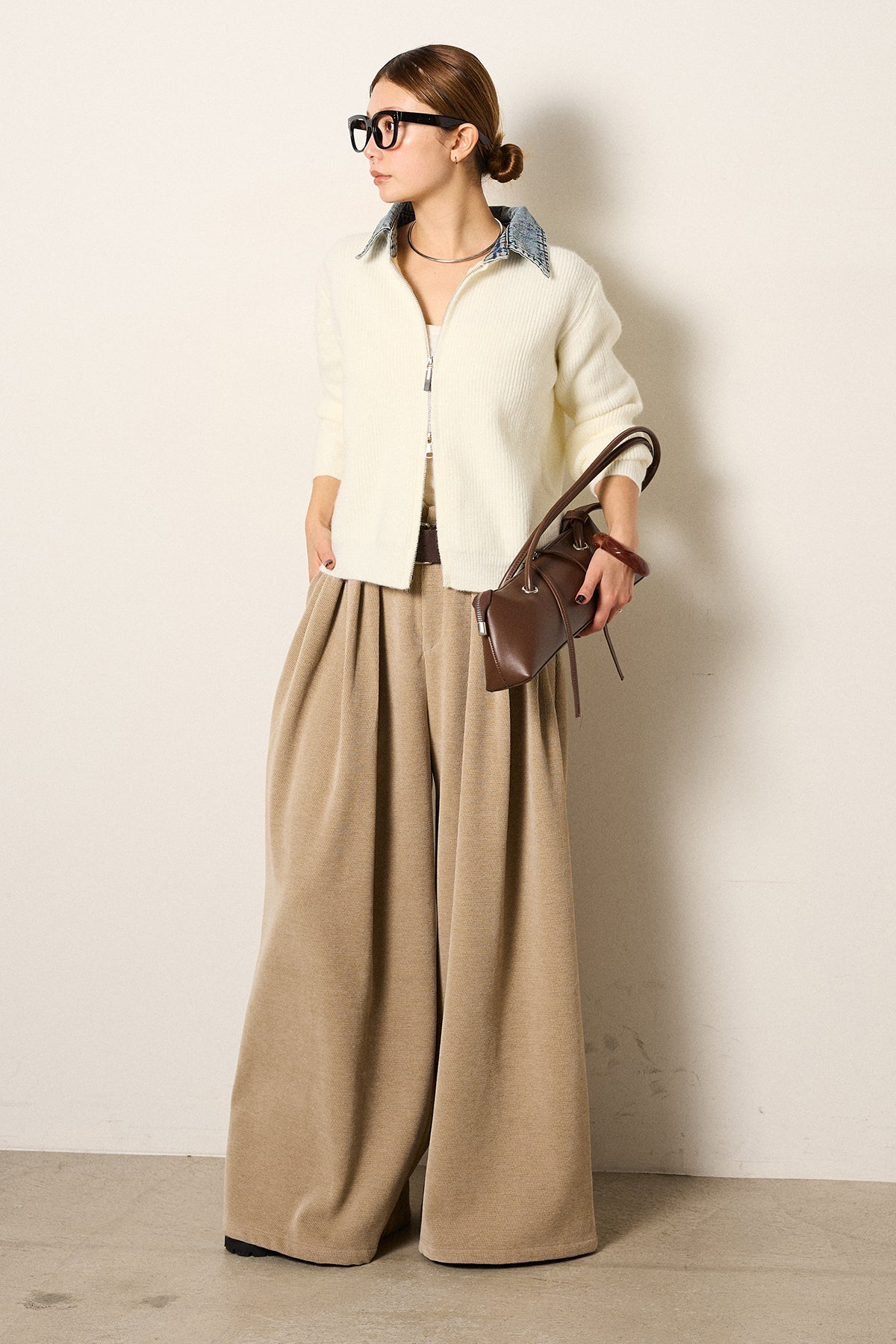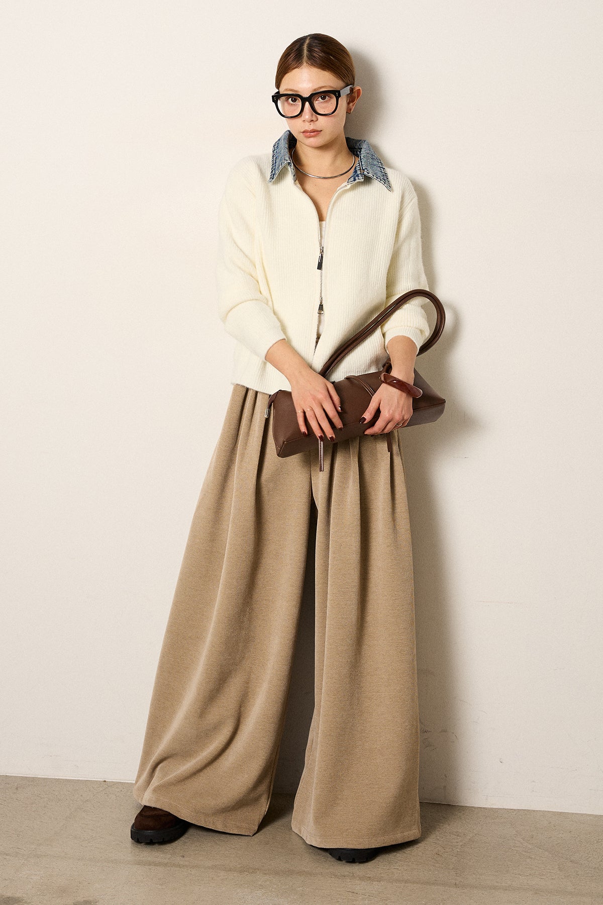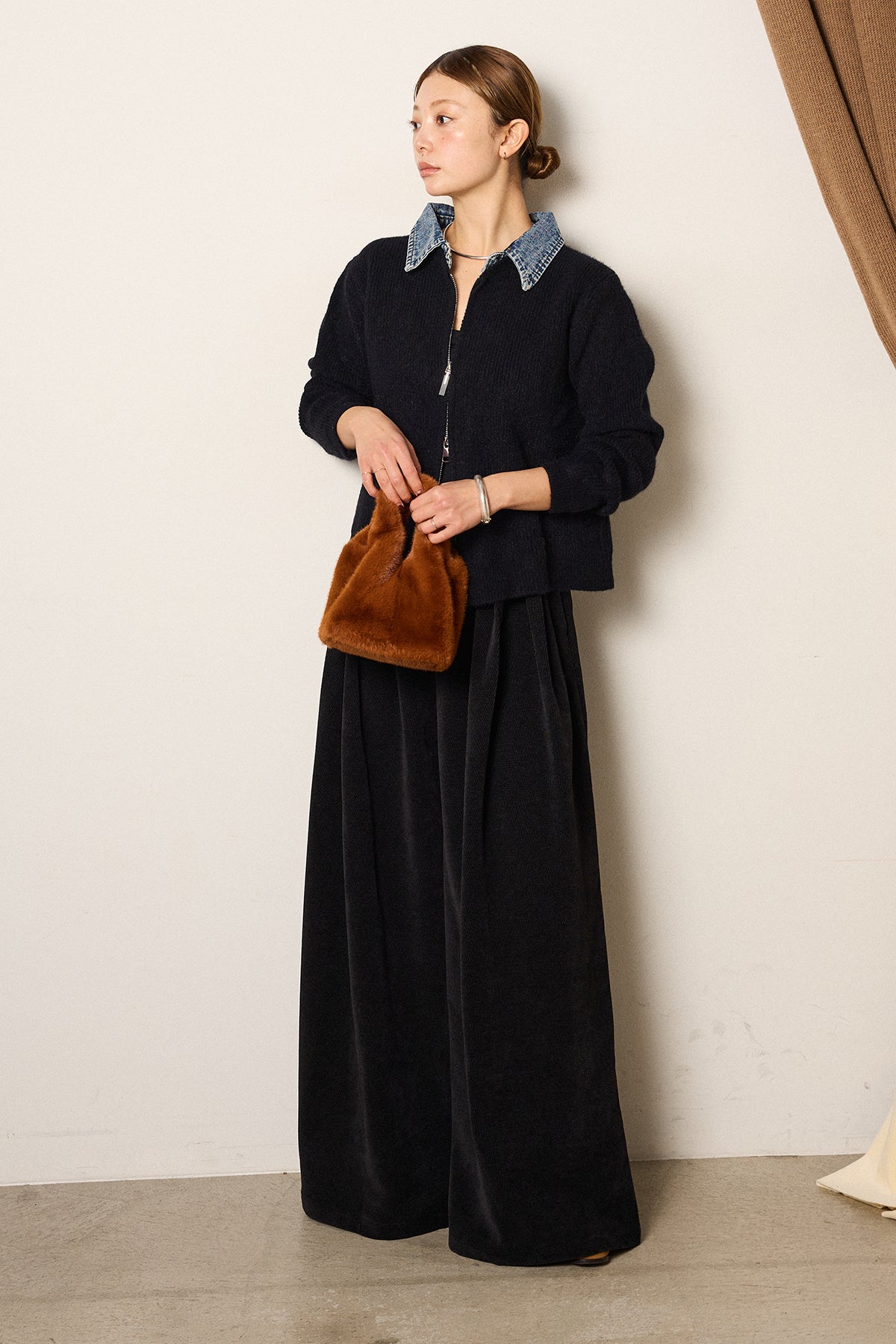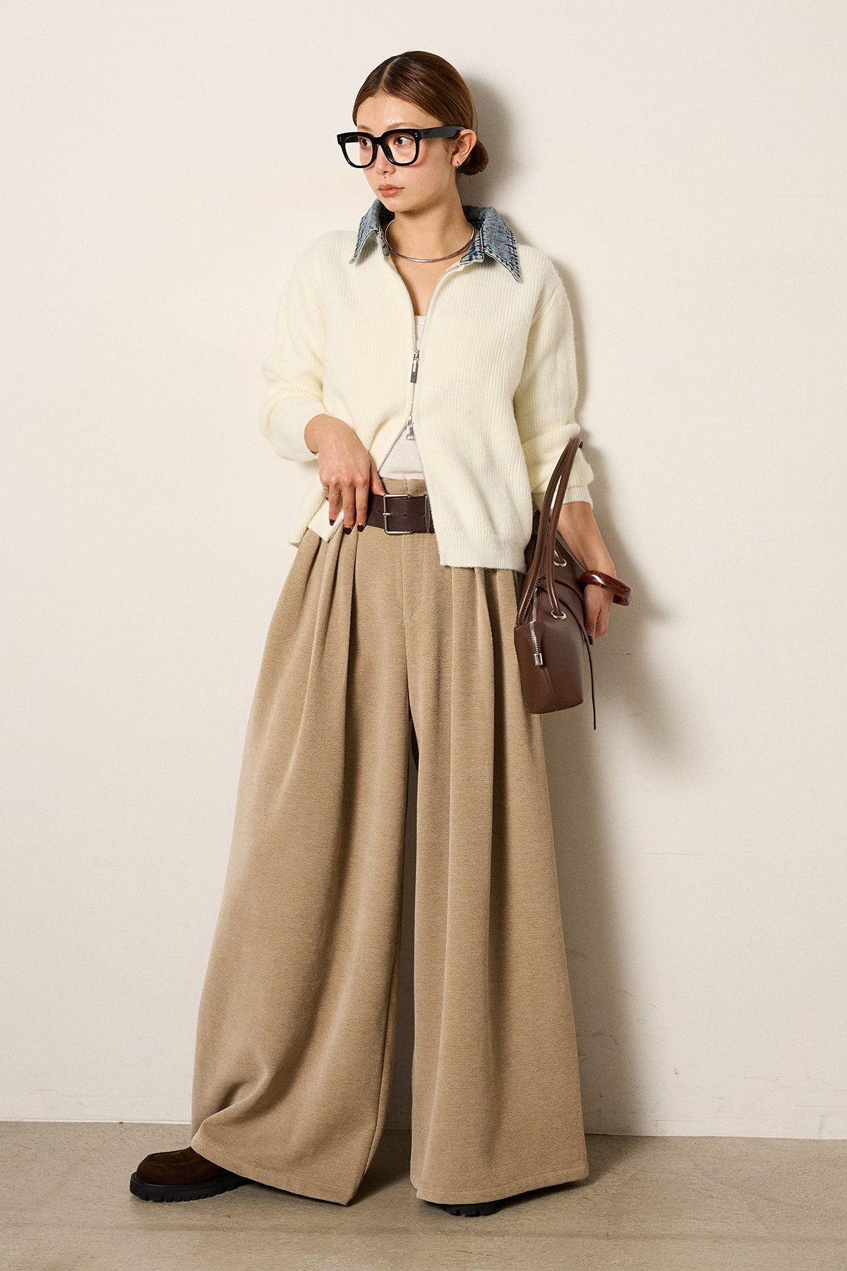 [SET]デニム襟ダブルジップニットトップス+ベルトループコーデュロイワイドパンツ(2set)