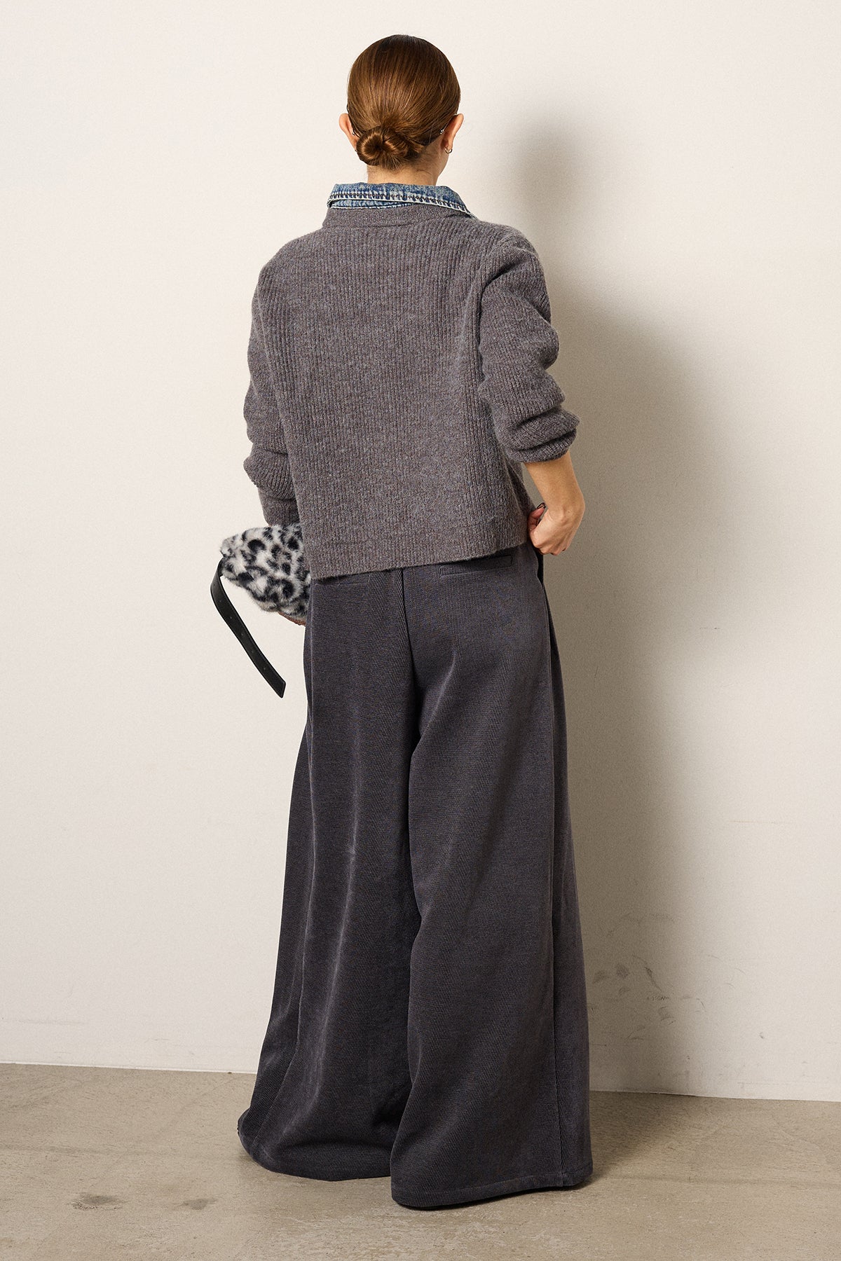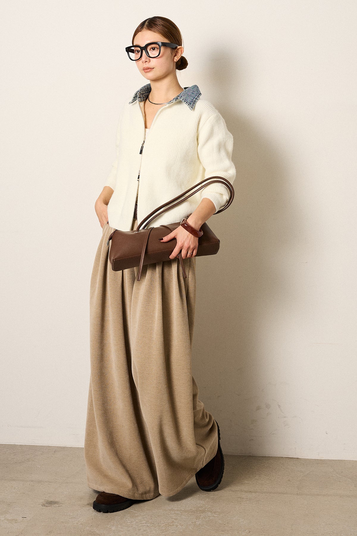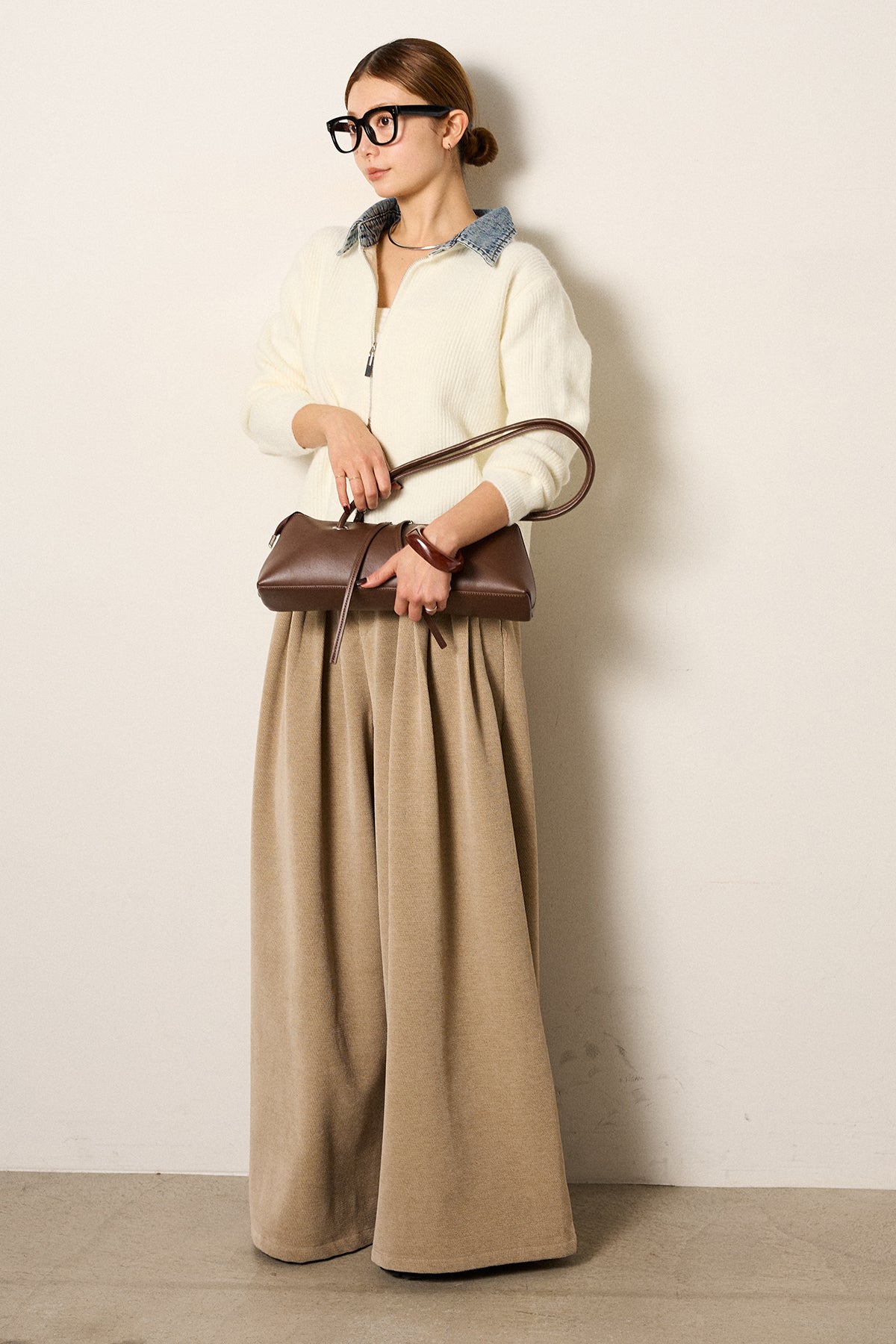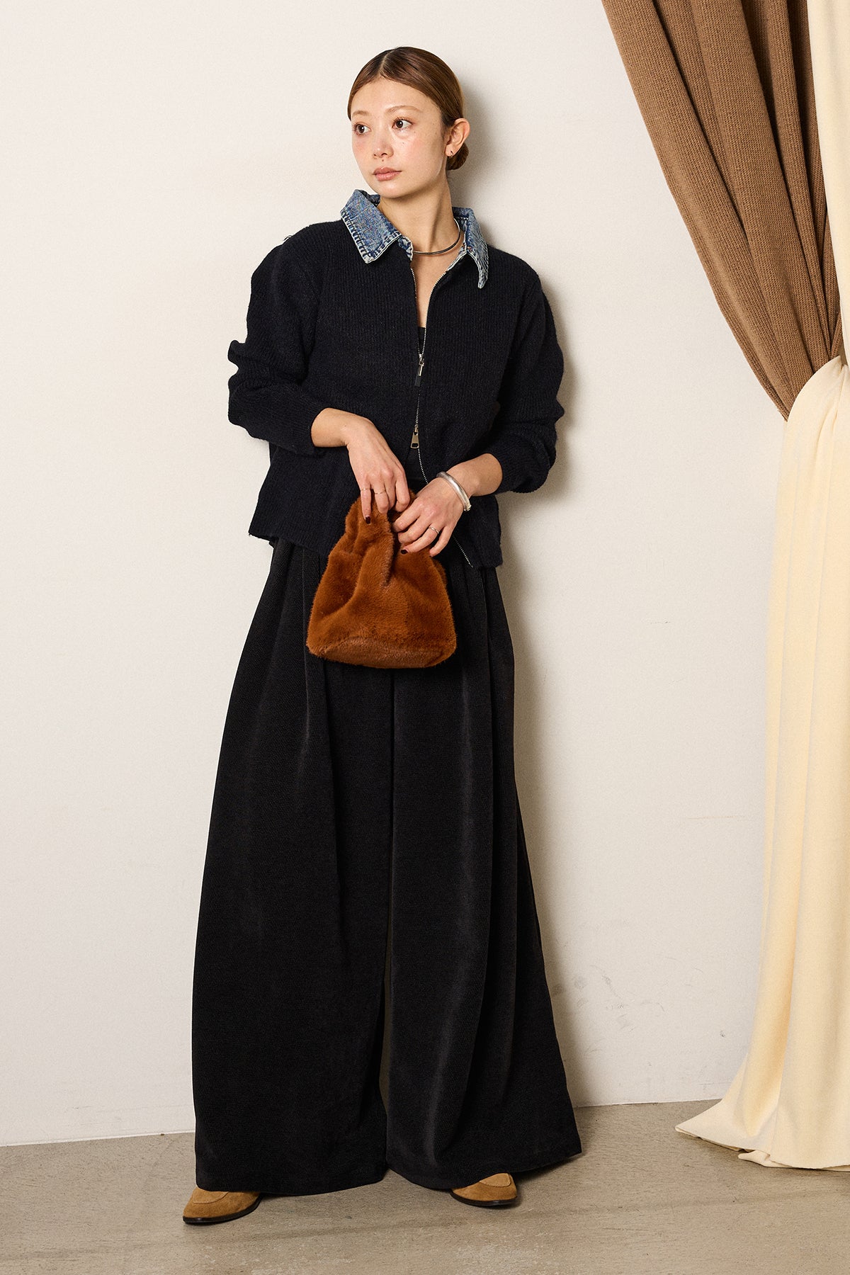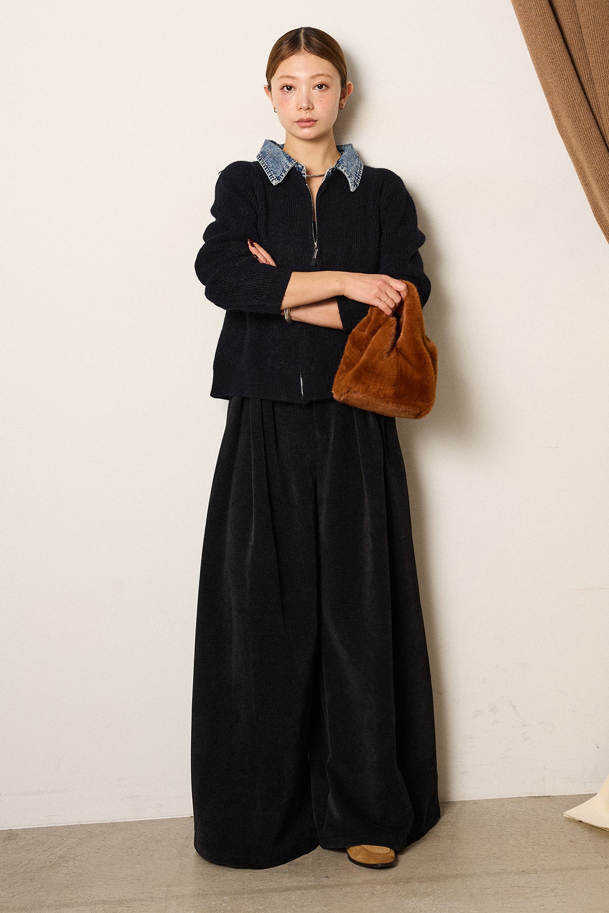 [SET]デニム襟ダブルジップニットトップス+ベルトループコーデュロイワイドパンツ(2set)