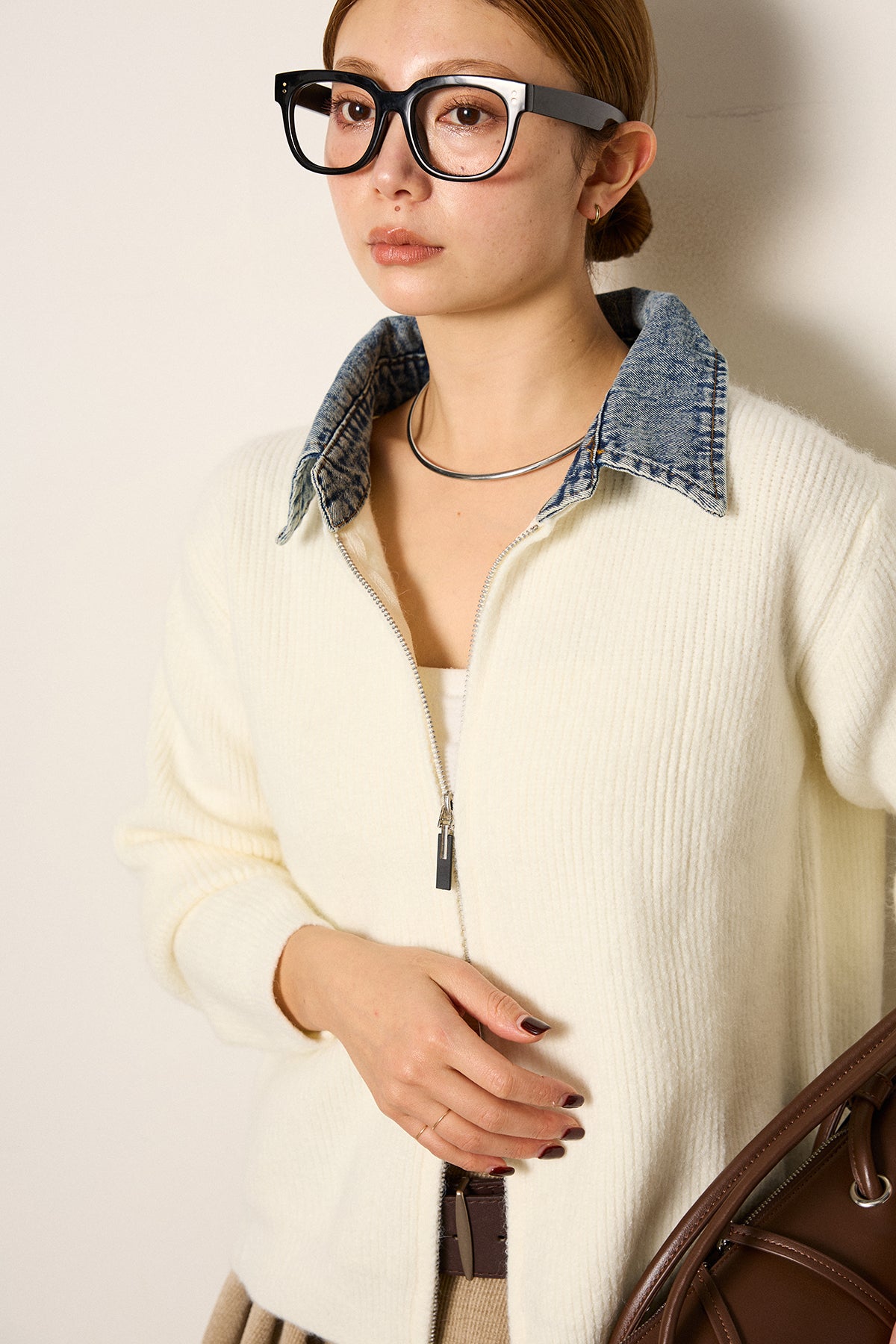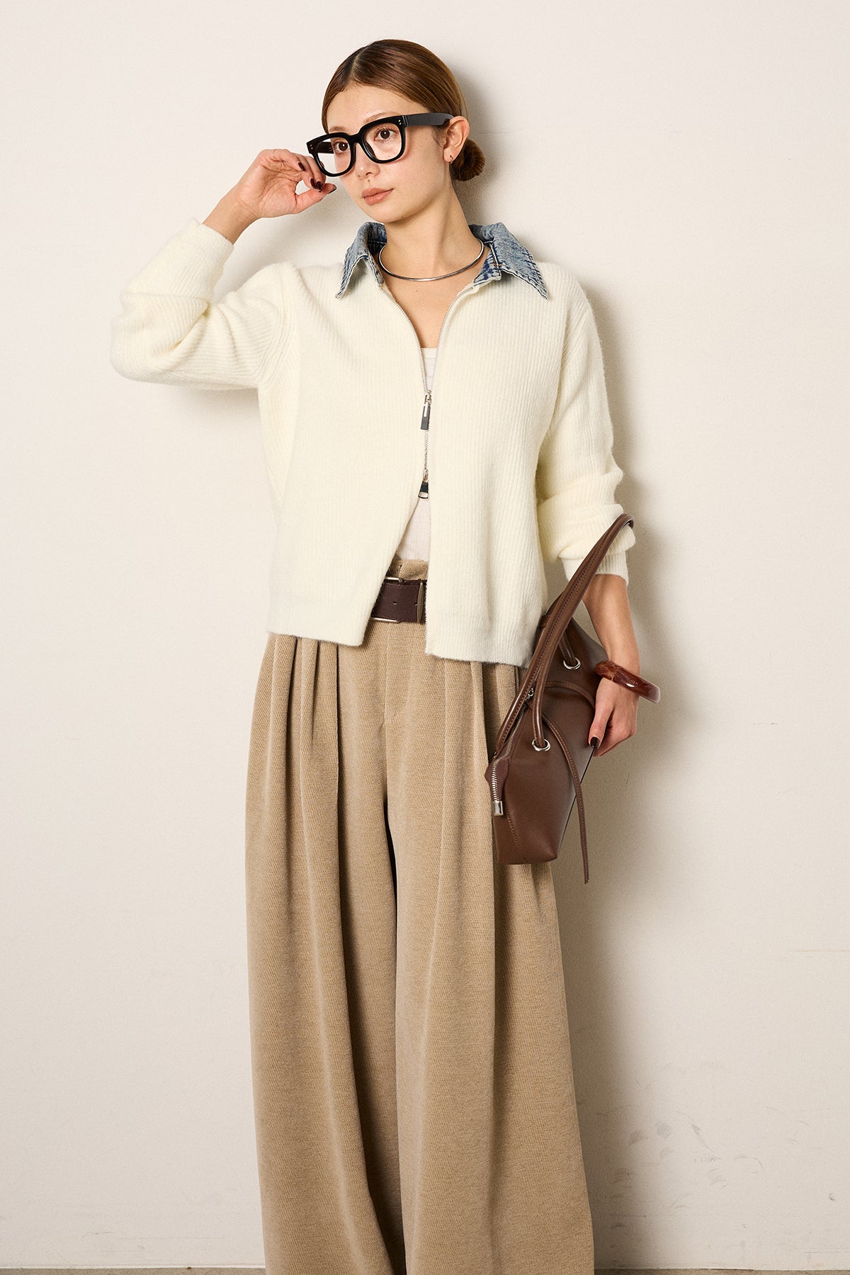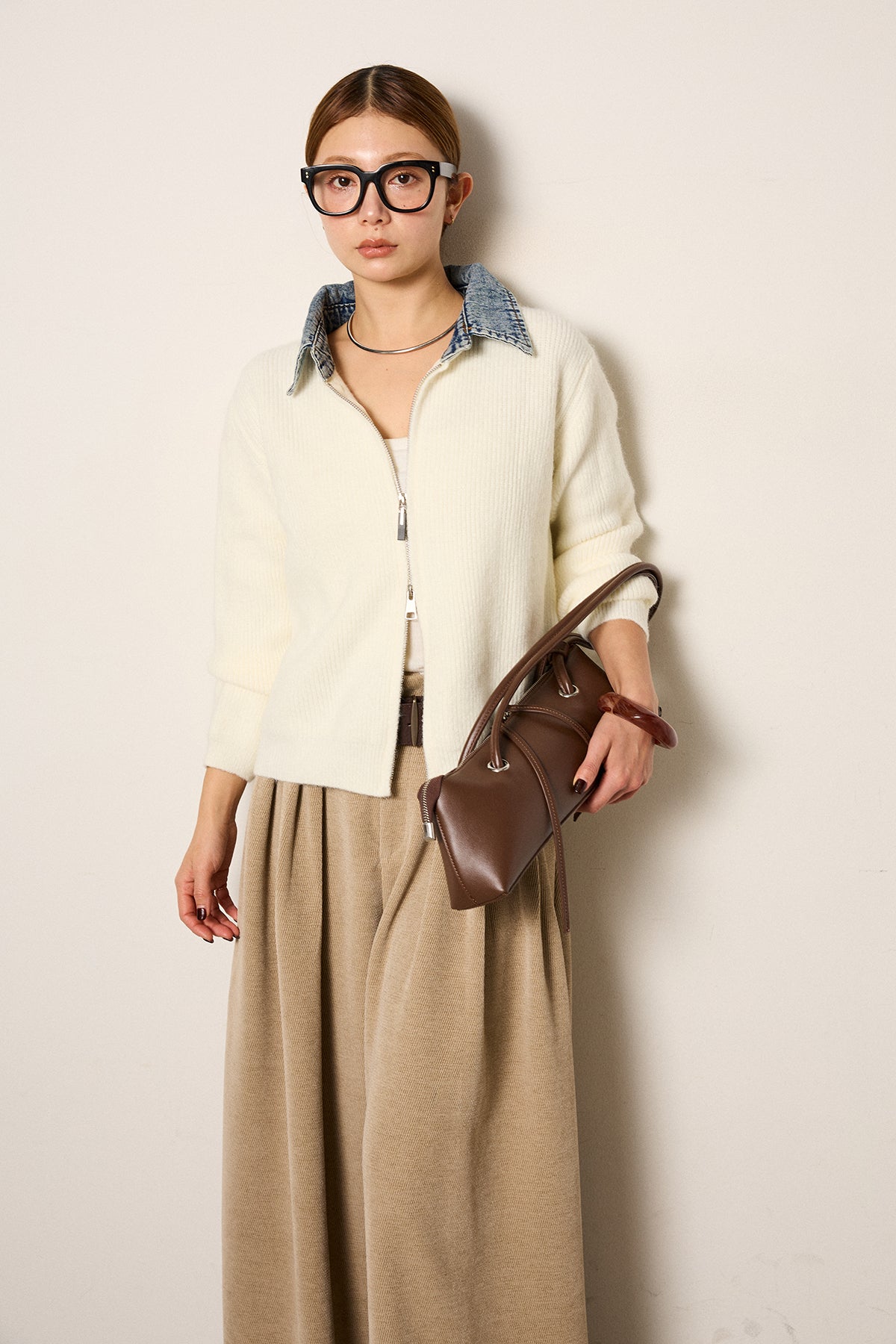 デニム素材の襟を組み合わせたダブルジップデザインのニットトップス。カジュアルな要素をミックスしつつ、コンパクトなシルエットで大人っぽく着られる一枚。ジップは上下どちらからも開閉でき、スタイリングに合わせて表情を変えられるのもポイント。シンプルなボトムスでもバランスが取りやすく、日常使いしやすいデザインです。