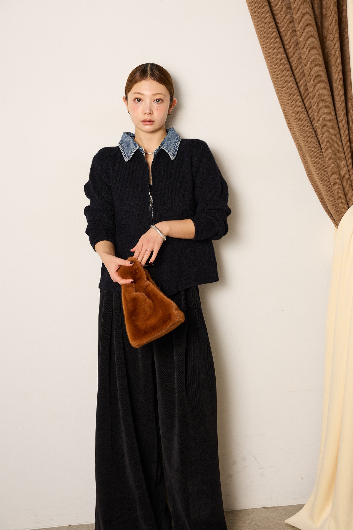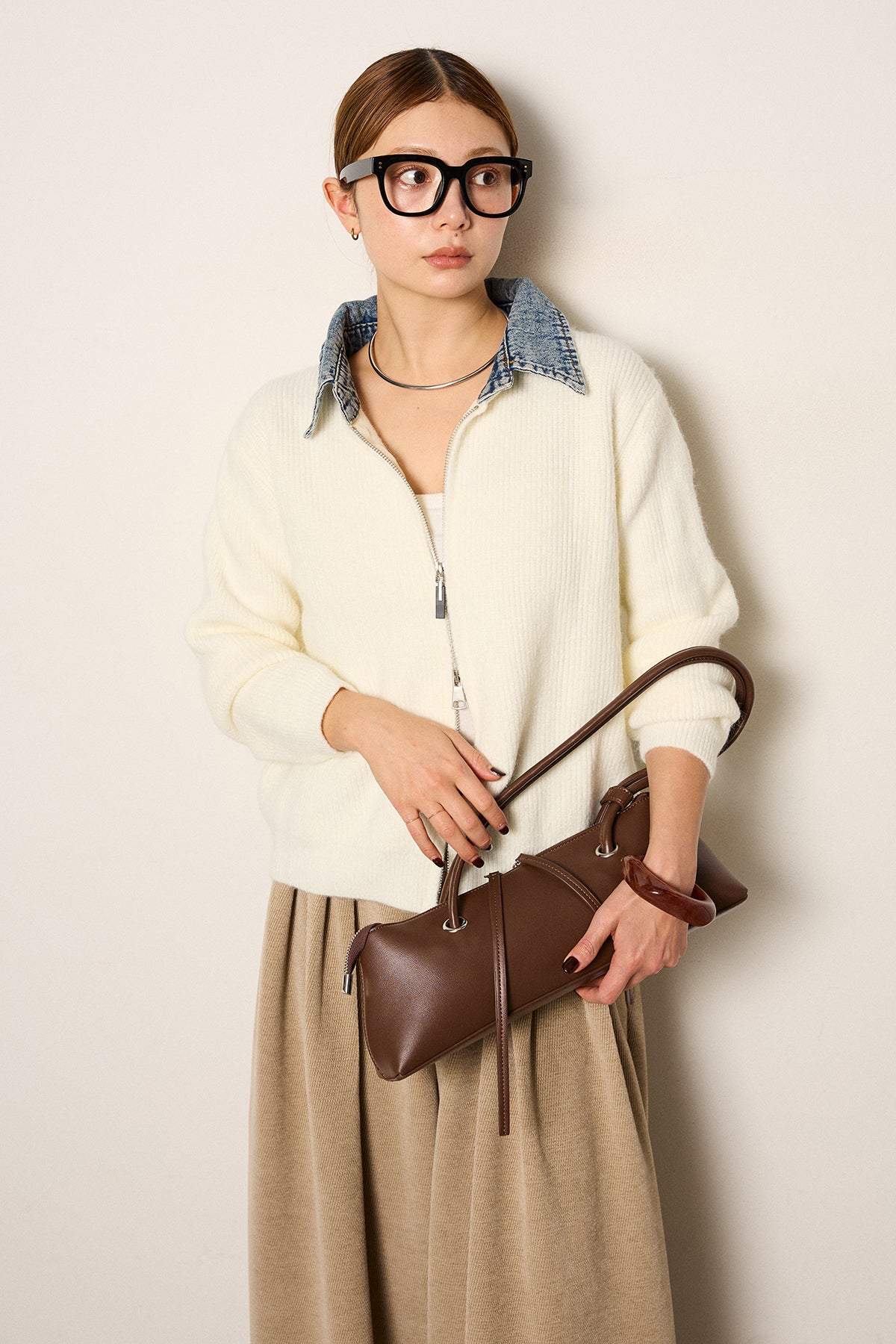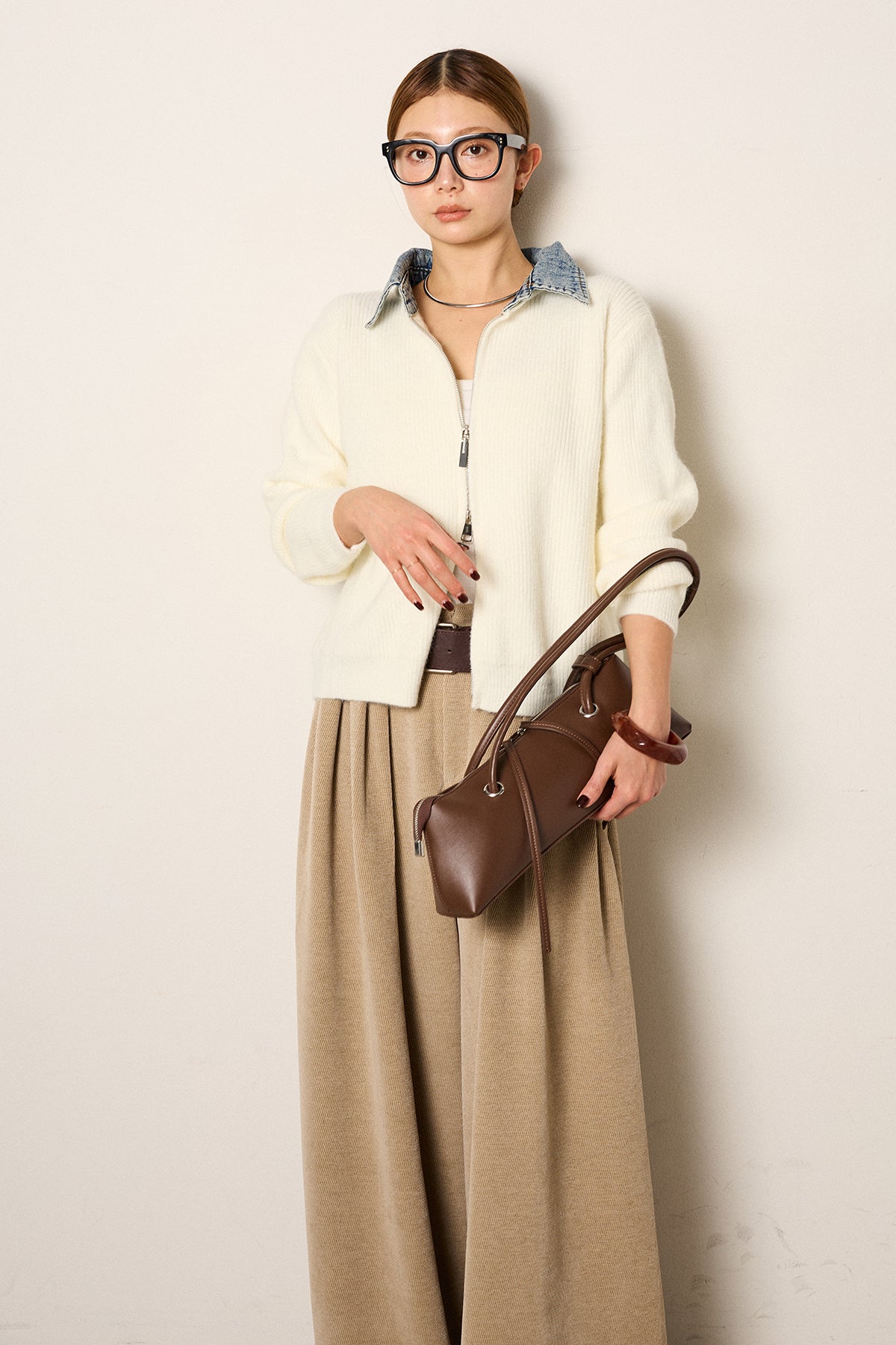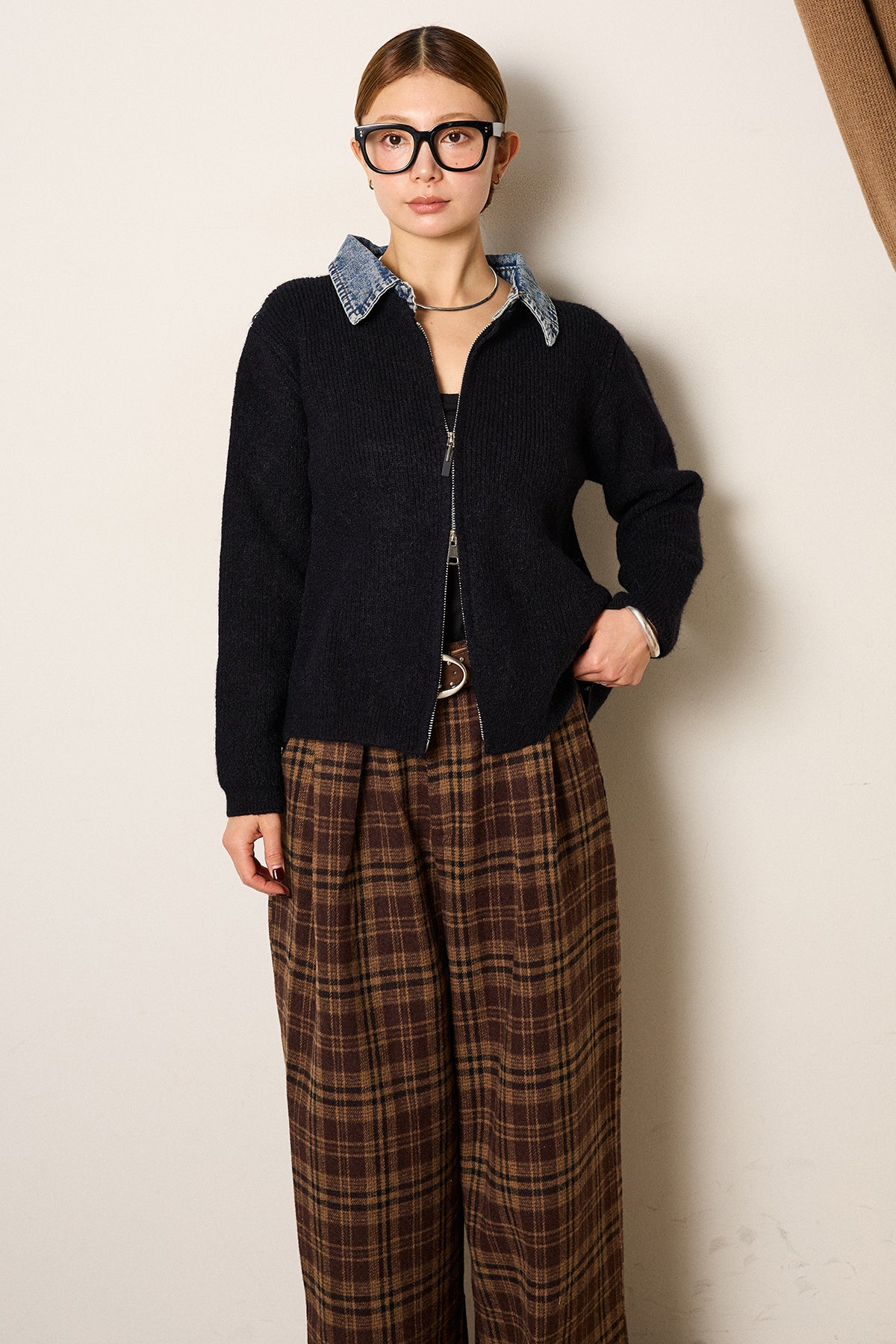 デニム素材の襟を組み合わせたダブルジップデザインのニットトップス。カジュアルな要素をミックスしつつ、コンパクトなシルエットで大人っぽく着られる一枚。ジップは上下どちらからも開閉でき、スタイリングに合わせて表情を変えられるのもポイント。シンプルなボトムスでもバランスが取りやすく、日常使いしやすいデザインです。