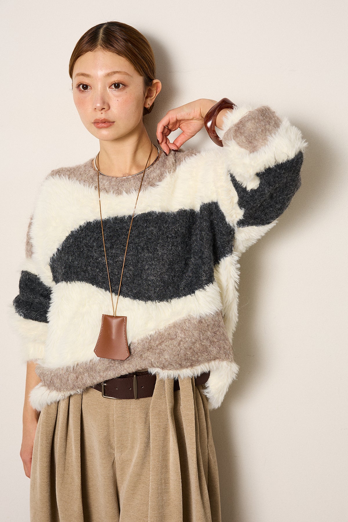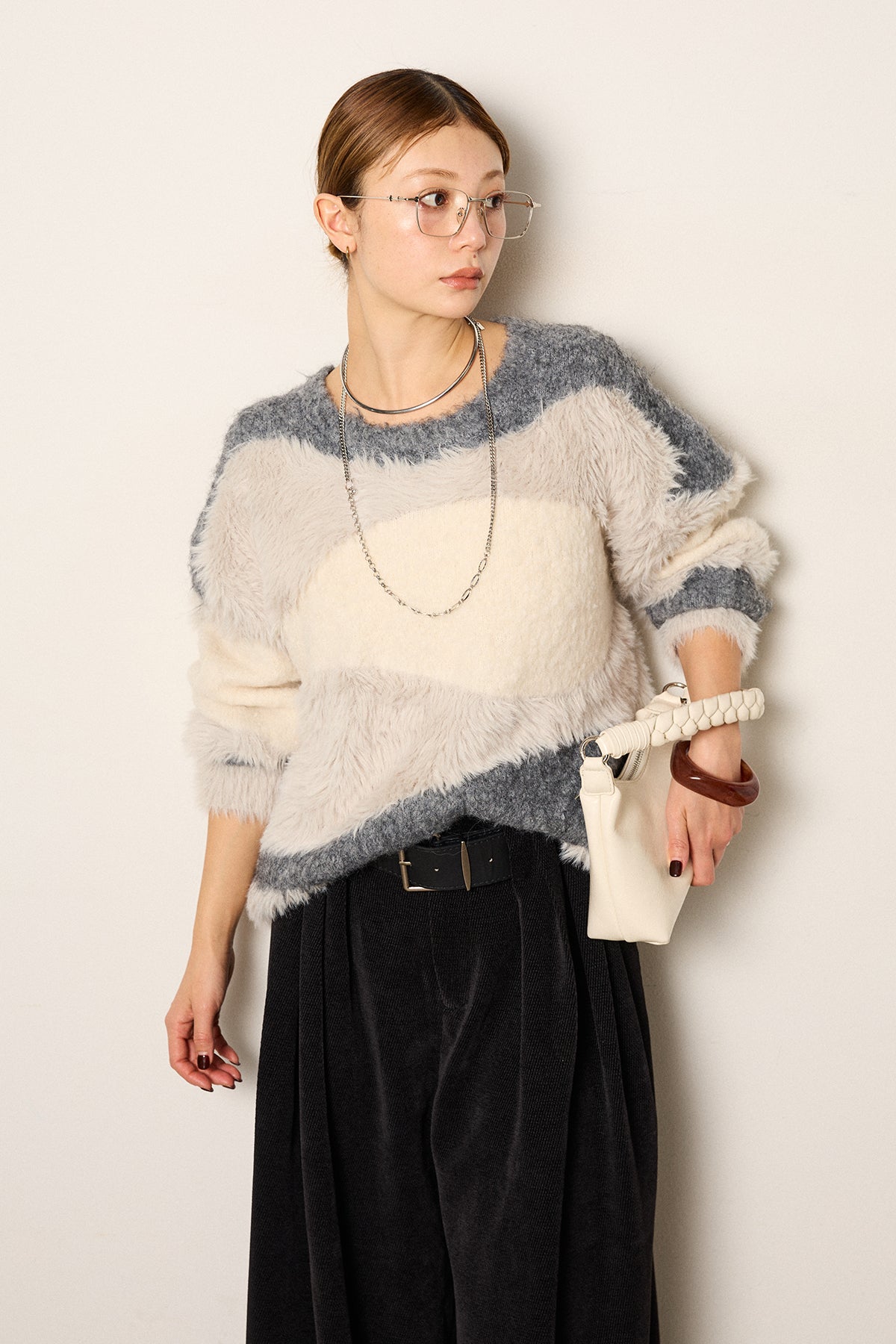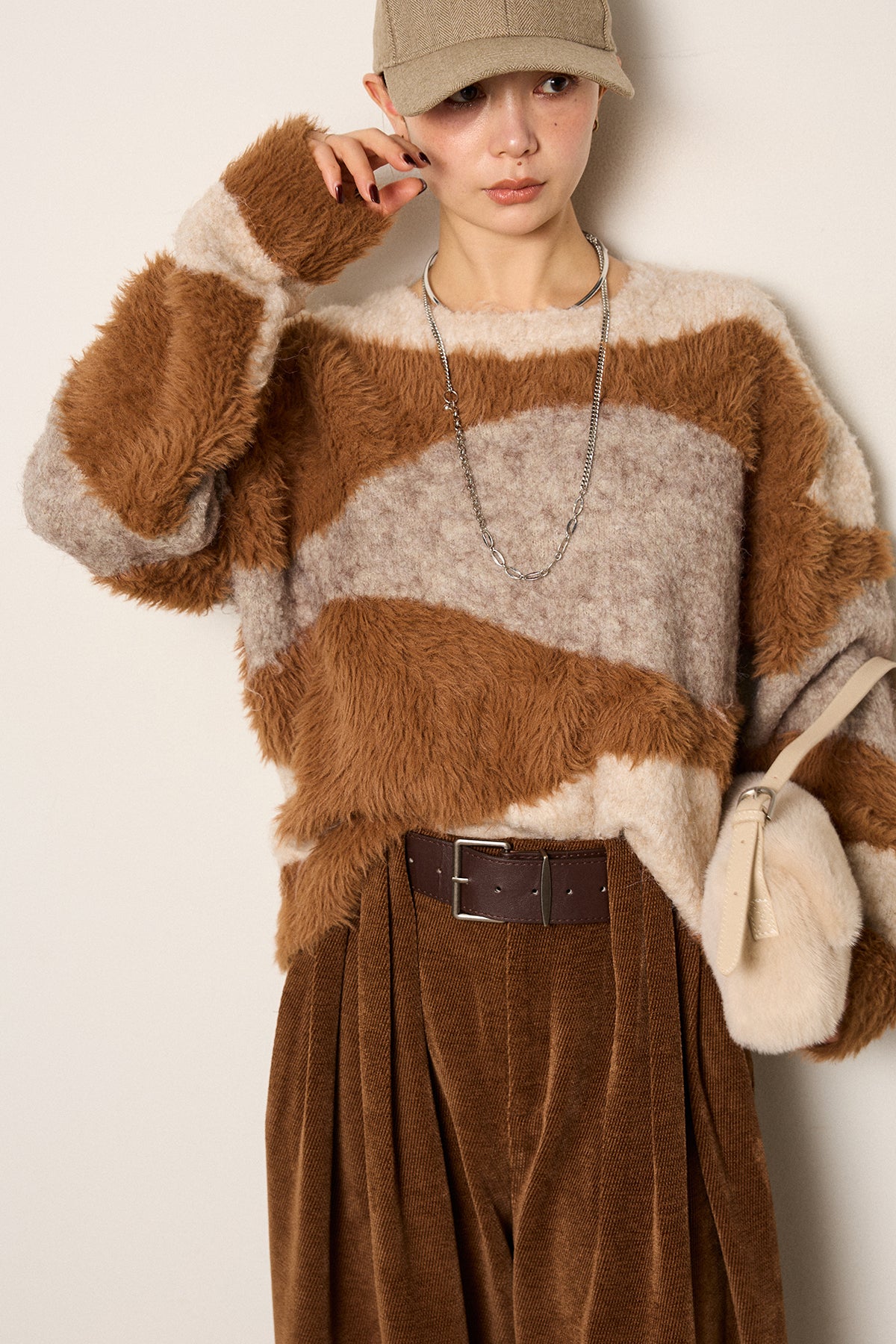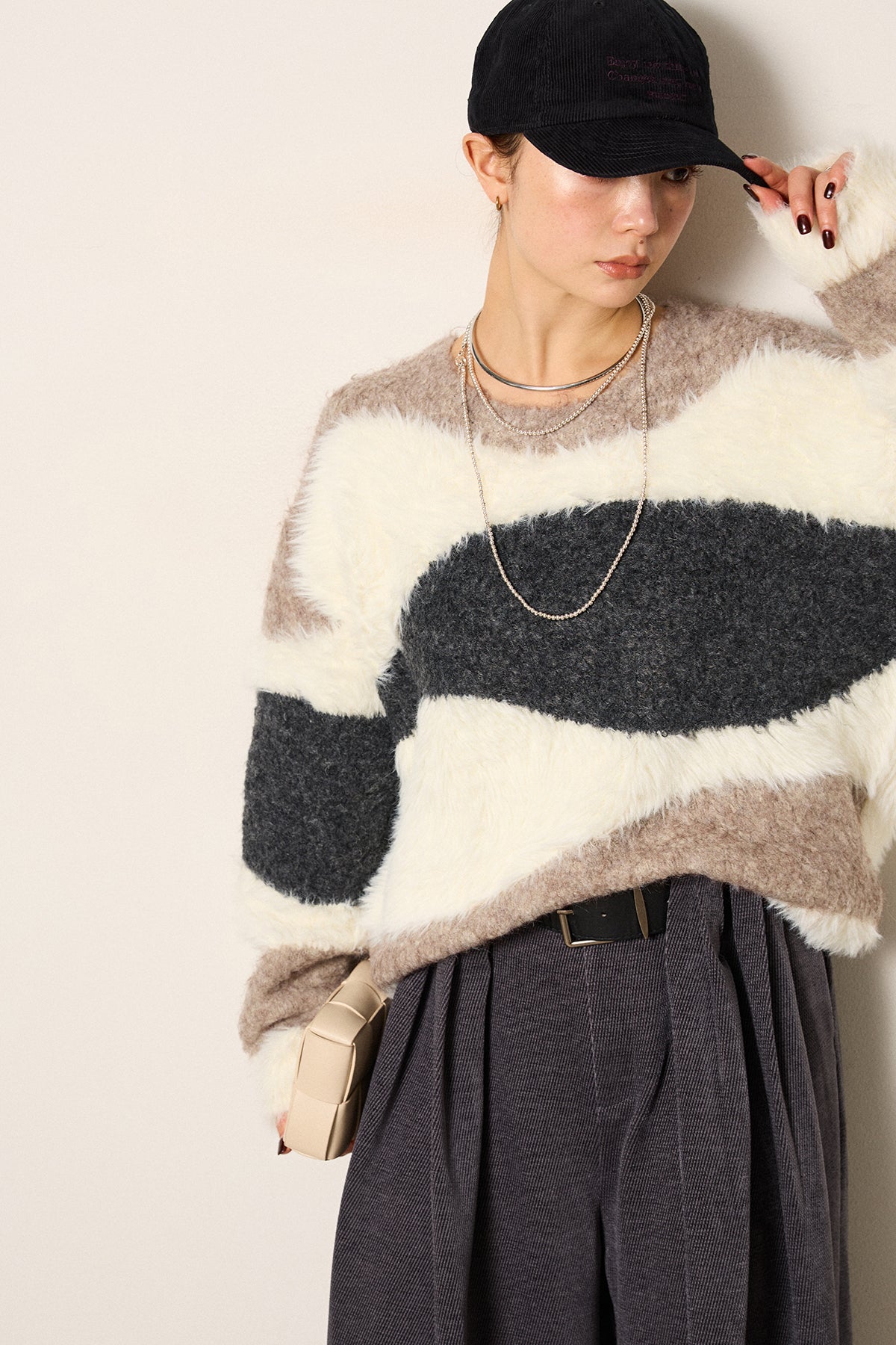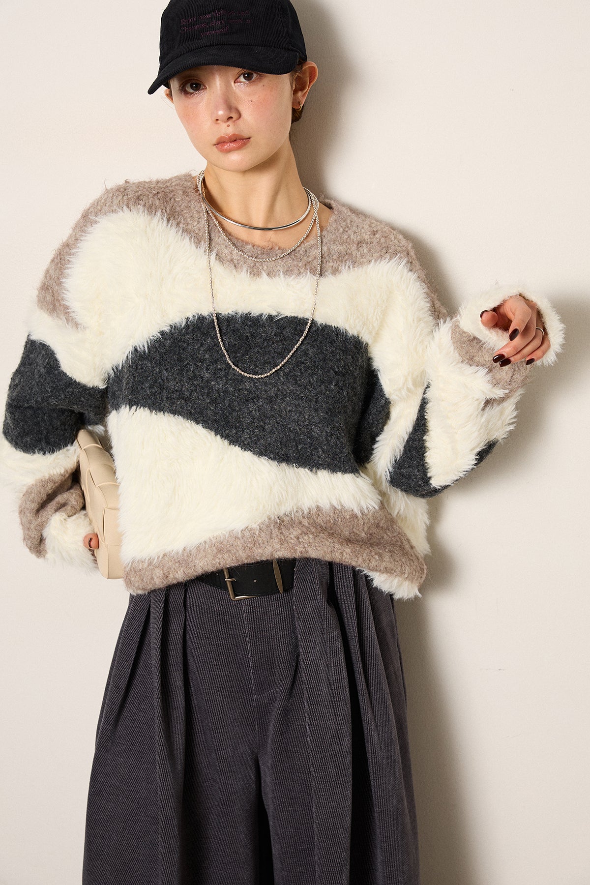◆ シャギーウェーブ柄クルーネックニットトップス