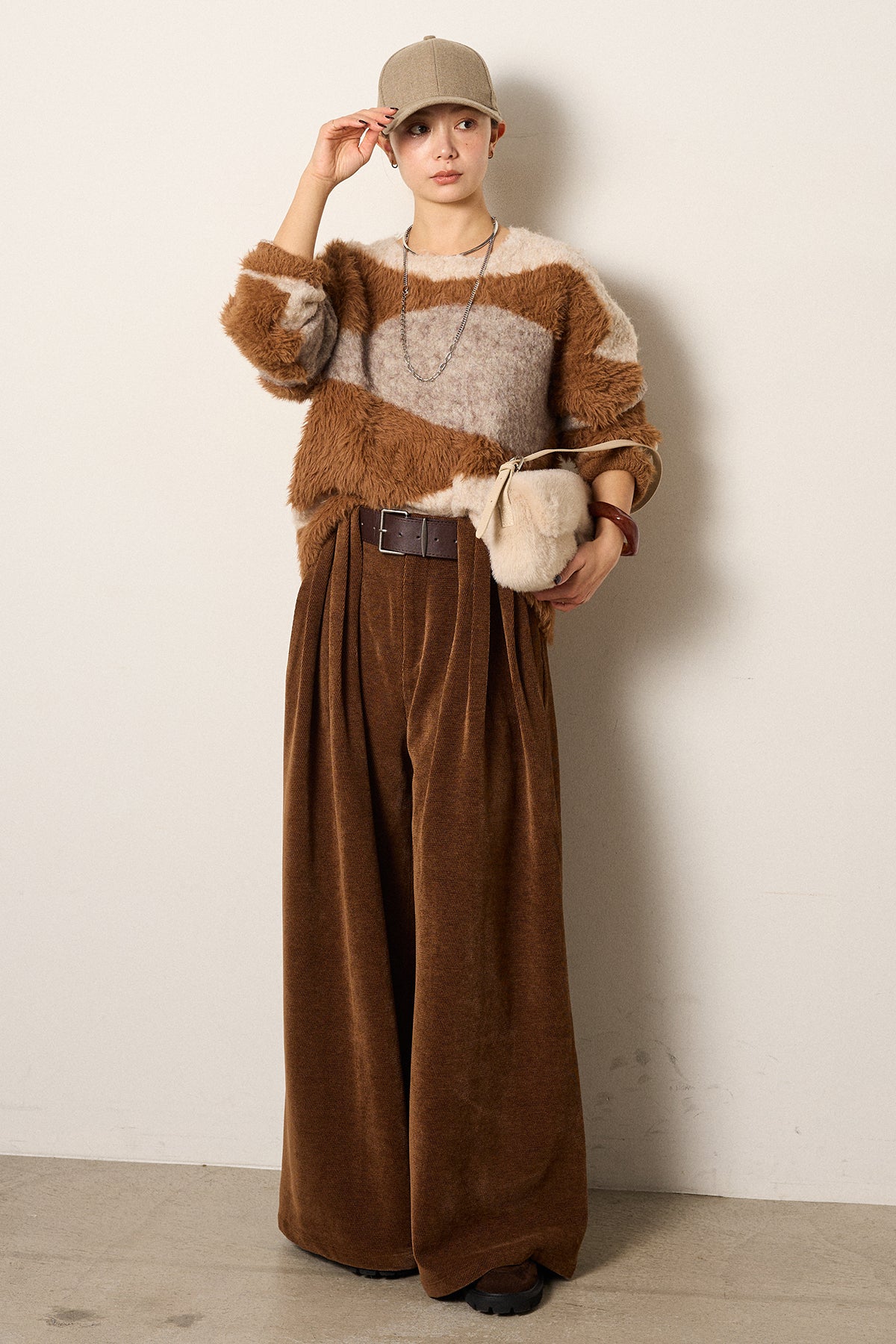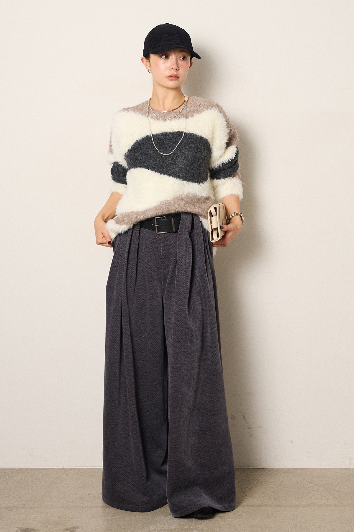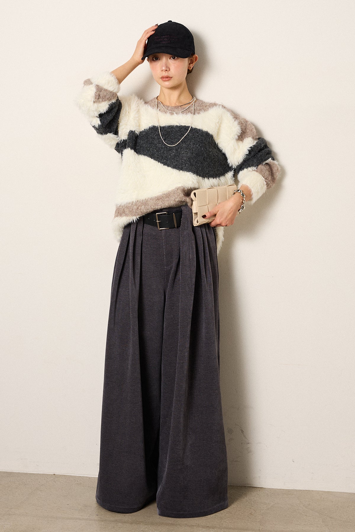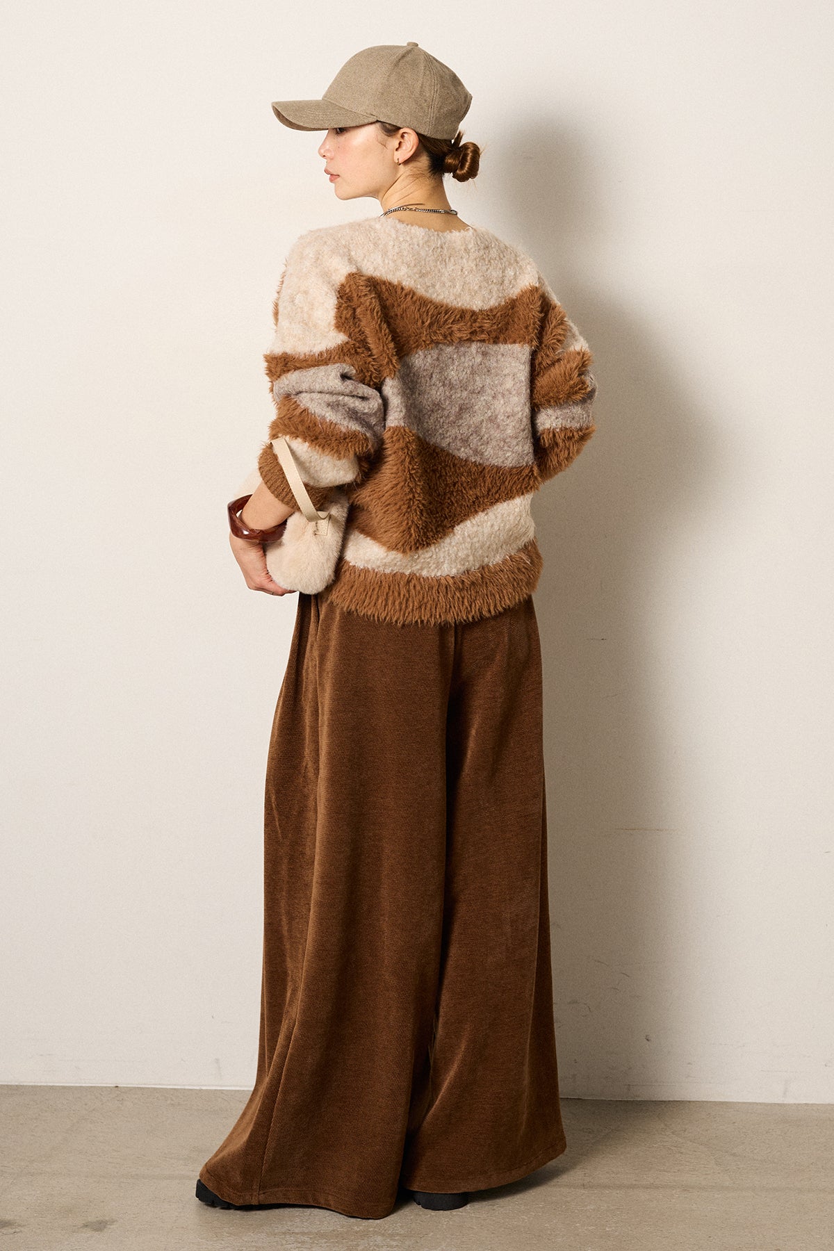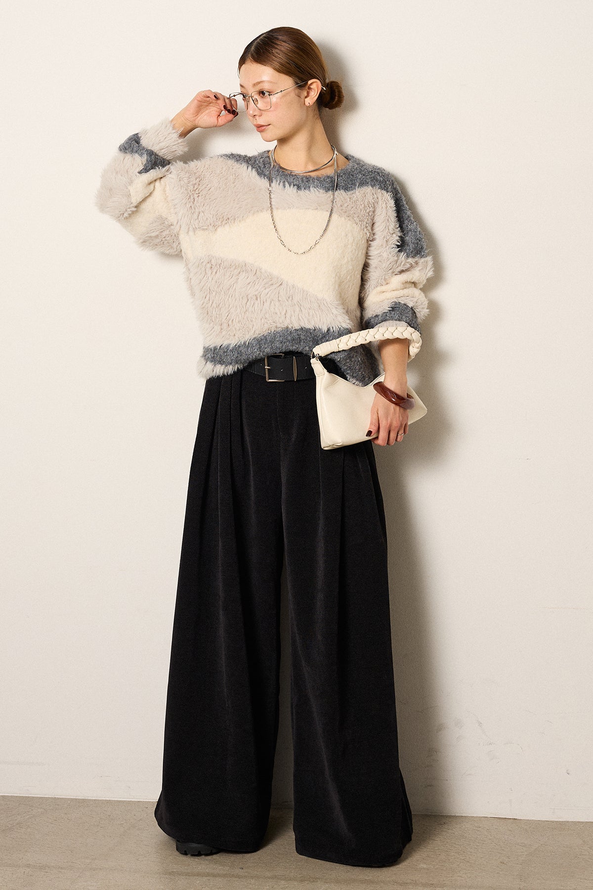 [SET]シャギーウェーブ柄クルーネックニットトップス+ベルトループコーデュロイワイドパンツ(2set)