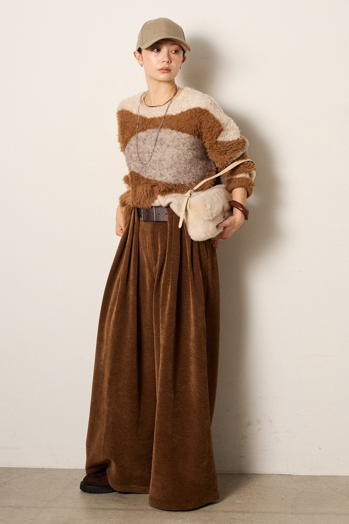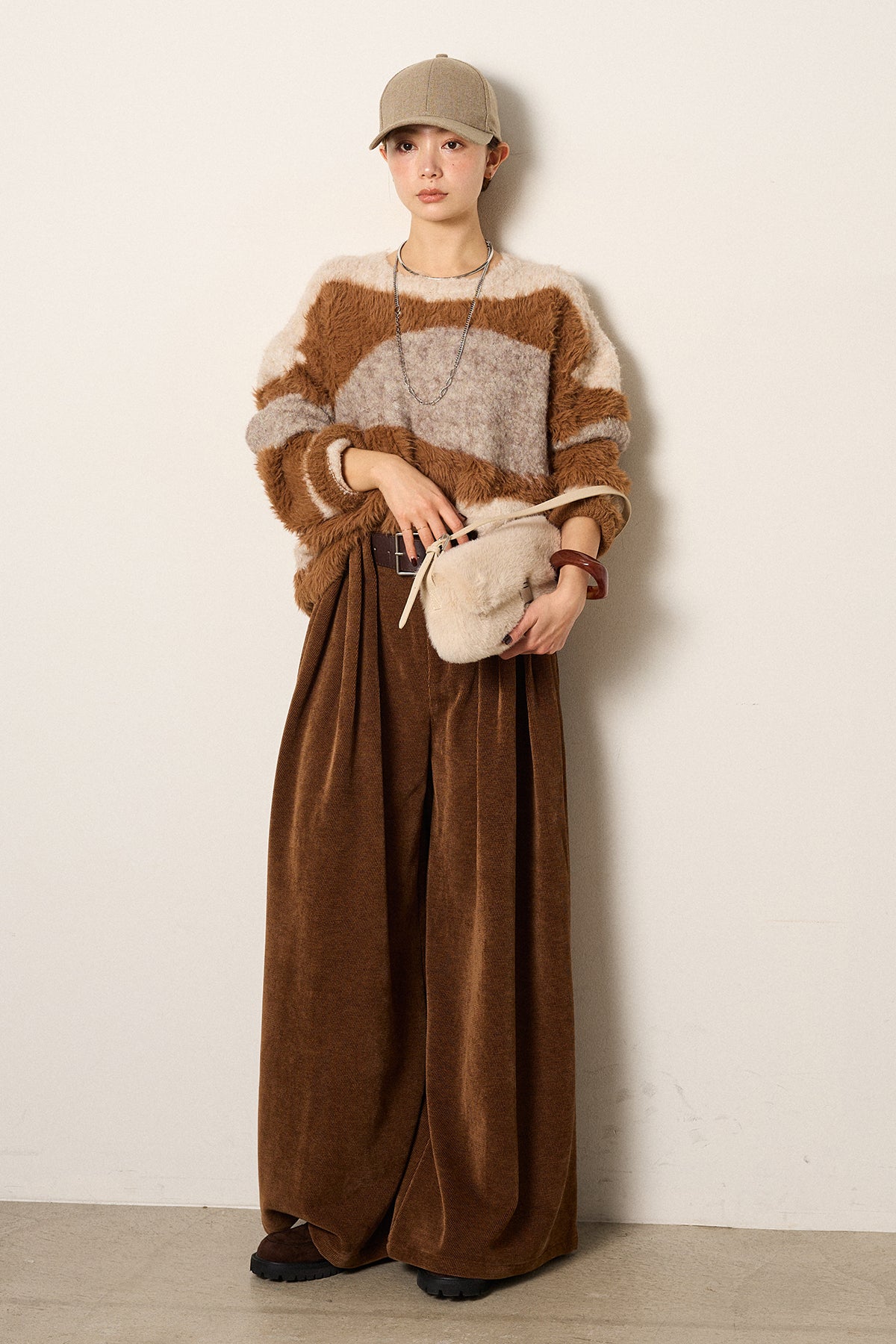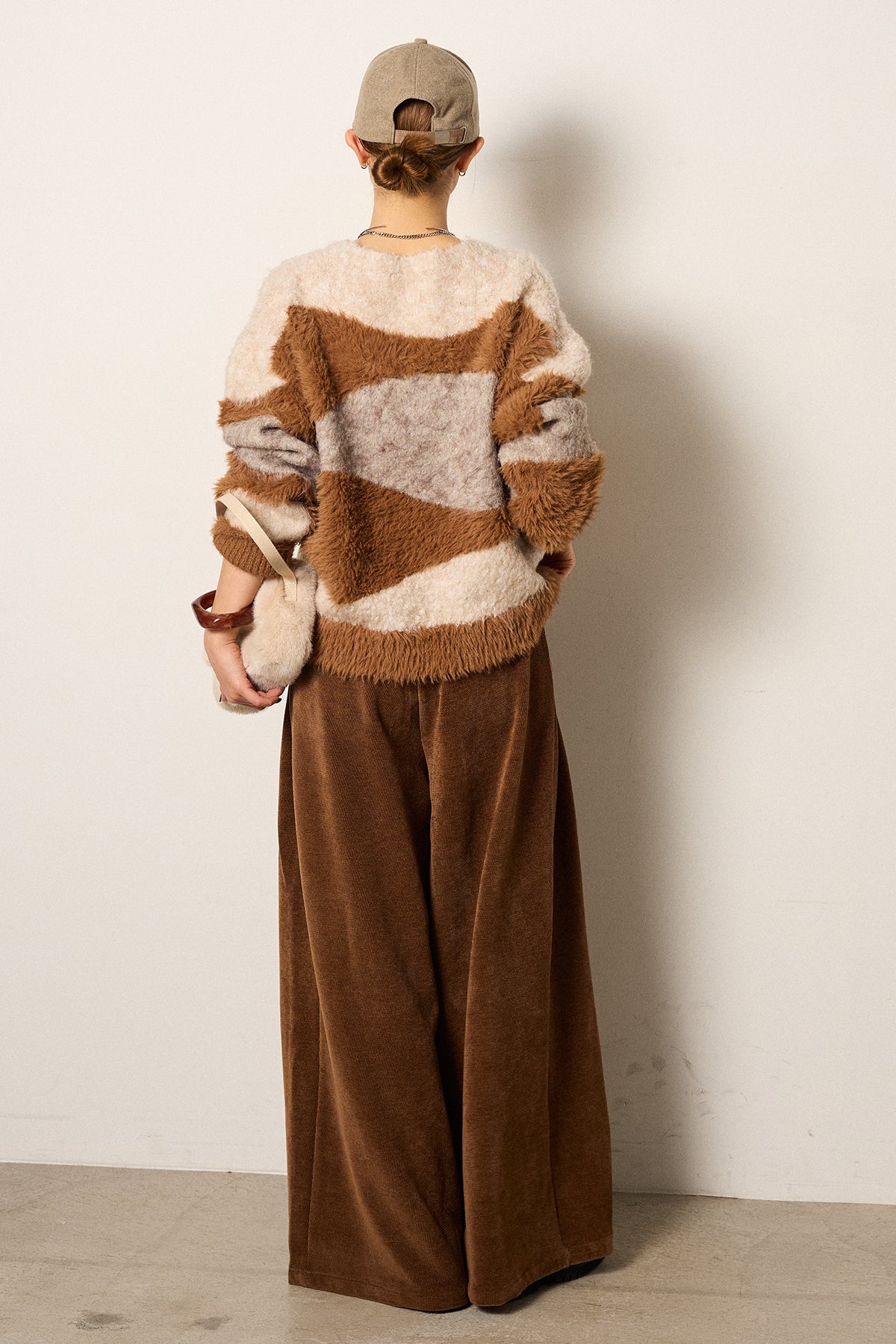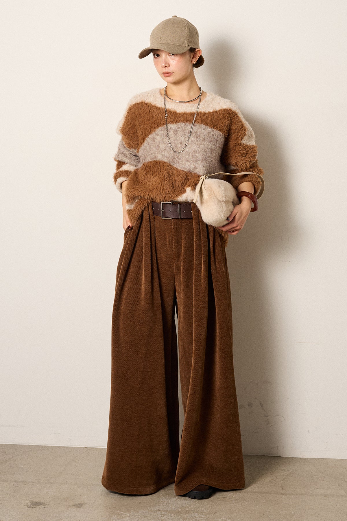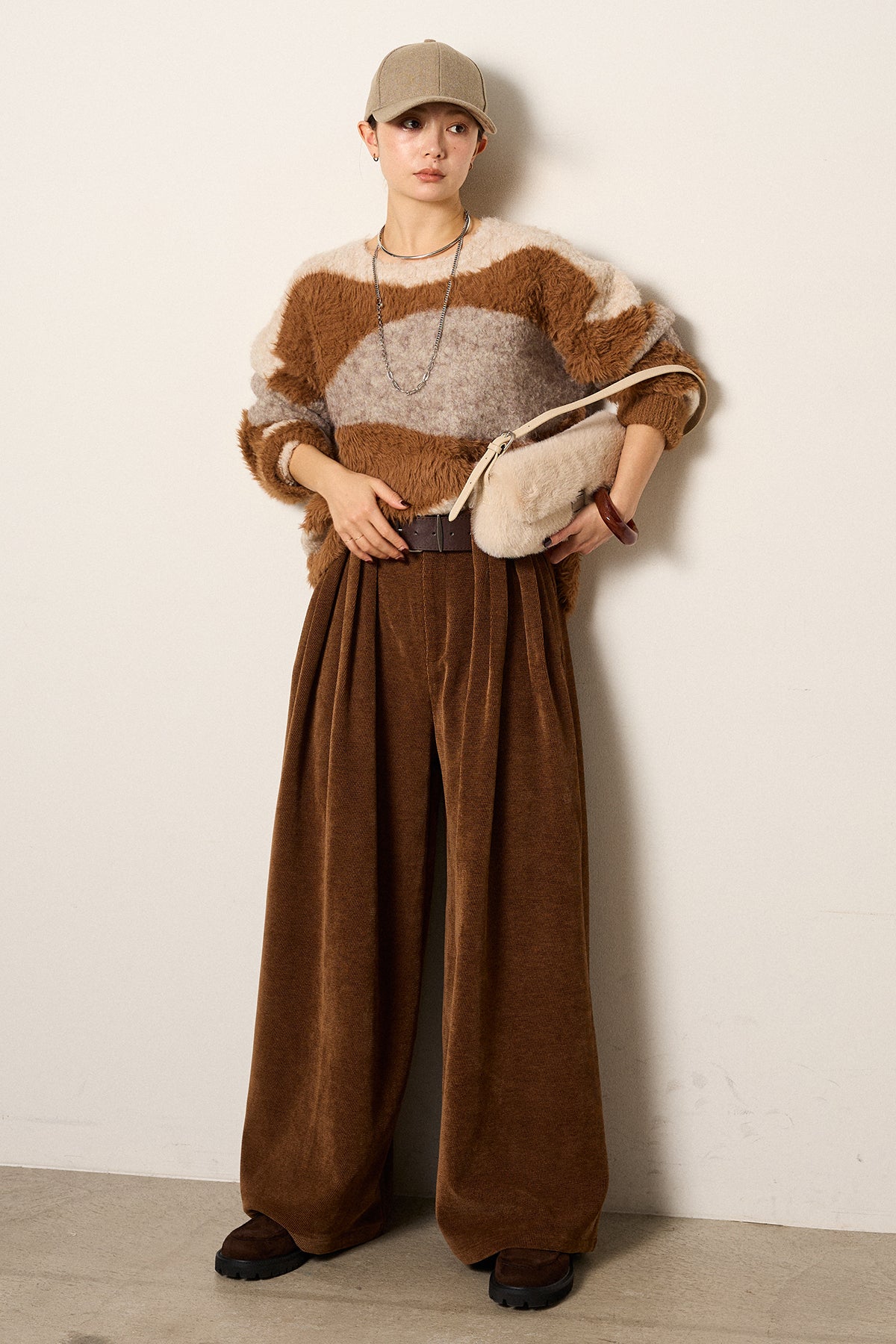 [SET]シャギーウェーブ柄クルーネックニットトップス+ベルトループコーデュロイワイドパンツ(2set)