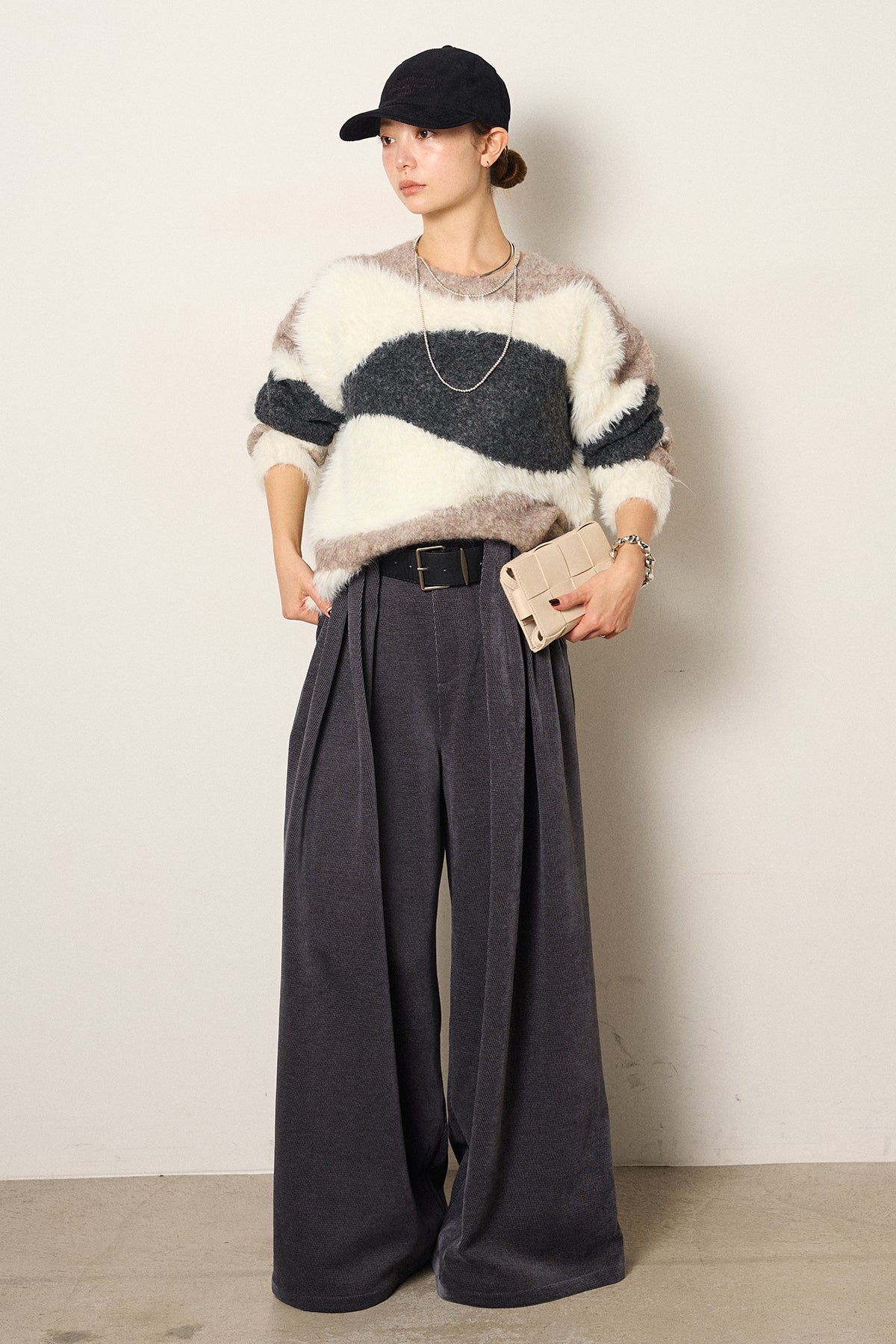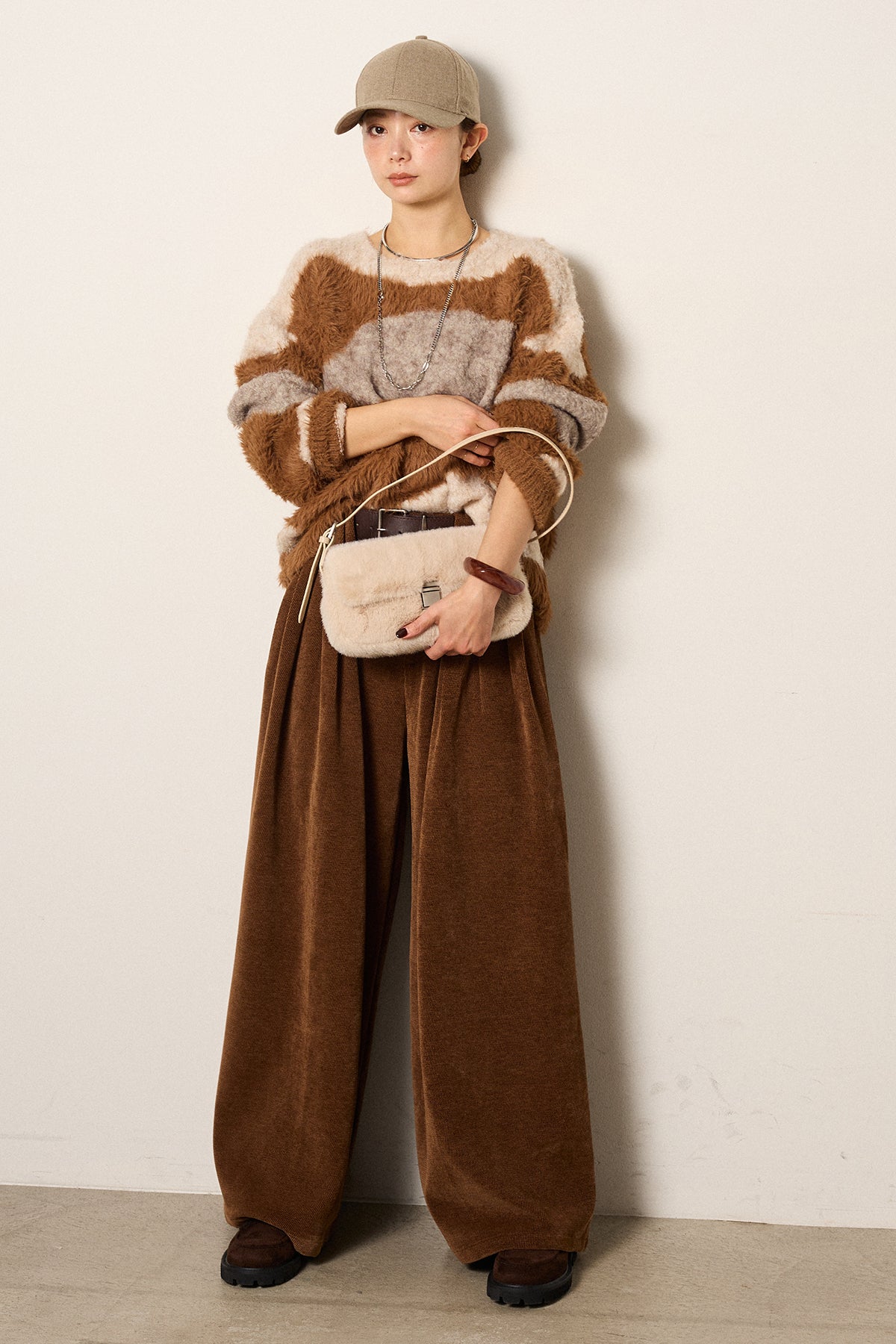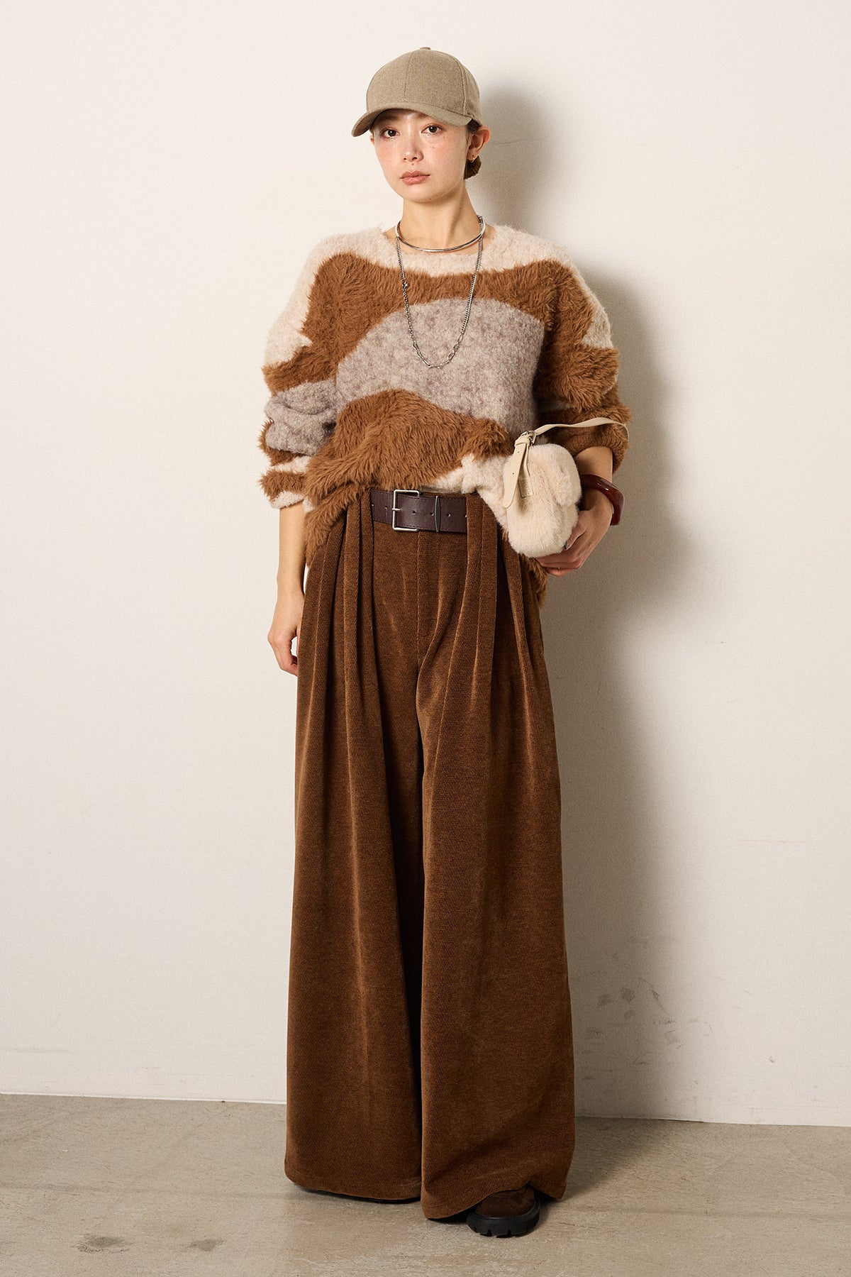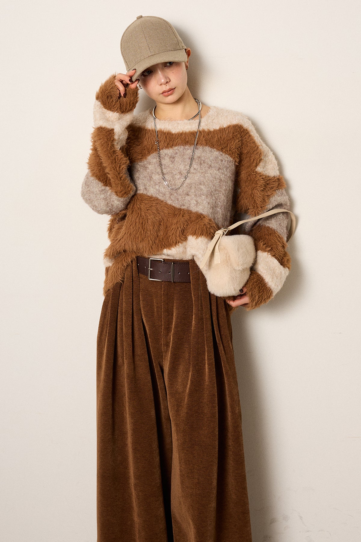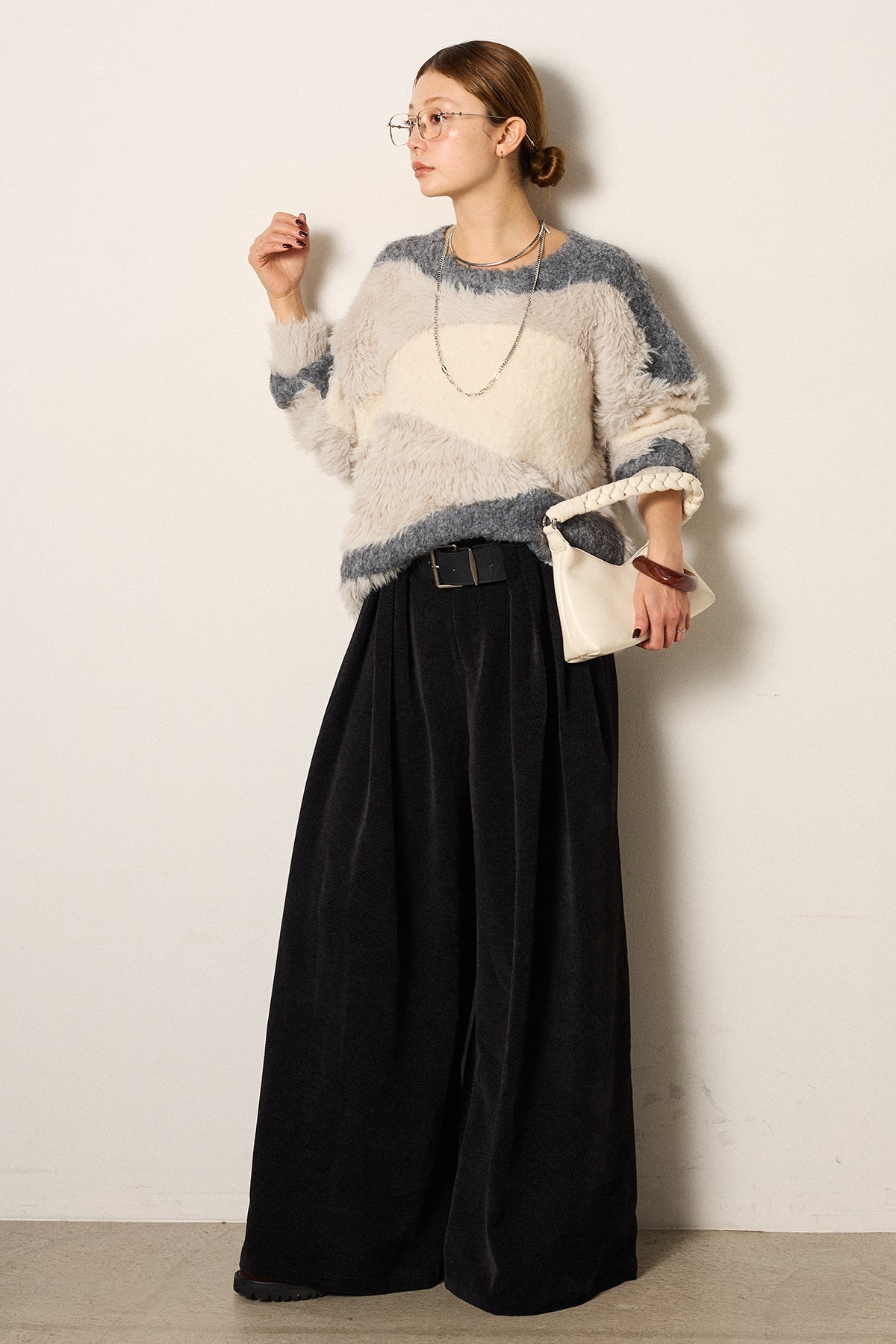 [SET]シャギーウェーブ柄クルーネックニットトップス+ベルトループコーデュロイワイドパンツ(2set)
