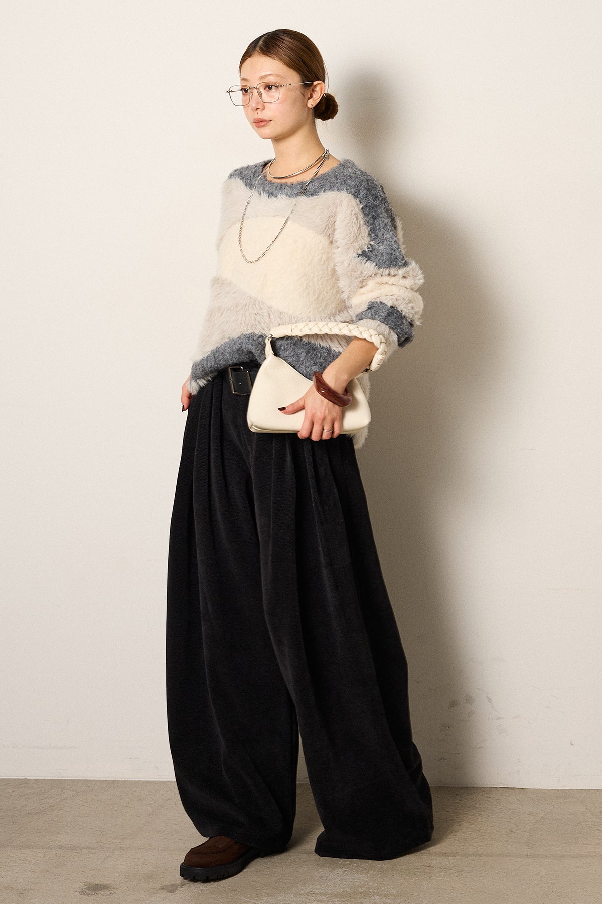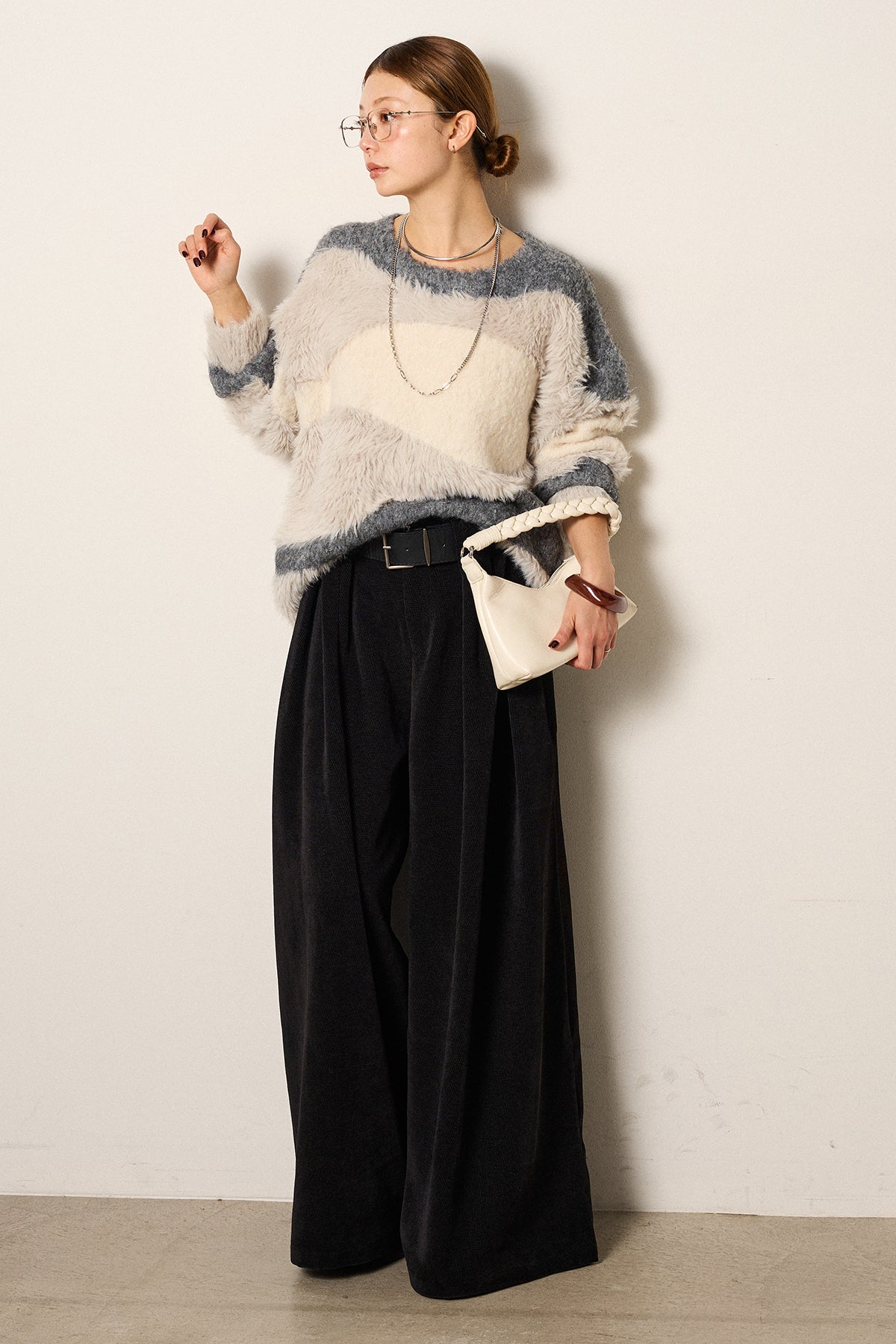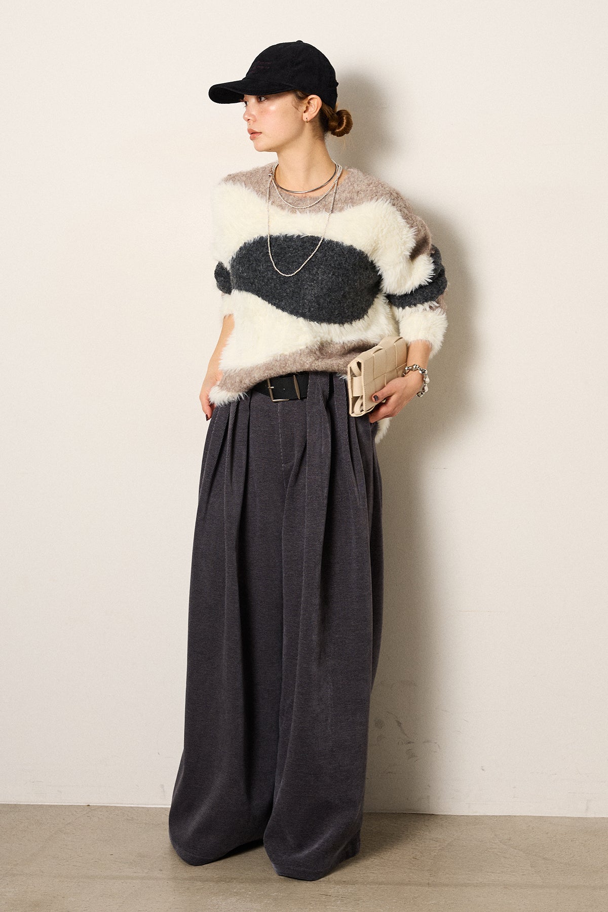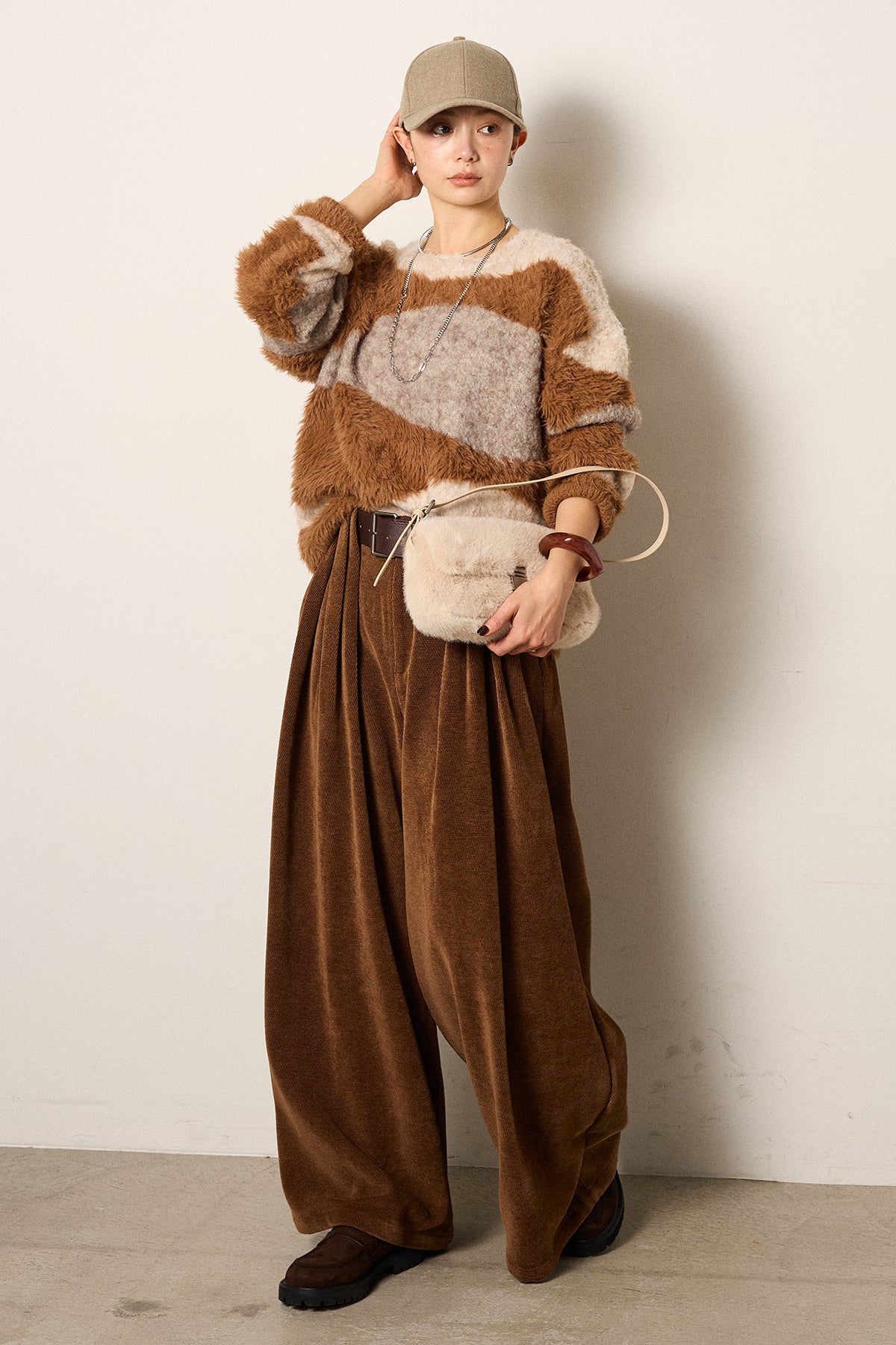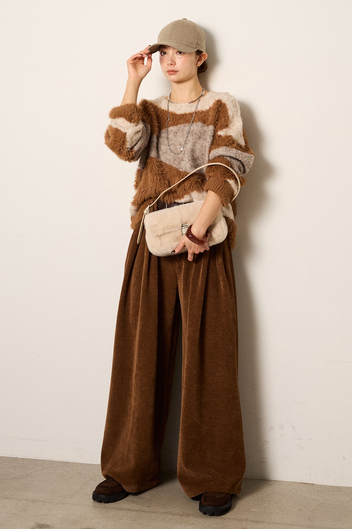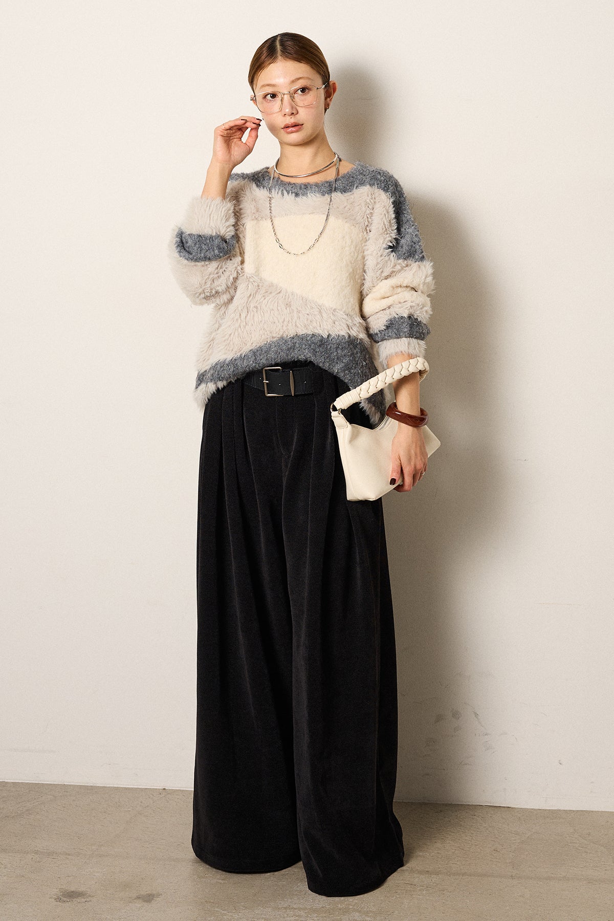 [SET]シャギーウェーブ柄クルーネックニットトップス+ベルトループコーデュロイワイドパンツ(2set)