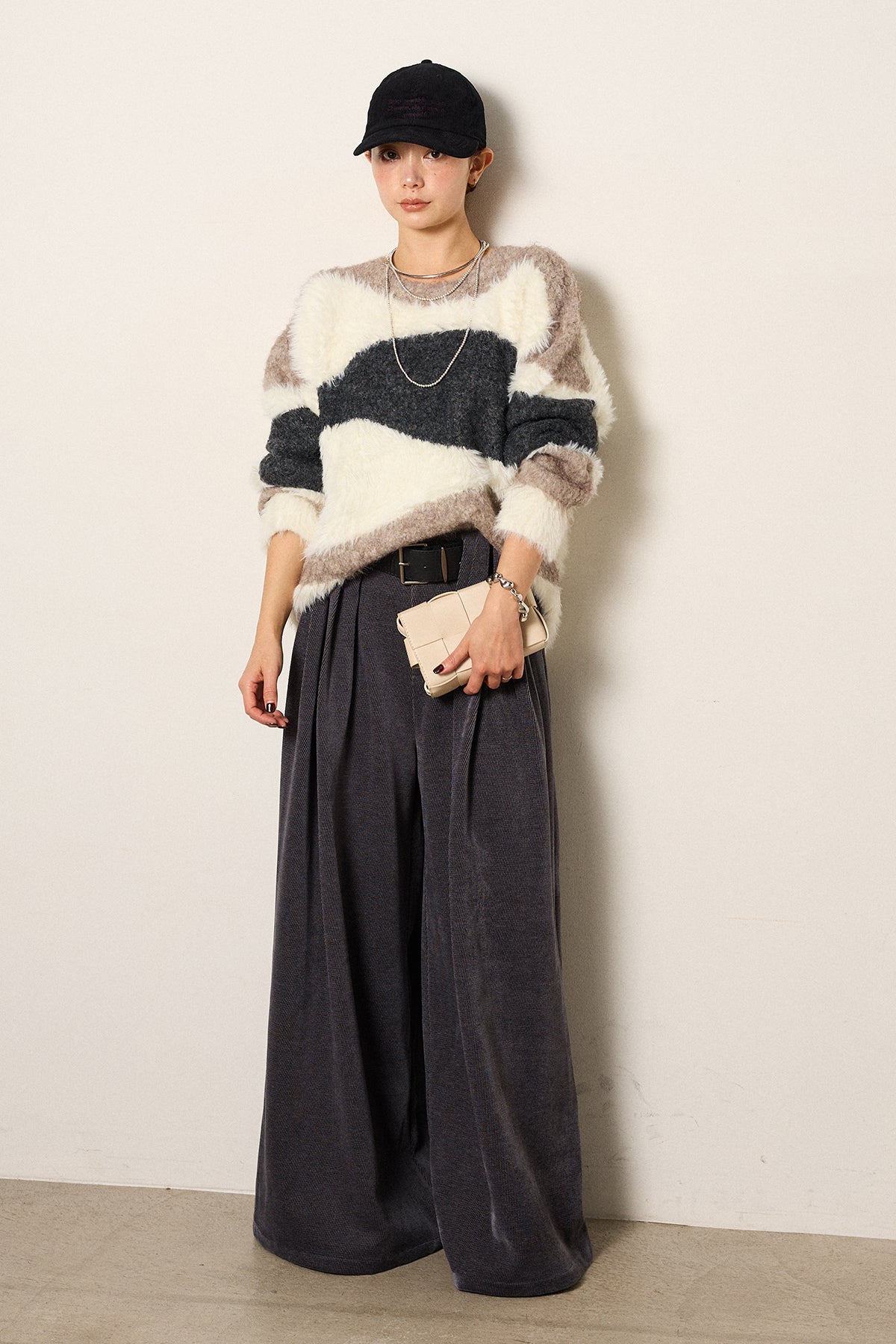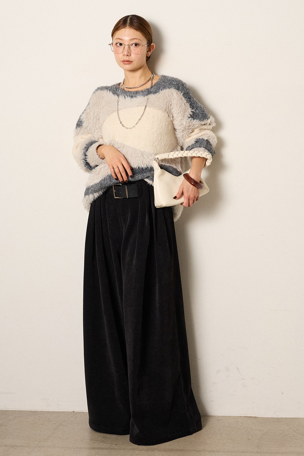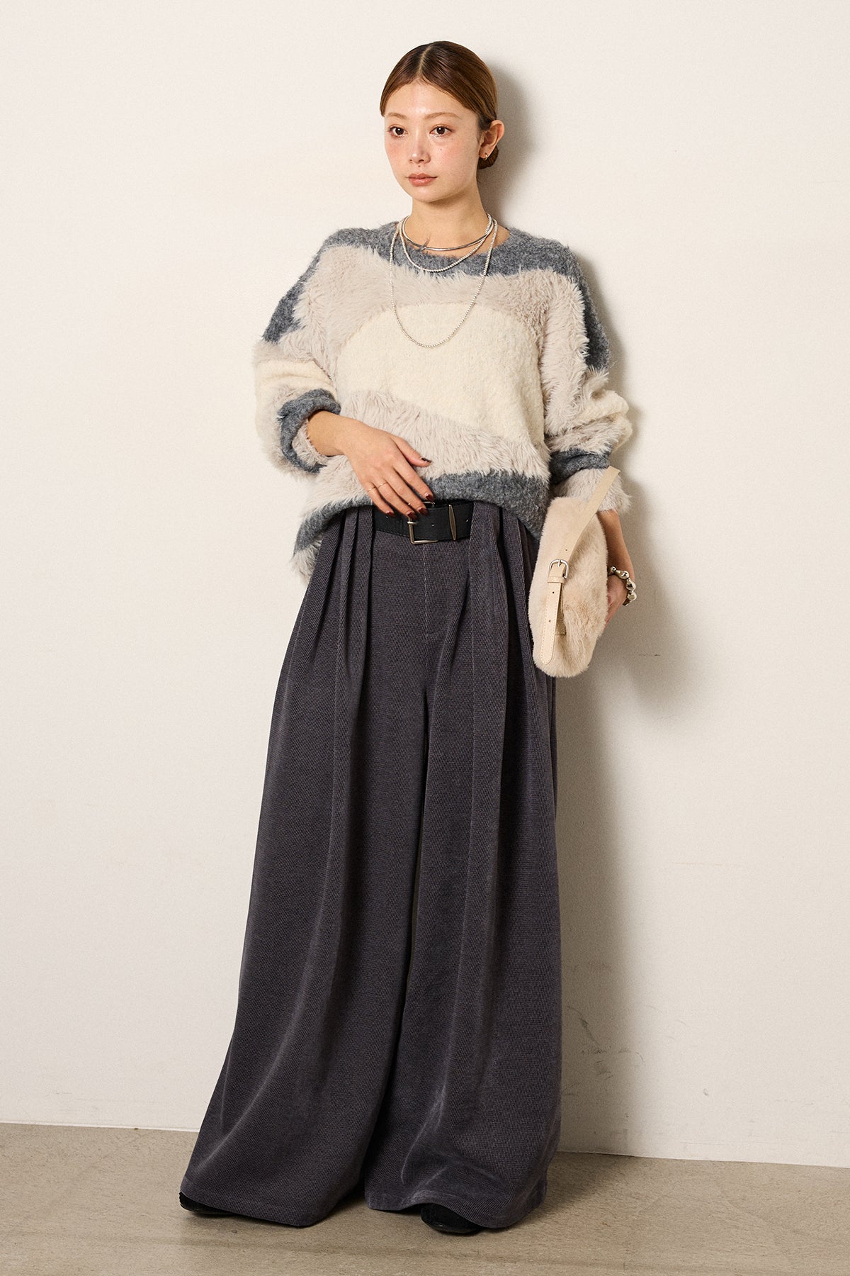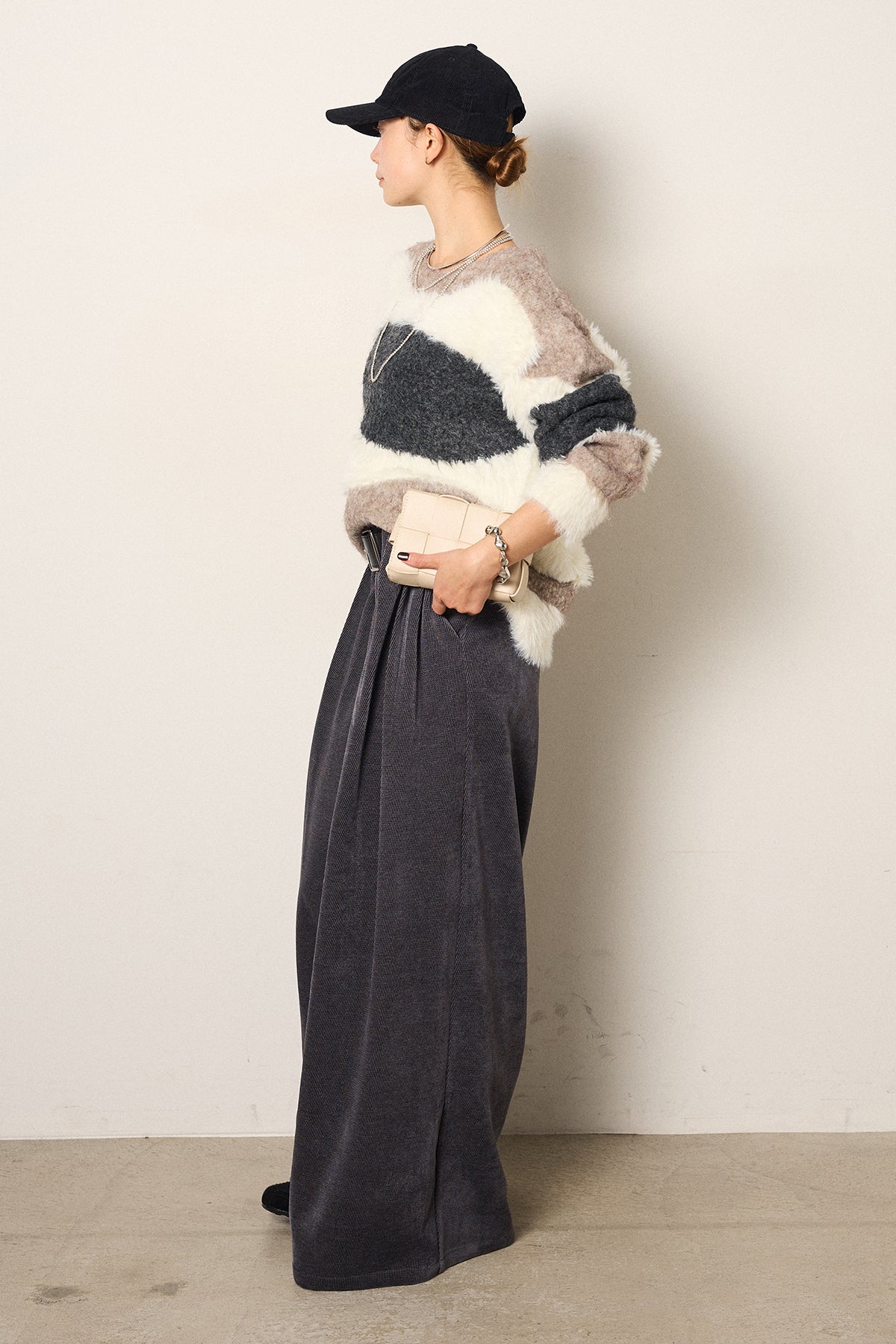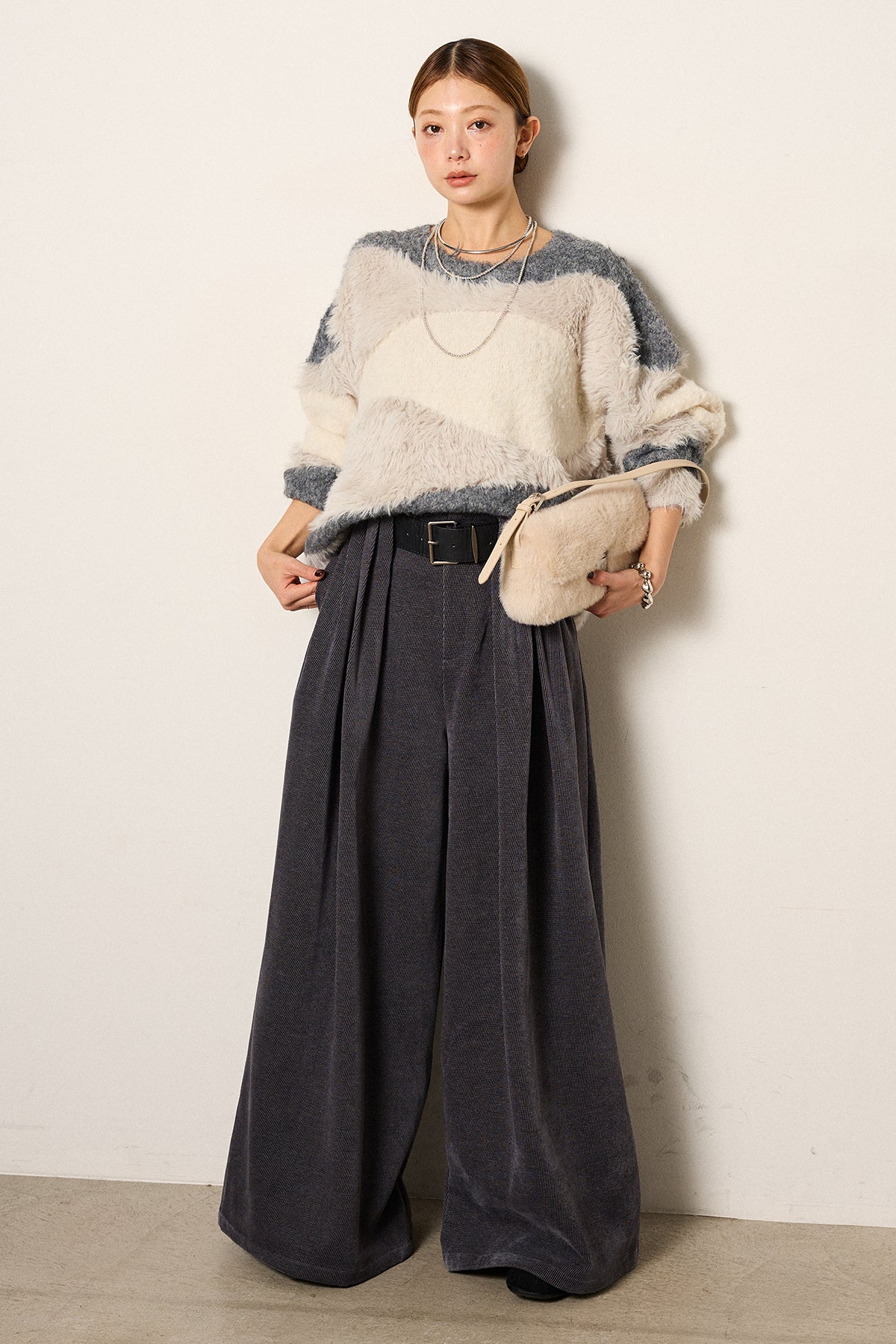 [SET]シャギーウェーブ柄クルーネックニットトップス+ベルトループコーデュロイワイドパンツ(2set)