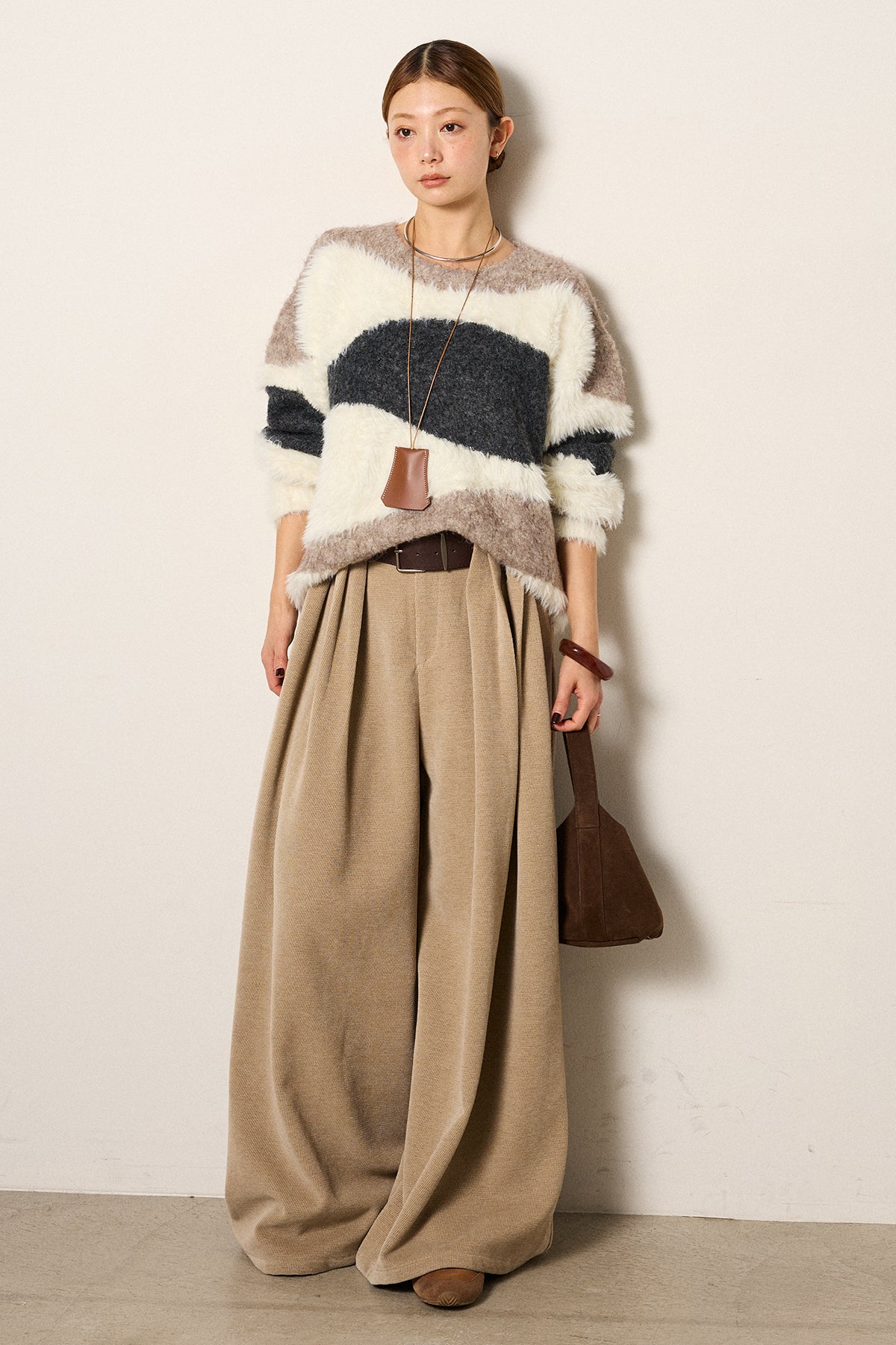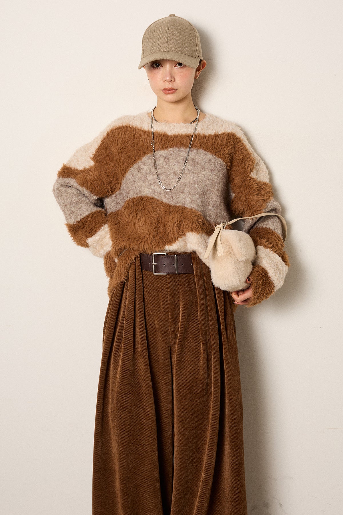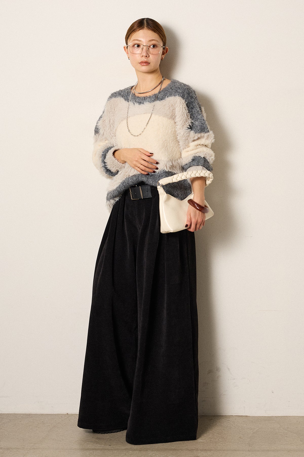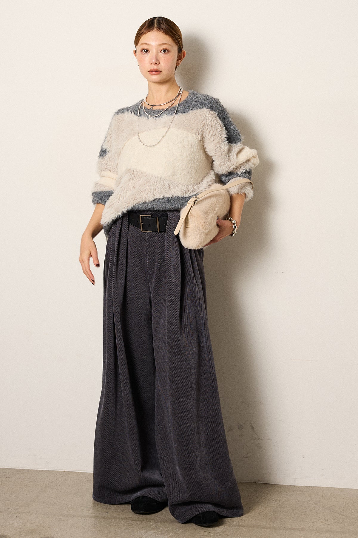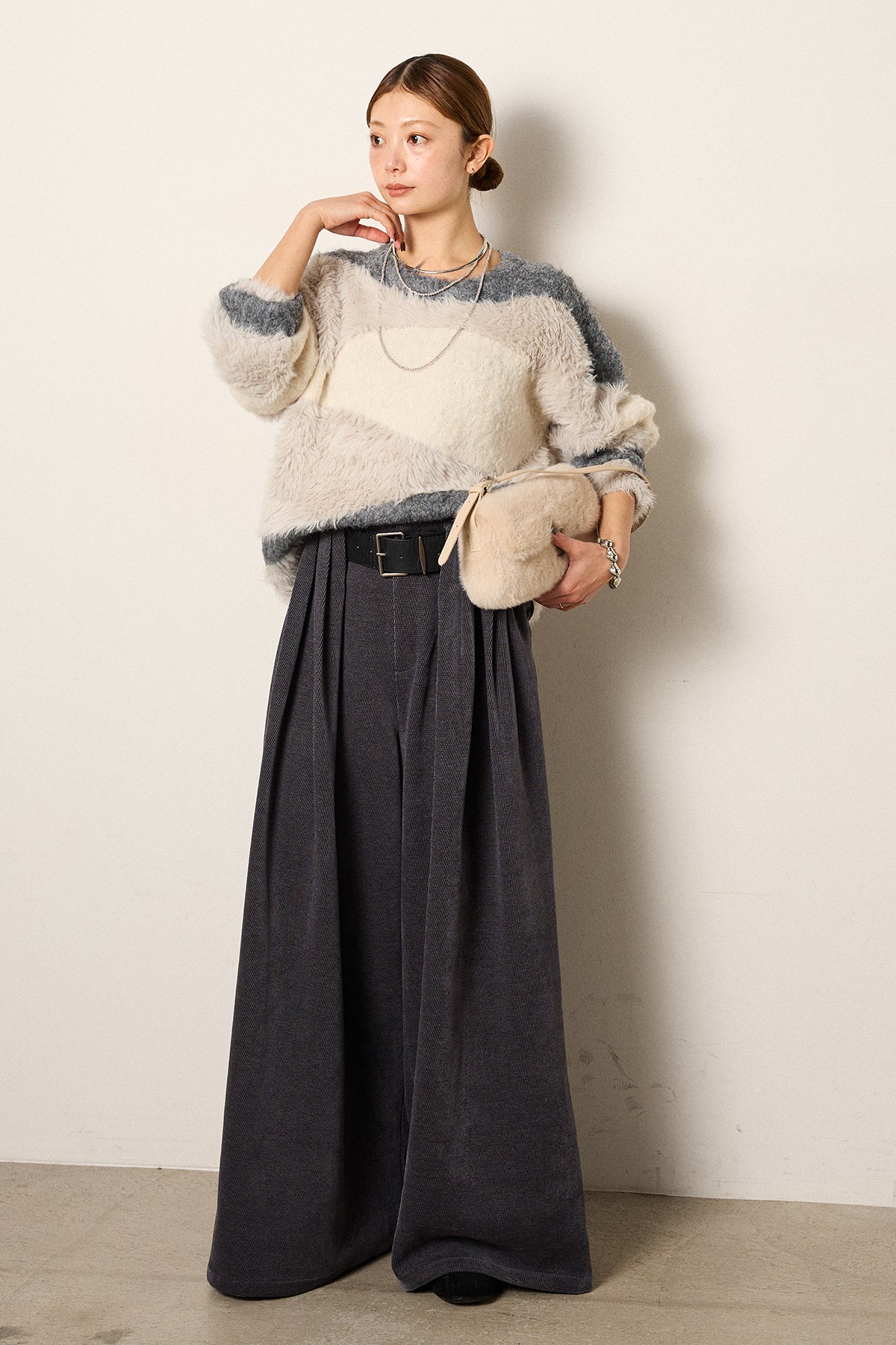 [SET]シャギーウェーブ柄クルーネックニットトップス+ベルトループコーデュロイワイドパンツ(2set)