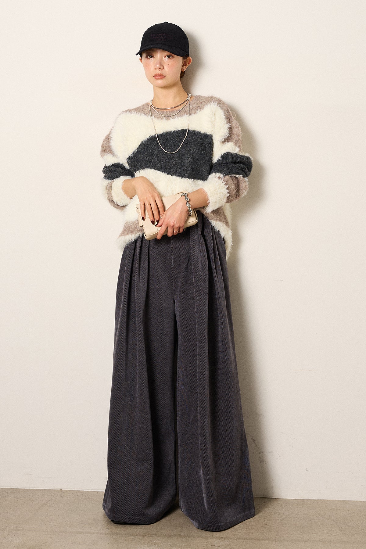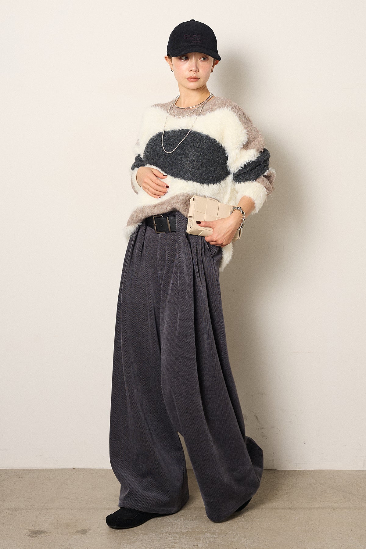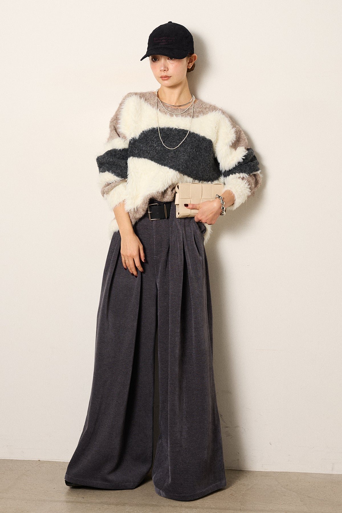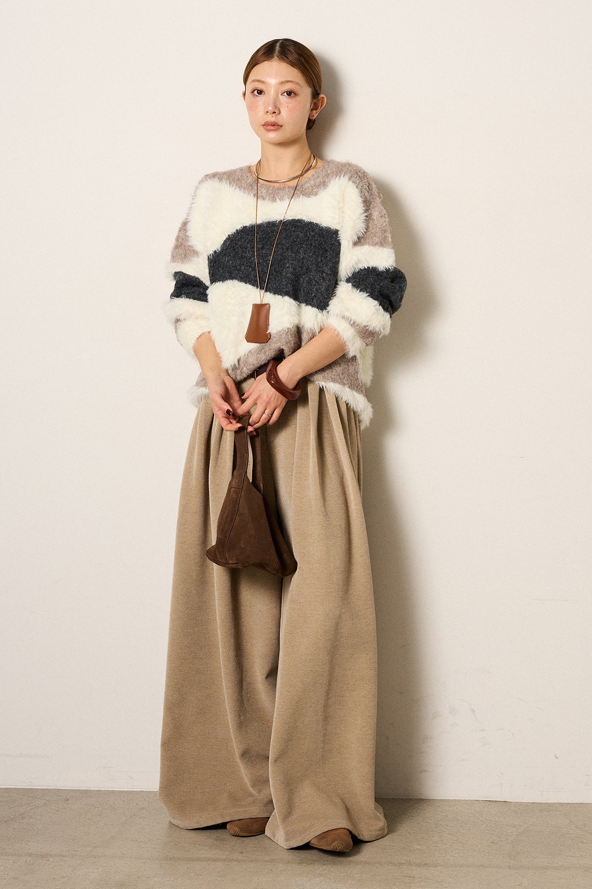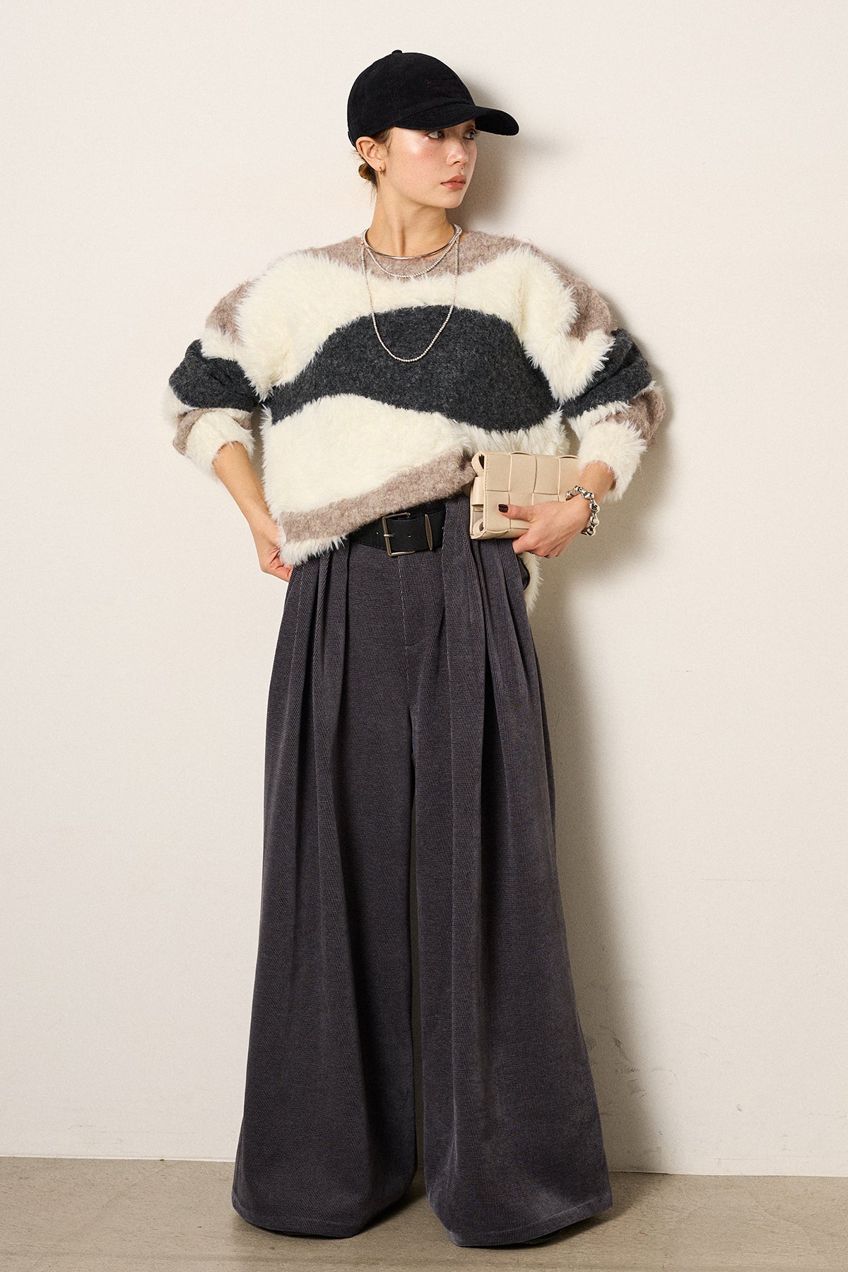 [SET]シャギーウェーブ柄クルーネックニットトップス+ベルトループコーデュロイワイドパンツ(2set)