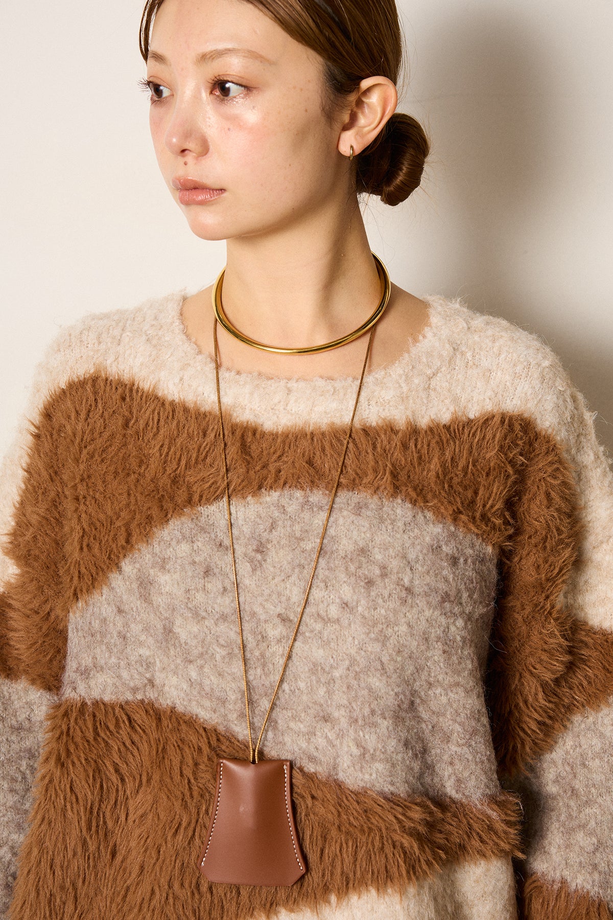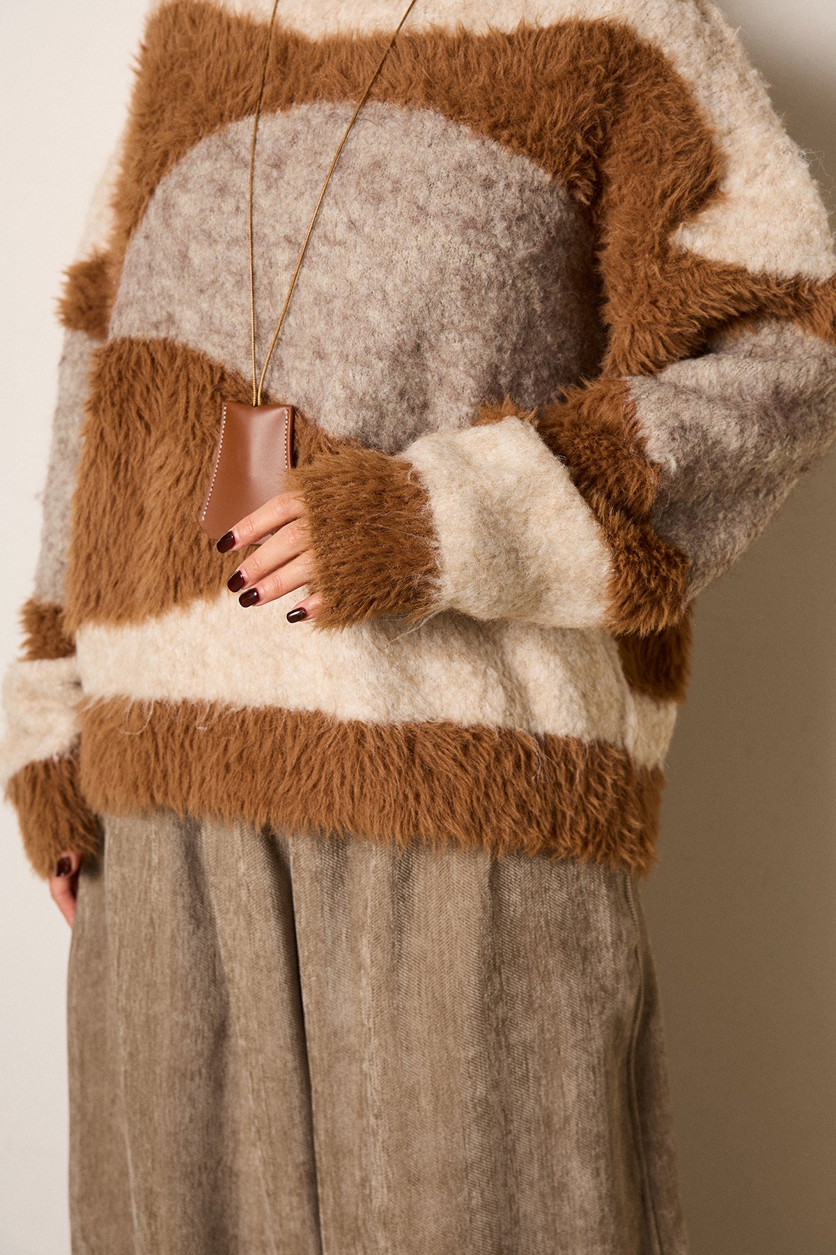 起毛感のあるシャギー素材に、大胆なウェーブ柄をのせたクルーネックニットトップス。ふんわりとした風合いが特徴で、シンプルながら視線を集めるデザインです。ゆったりとしたシルエットが程よい抜け感をつくり、パンツやスカートともバランスよく合わせられるのが魅力。1枚でスタイリングが決まり、季節感のある着こなしを楽しめるアイテムです。