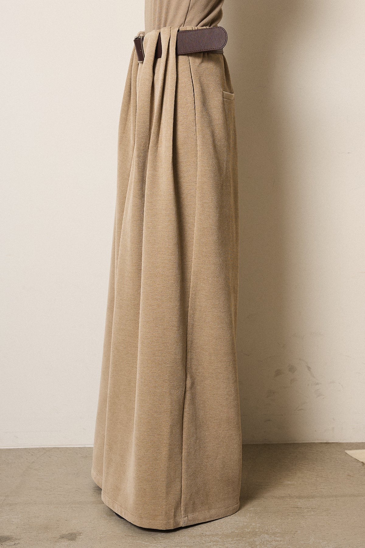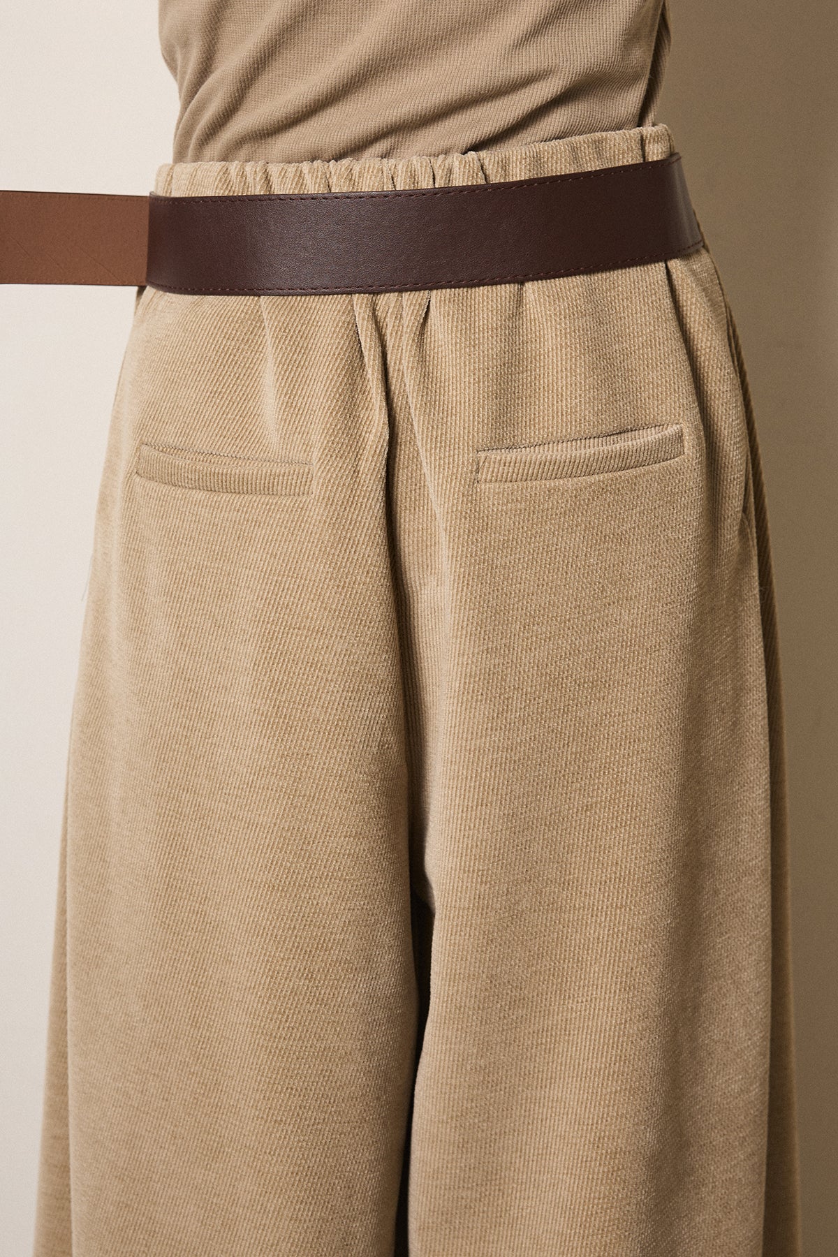 しなやかに落ちるコーデュロイが描くワイドシルエットが魅力の1本。ウエスト周りに施したタックが立体感を生み、歩くたびにゆるやかなドレープが揺れて存在感を放ちます。ベルトループ付きでトップスインもすっきり決まり、ざっくりニットやショート丈のアウターともバランスよくスタイリング可能。ラフさと上品さを両立させたワイドパンツです。