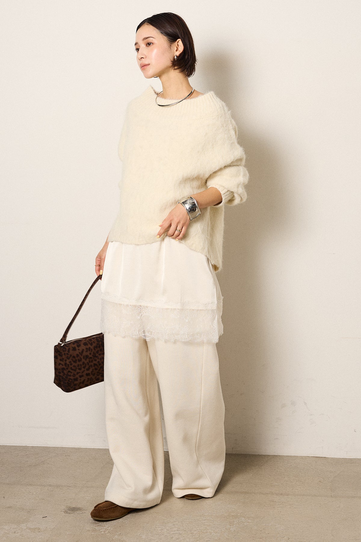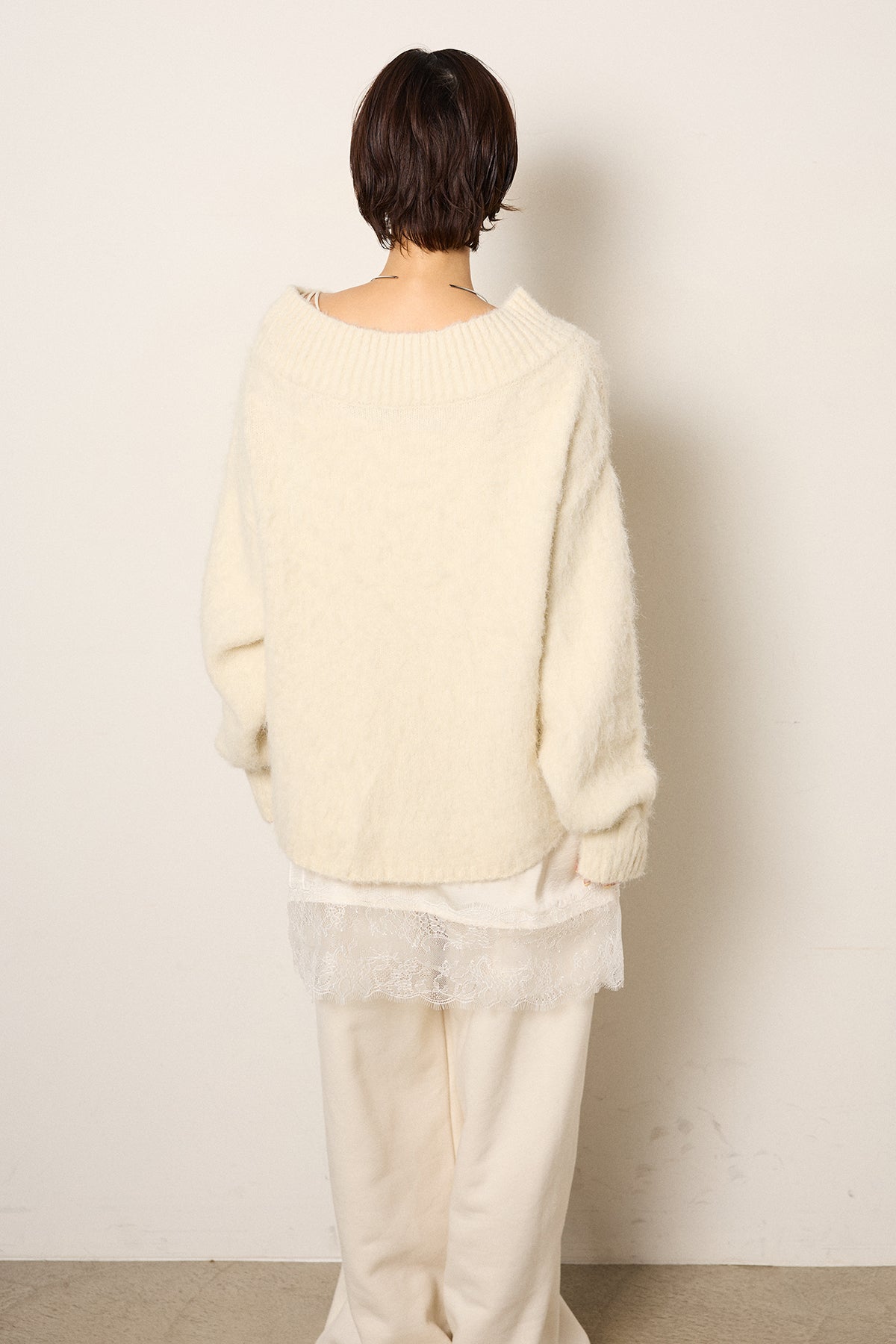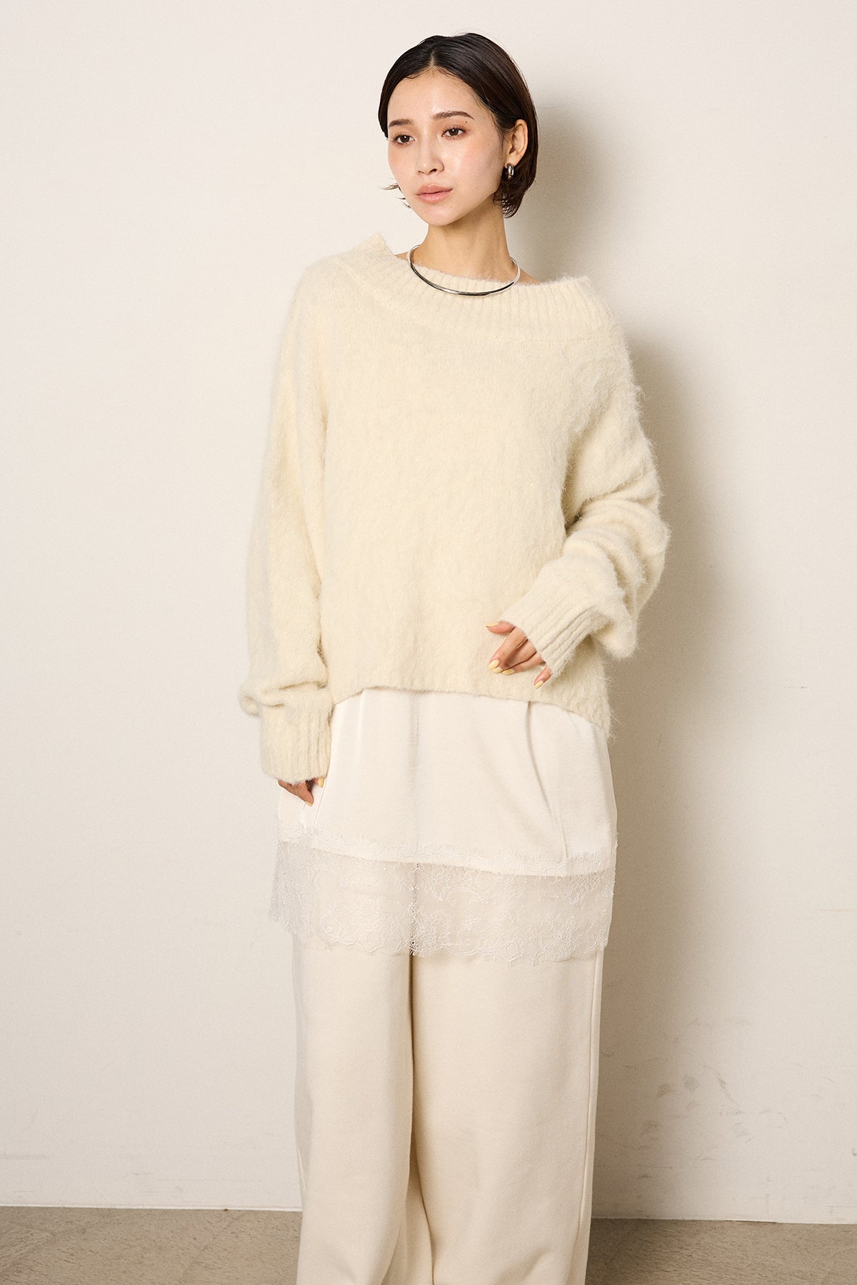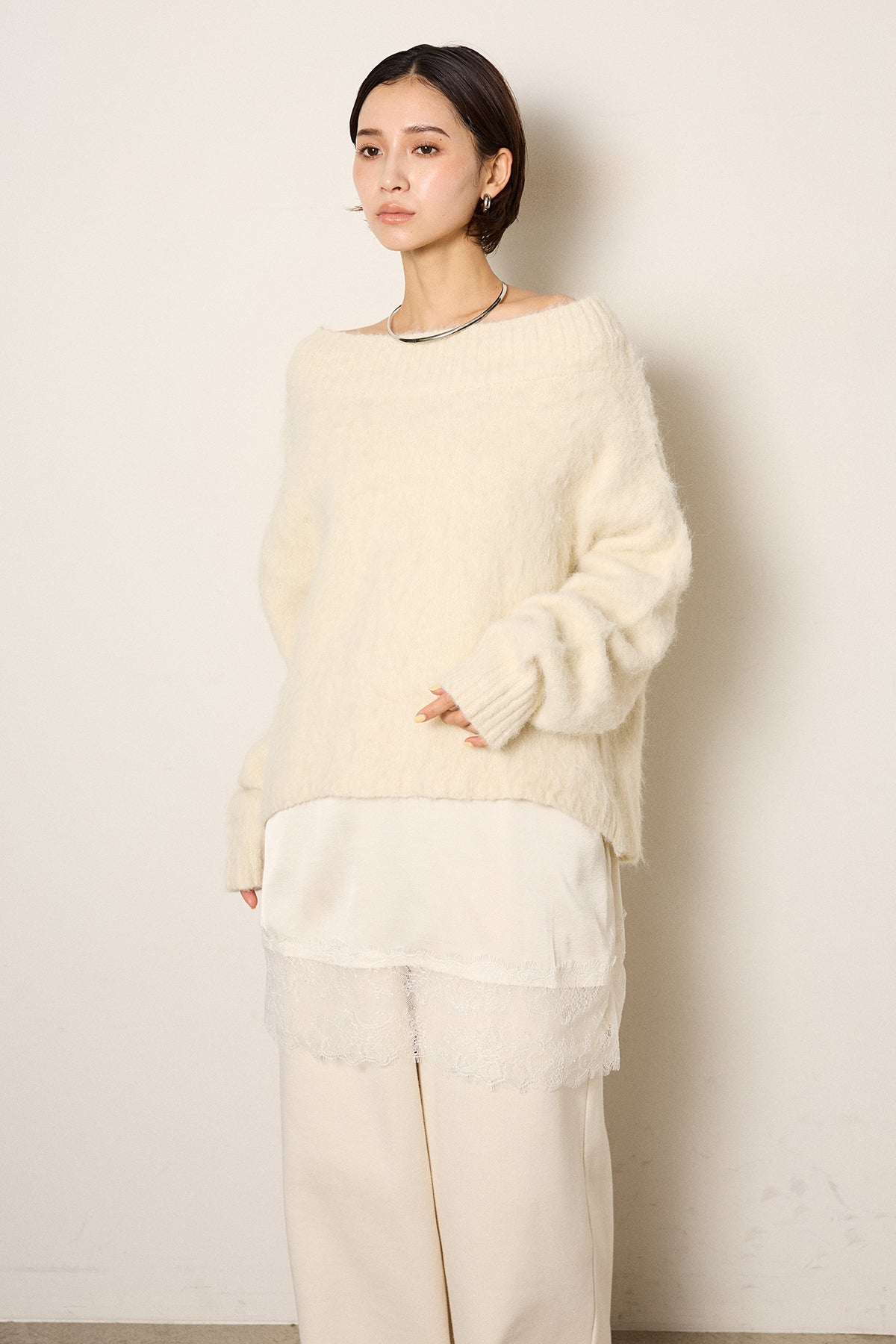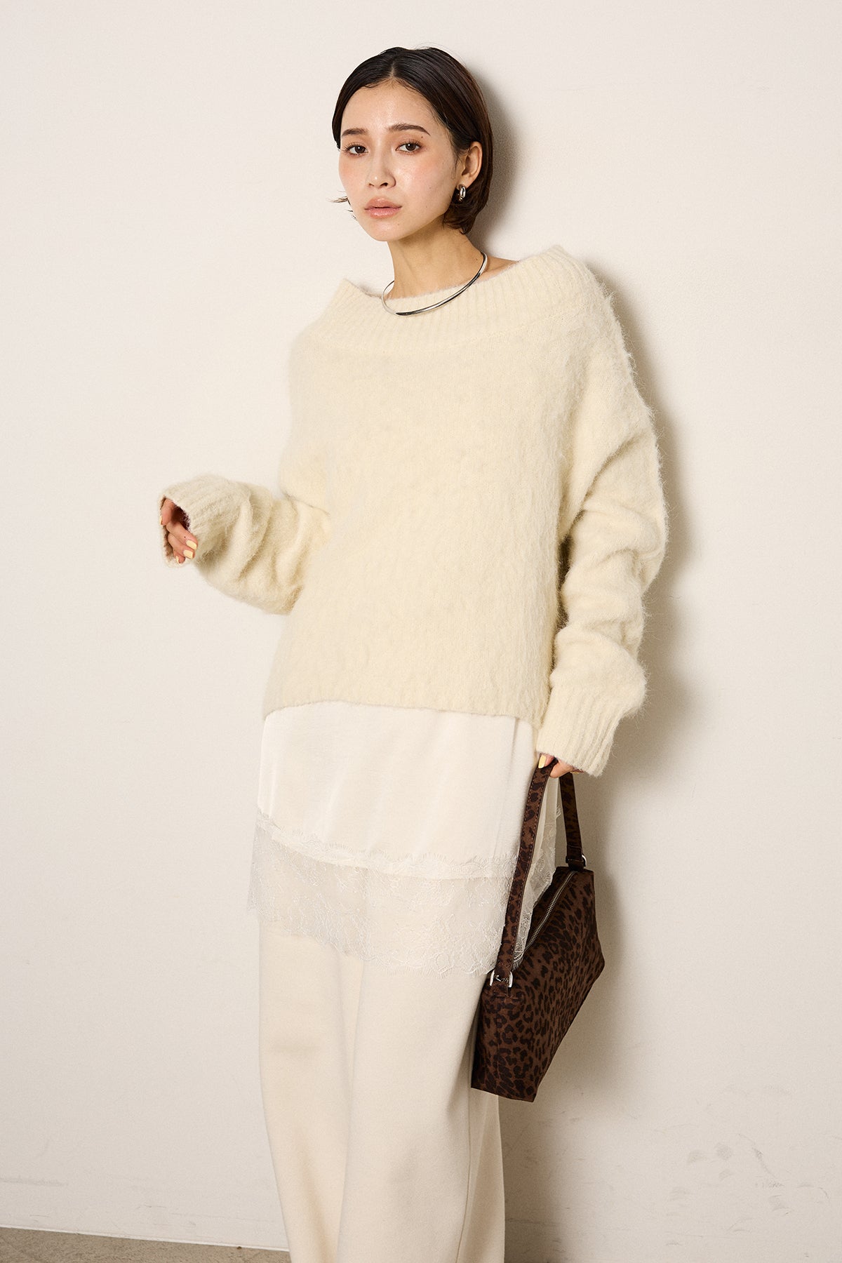 ふんわりとした風合いが魅力のアルパカタッチニット。肩のラインをゆるっと落としたオフショルシルエットが、抜け感のあるバランスをつくります。やわらかい編地が軽やかに体を包み込み、リラックスムード漂う佇まいに。ロング丈のインナーやワイドパンツとも合わせやすく、シンプルながら雰囲気のあるスタイルを楽しめる一枚です。