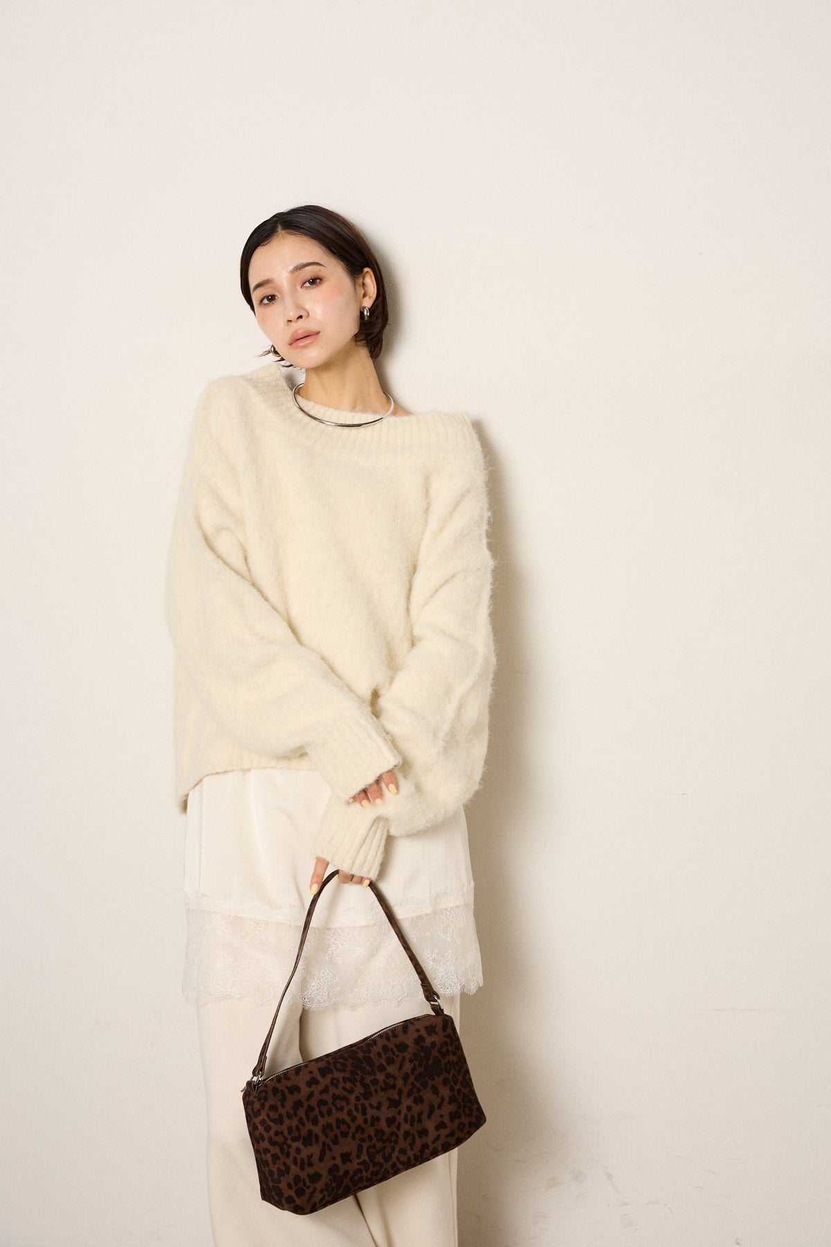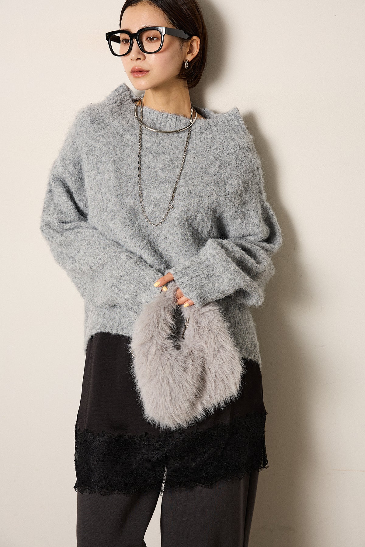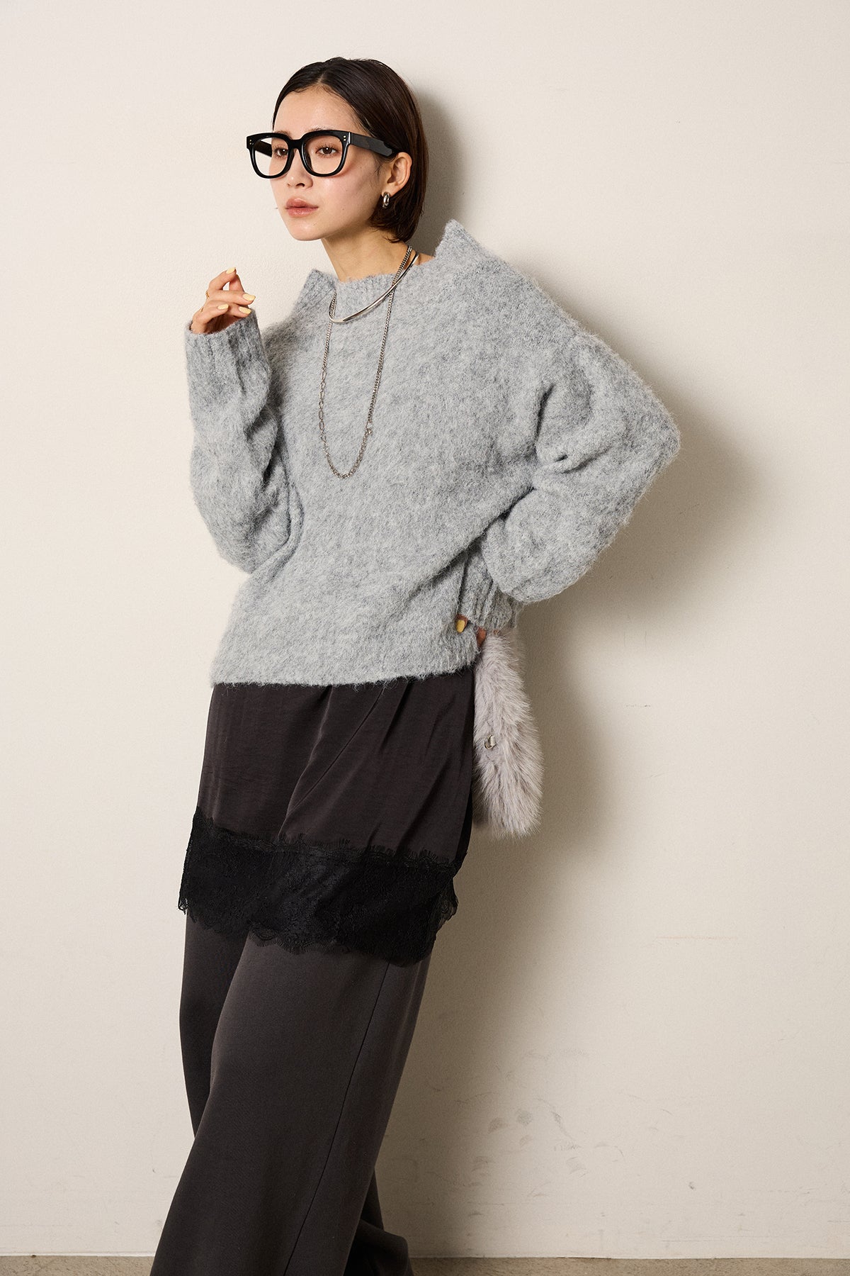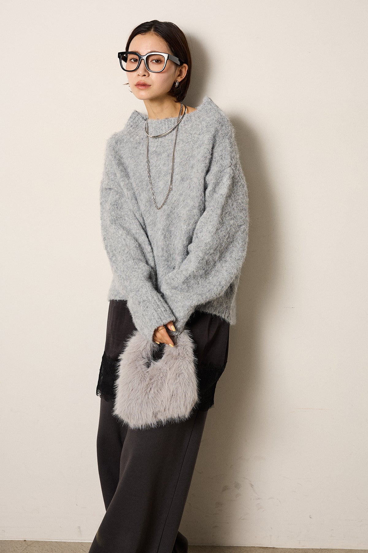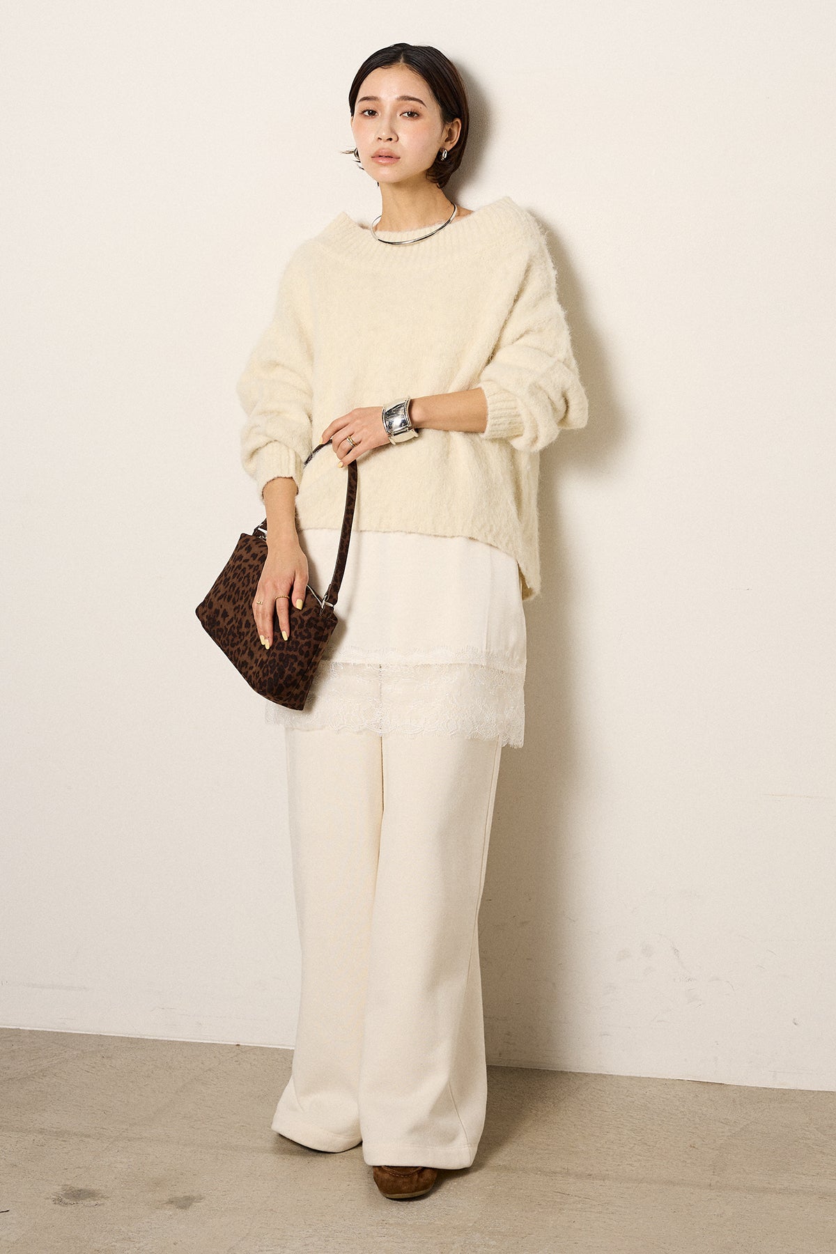 ふんわりとした風合いが魅力のアルパカタッチニット。肩のラインをゆるっと落としたオフショルシルエットが、抜け感のあるバランスをつくります。やわらかい編地が軽やかに体を包み込み、リラックスムード漂う佇まいに。ロング丈のインナーやワイドパンツとも合わせやすく、シンプルながら雰囲気のあるスタイルを楽しめる一枚です。